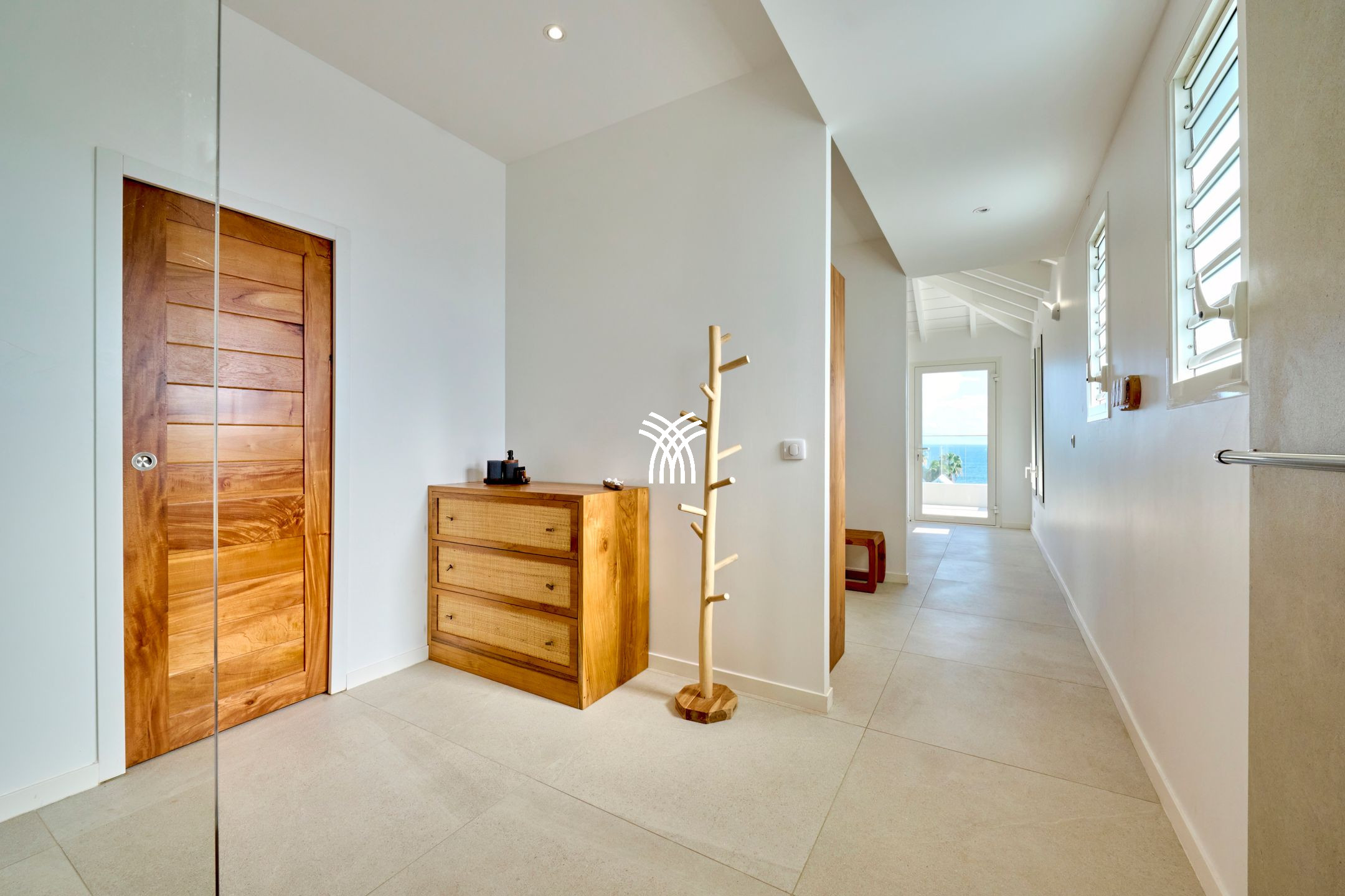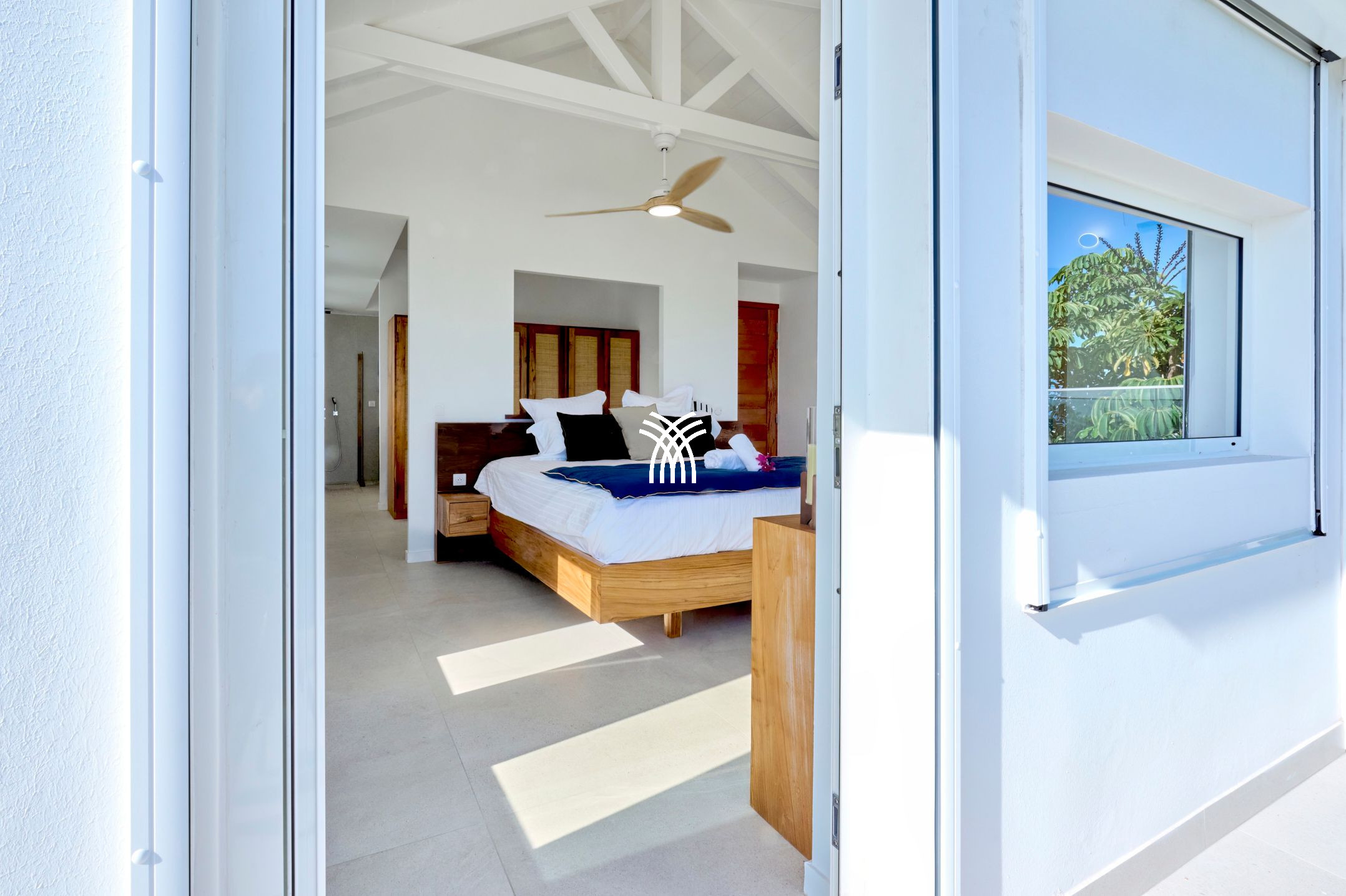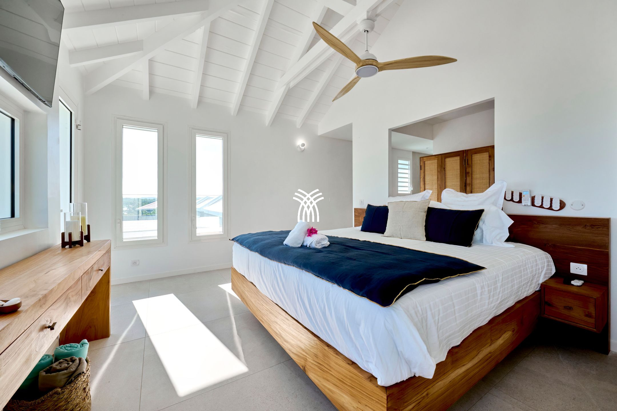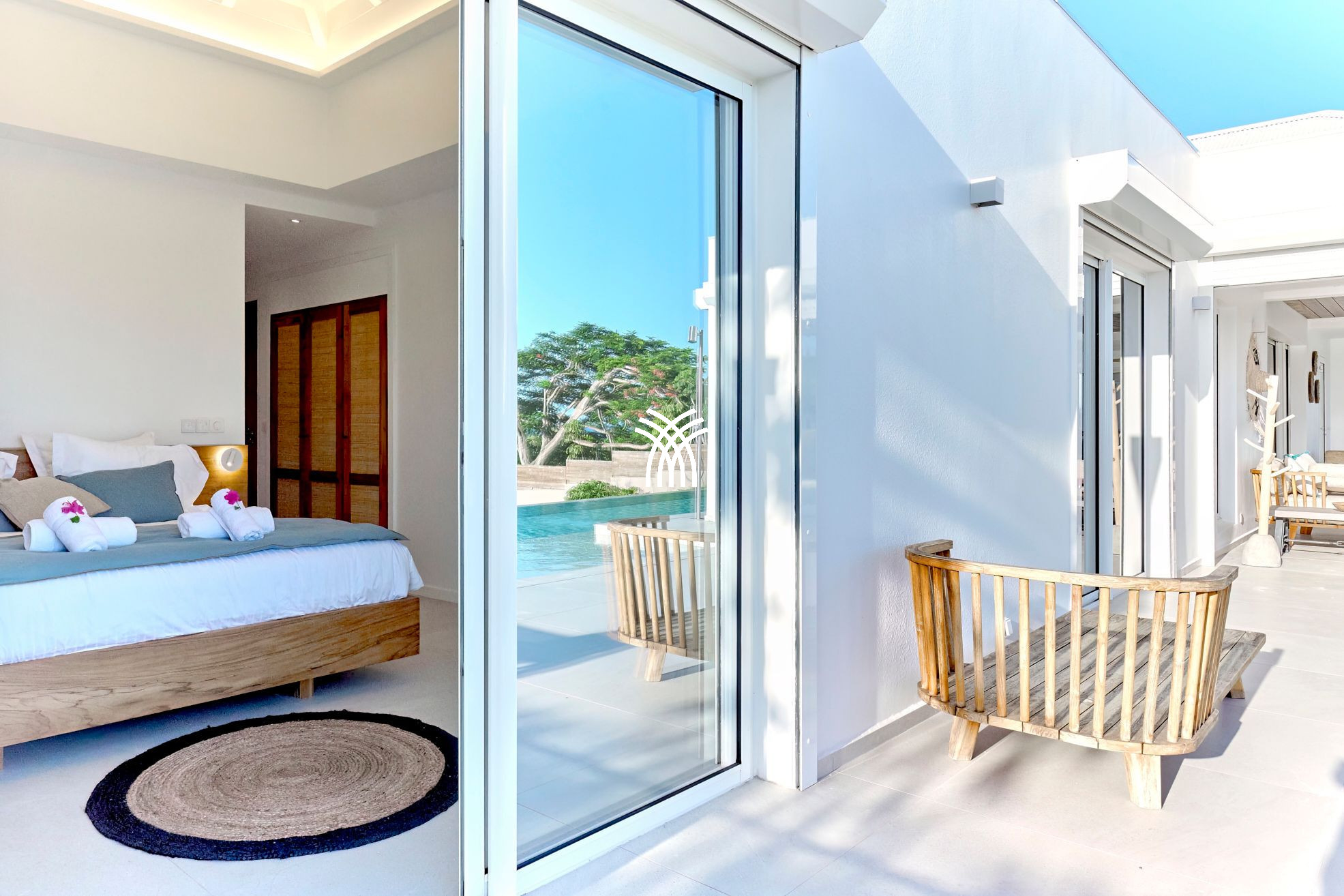 Outside, the swimming pool dominates the marine landscape and becomes the vibrant heart of the villa. Days unfold between sunbathing, naps in the shade of palm trees, gourmet moments around a barbecue and soft evenings lulled by the trade winds. The tropical garden offers an enchanting setting where the scents of local flowers mingle with the discreet sound of the sea. The whole forms a place where one reconnects with the essential, in the purest tradition of luxury villa rentals in Sainte-Anne.