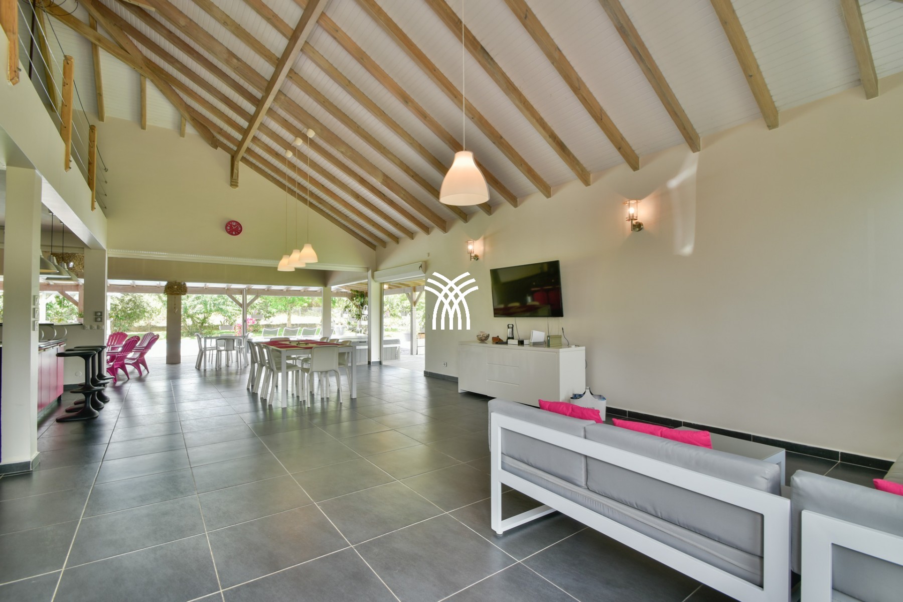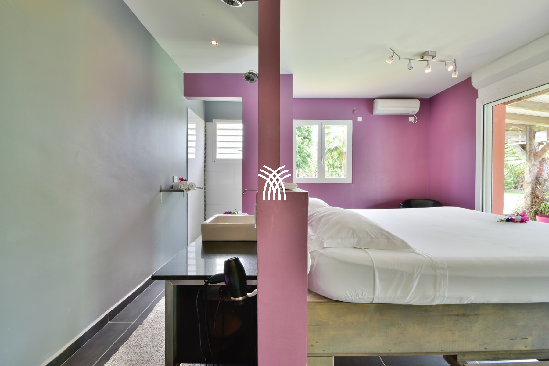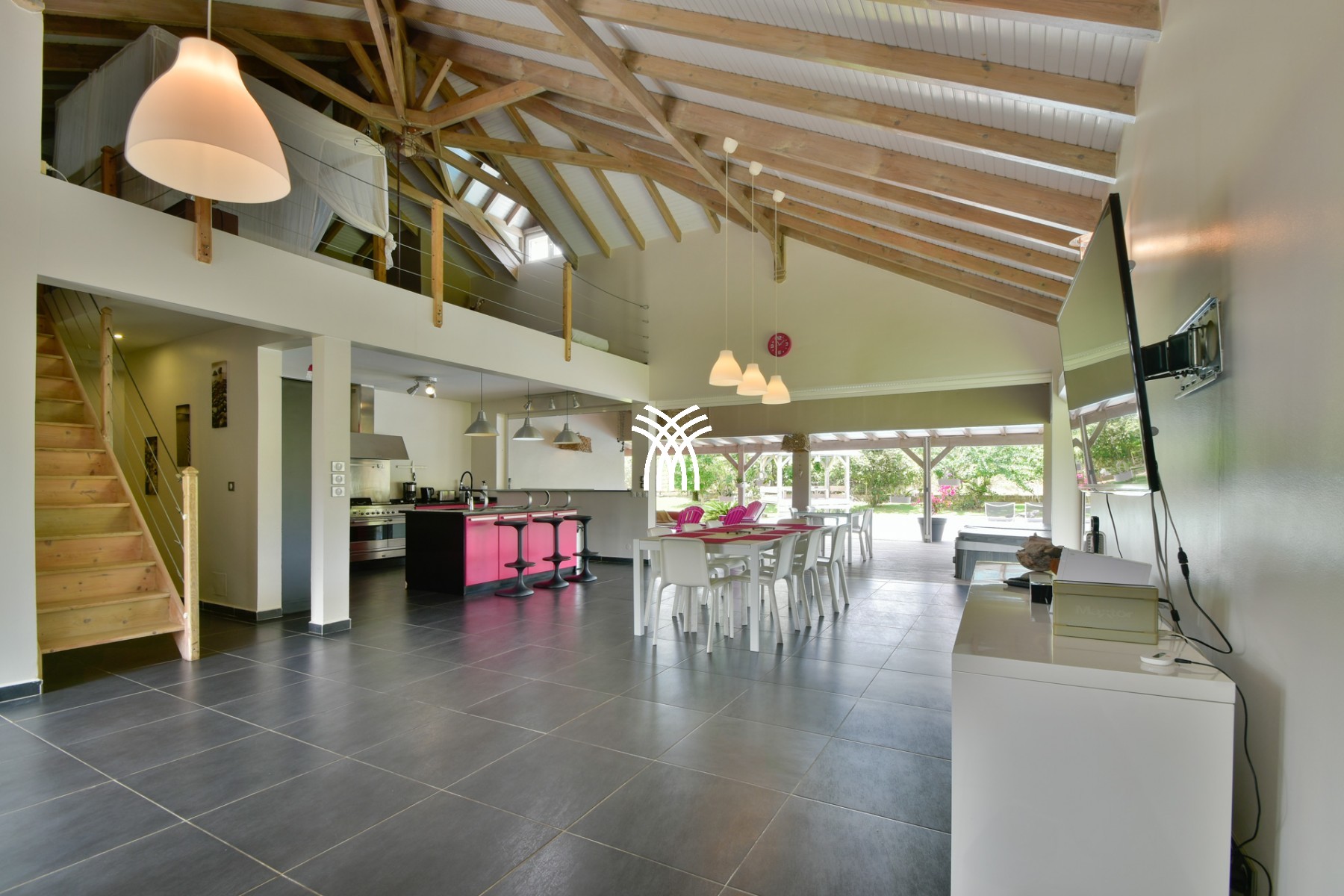 Villa Zen Guadeloupe has 4 bedrooms with 4 private bathrooms, cleverly arranged in three modules. A living room including a TV lounge, a spacious kitchen, a dining room, all opening onto a large terrace with an infinity pool overlooking the ocean. A sleeping area accessed via a gallery, with a master suite on the ground floor, two bedrooms with balconies upstairs, each with a bathroom, and a bungalow which is completely independent. The latter with exterior access, has a queen-size bed on the mezzanine level, on the ground floor, a sofa bed that can be separated into 2 single beds for 2 children, a dressing room and a bathroom.