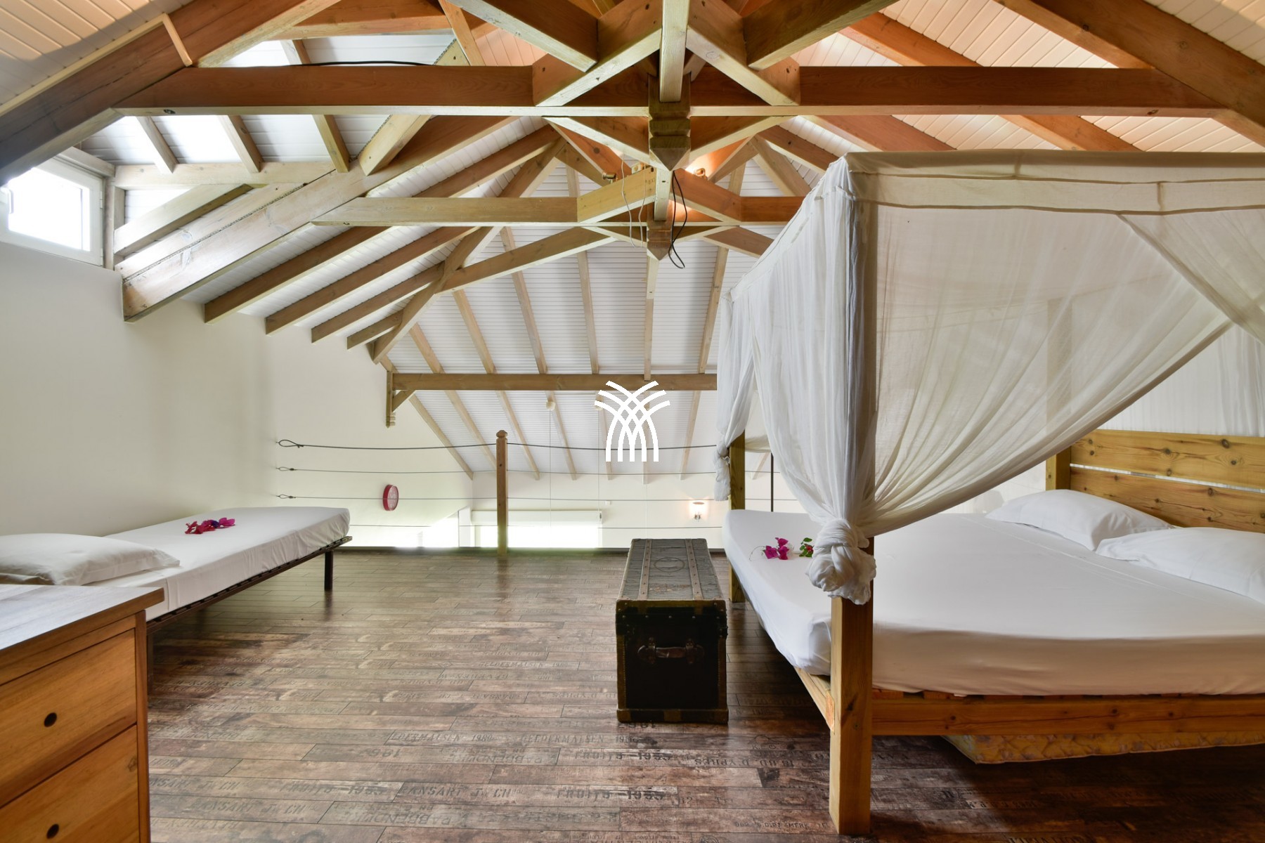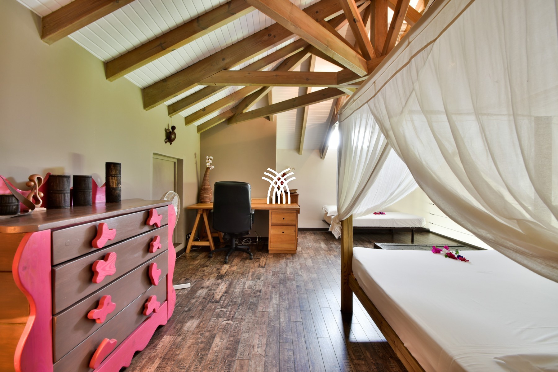 Queen size bed (160 x 200m) with mosquito net, 1 sofa bed (2 mattresses 80 cm wide) suitable for children, air conditioning, bathroom with shower and WC, dressing room, chest of drawers