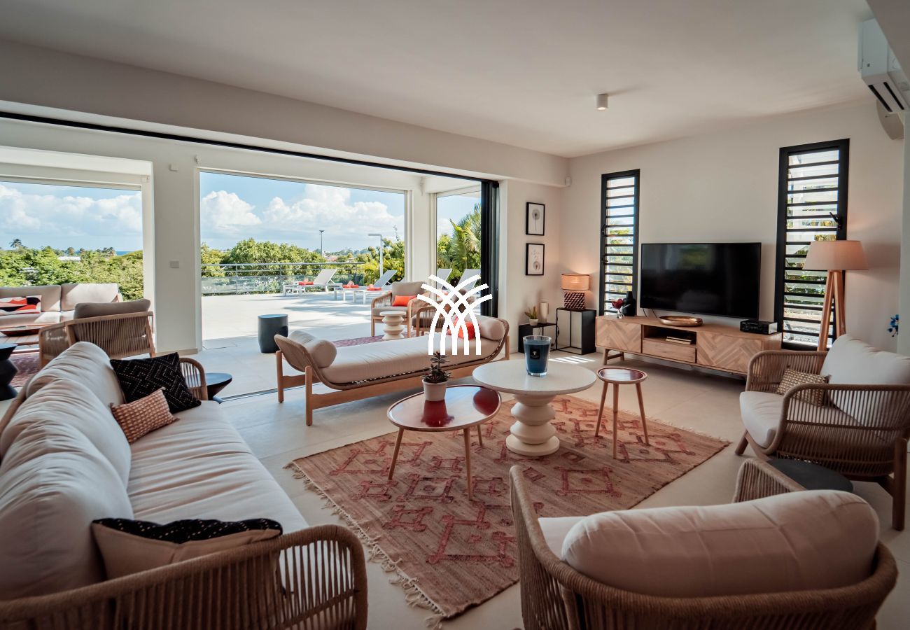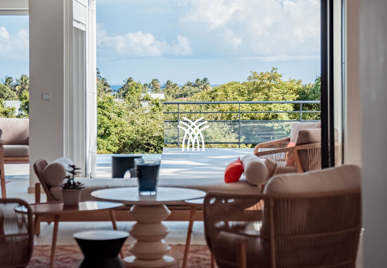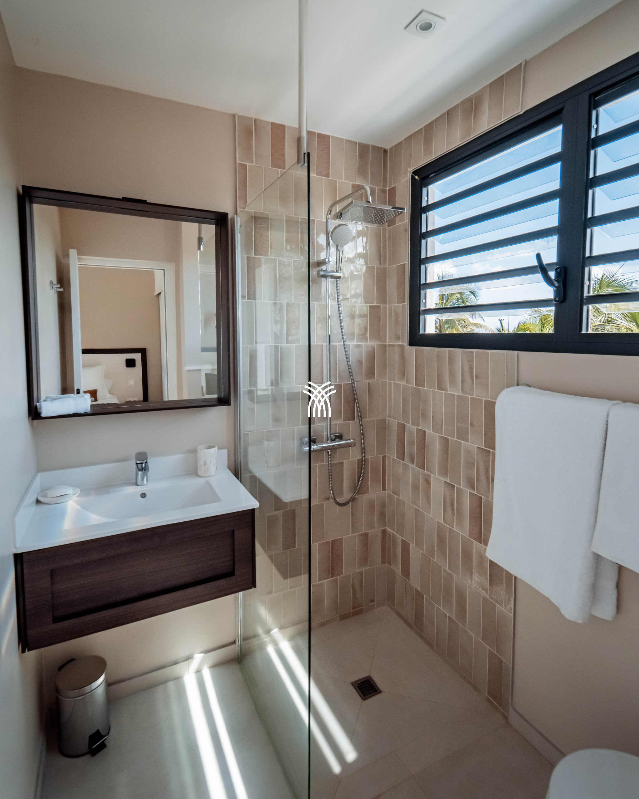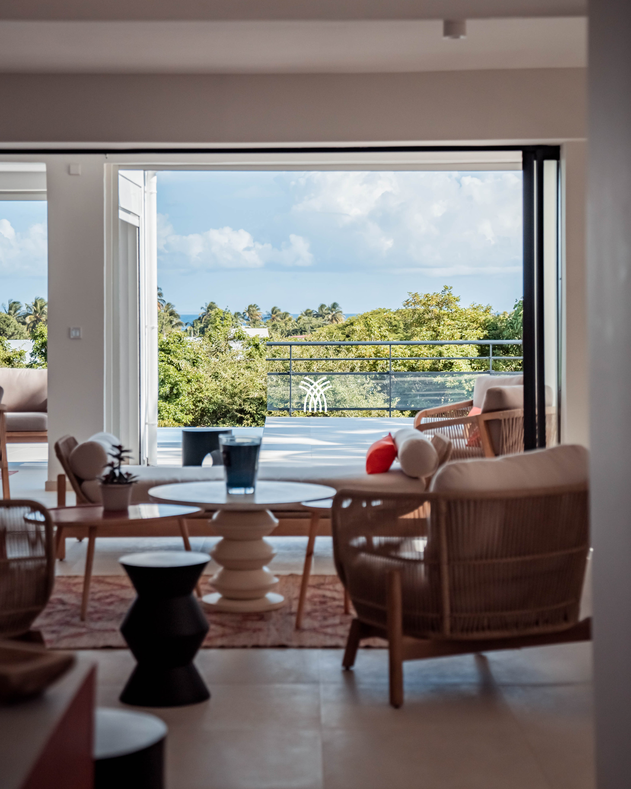 The exteriors of Villa Coco Kafé are a true paradise for relaxation. From the terrace, admire an unobstructed view of the sea while relaxing on sunbeds or on the sofa under the carbet, a space conducive to moments of conviviality or absolute serenity. Each sunset becomes an unforgettable natural spectacle.