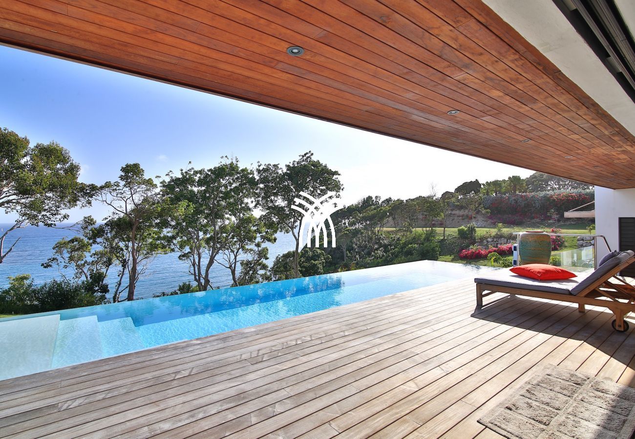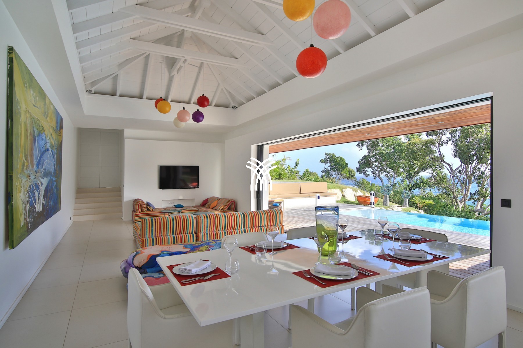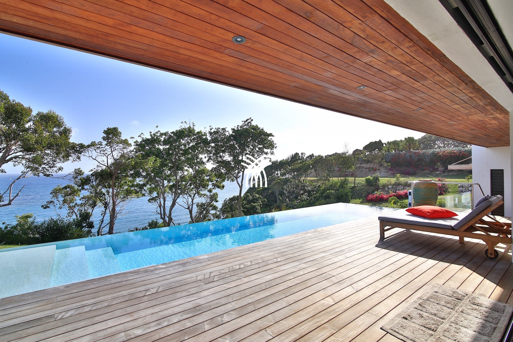 Calm is everywhere, air circulates through the high blinds. Wherever you are, the eye is constantly drawn to the clear blue of the swimming pool and the deeper blue of the sea.