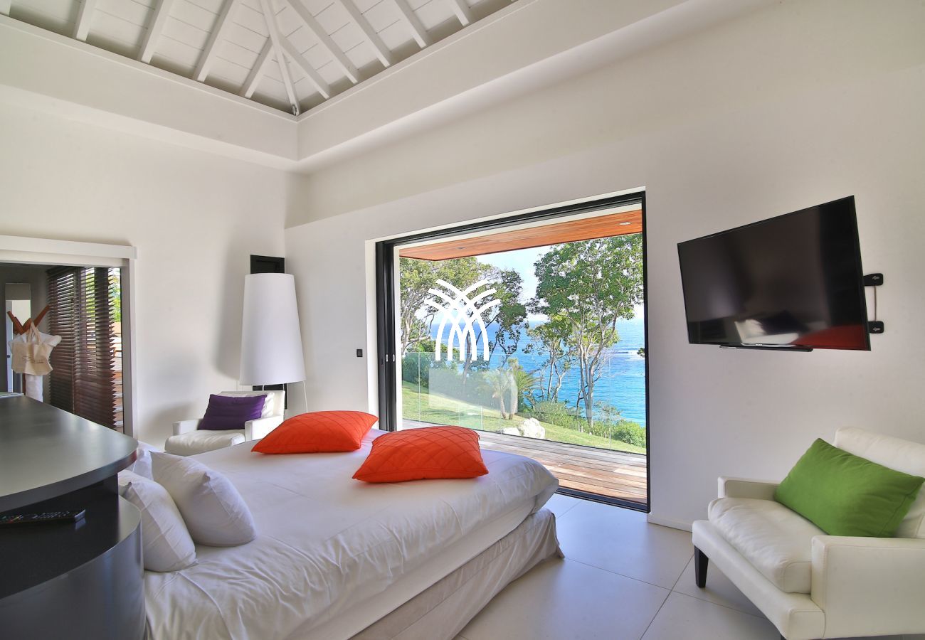 Villa Zen Guadeloupe has 4 bedrooms with 4 private bathrooms, cleverly arranged in three modules. A living room including a TV lounge, a spacious kitchen, a dining room, all opening onto a large terrace with an infinity pool overlooking the ocean. A sleeping area accessed via a gallery, with a master suite on the ground floor, two bedrooms with balconies upstairs, each with a bathroom, and a bungalow which is completely independent. The latter with exterior access, has a queen-size bed on the mezzanine level, on the ground floor, a sofa bed that can be separated into 2 single beds for 2 children, a dressing room and a bathroom.