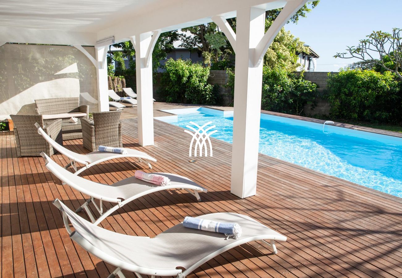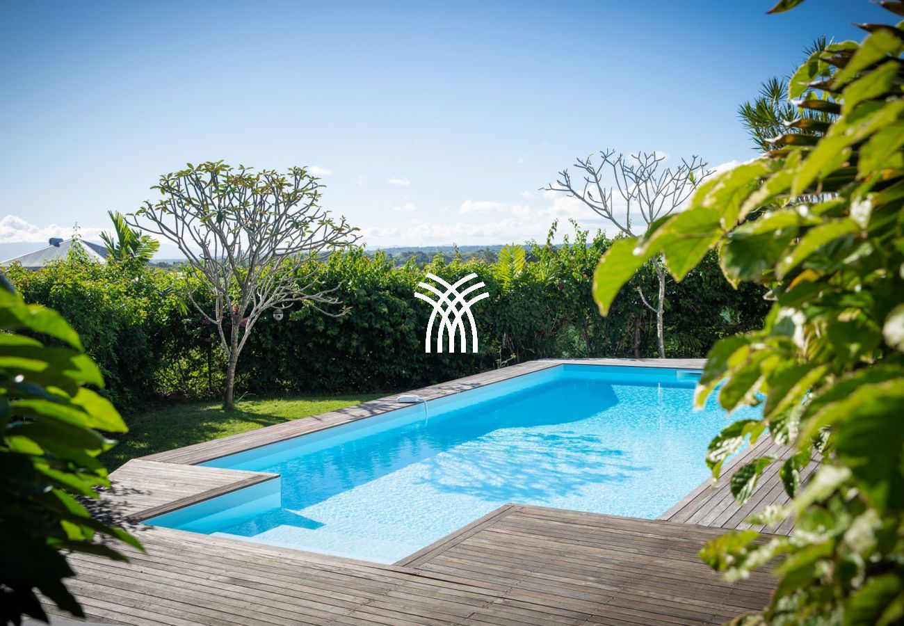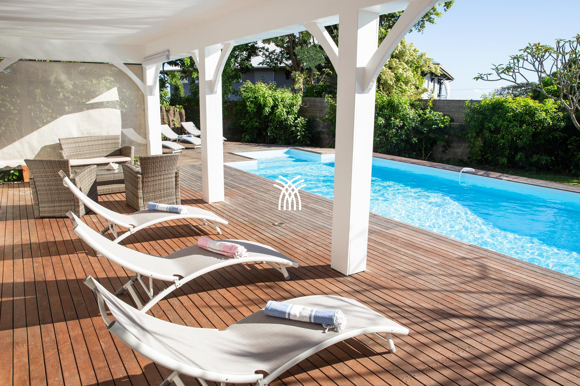 The exteriors of Villa Vanilla are designed for relaxation and pleasure. A large wooden terrace, half-shaded half-sun, features sunbeds for lounging, while a salt-water pool surrounded by a deck offers a soothing and luxurious atmosphere. The carbet, located near the pool, is perfect for convivial moments, while the first-floor terrace offers a peaceful refuge to admire the panorama.