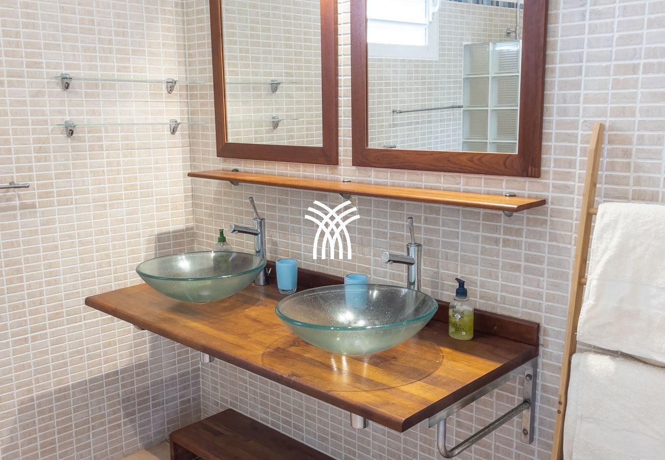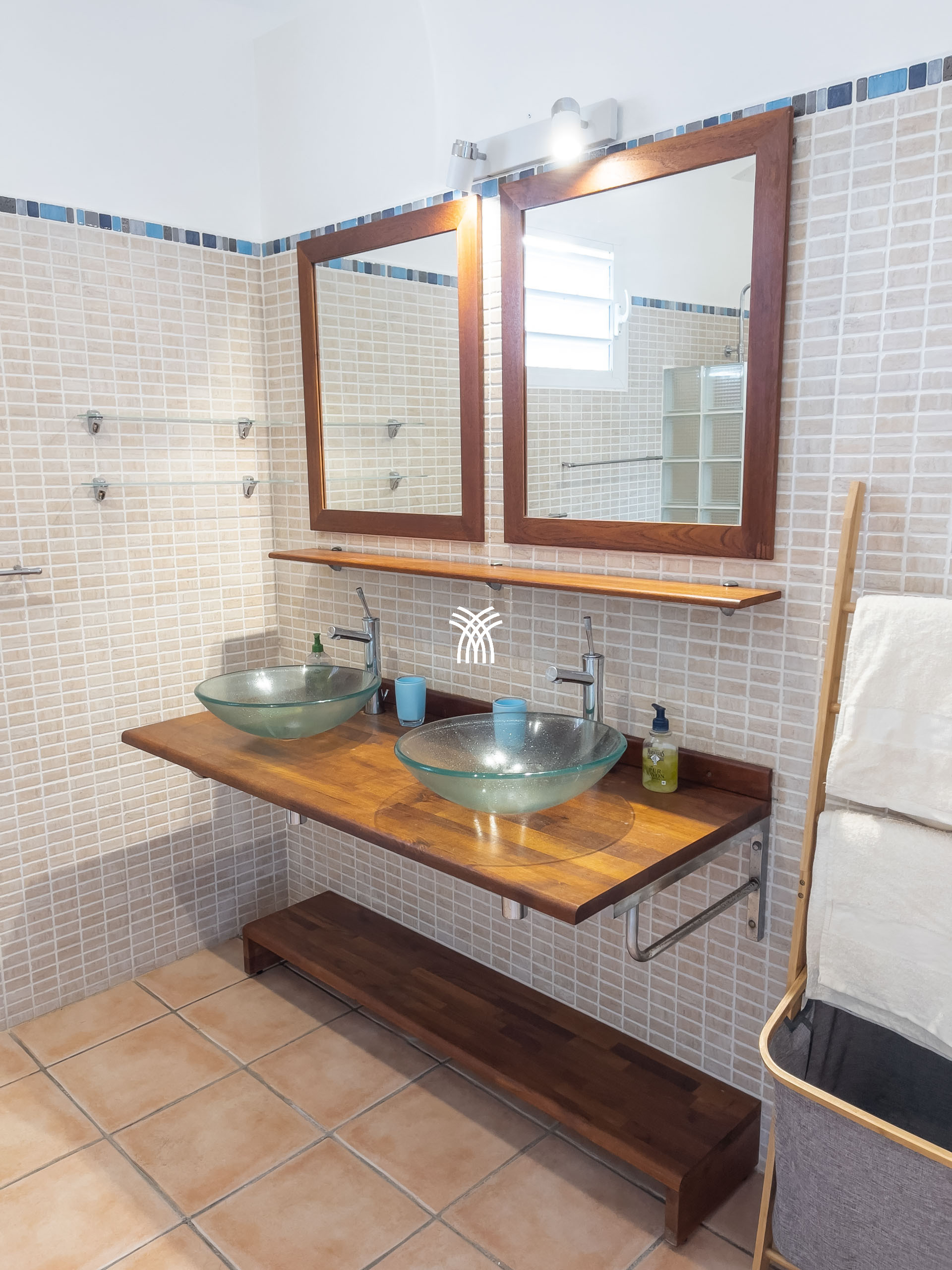 Villa Zen Guadeloupe has 4 bedrooms with 4 private bathrooms, cleverly arranged in three modules. A living room including a TV lounge, a spacious kitchen, a dining room, all opening onto a large terrace with an infinity pool overlooking the ocean. A sleeping area accessed via a gallery, with a master suite on the ground floor, two bedrooms with balconies upstairs, each with a bathroom, and a bungalow which is completely independent. The latter with exterior access, has a queen-size bed on the mezzanine level, on the ground floor, a sofa bed that can be separated into 2 single beds for 2 children, a dressing room and a bathroom.