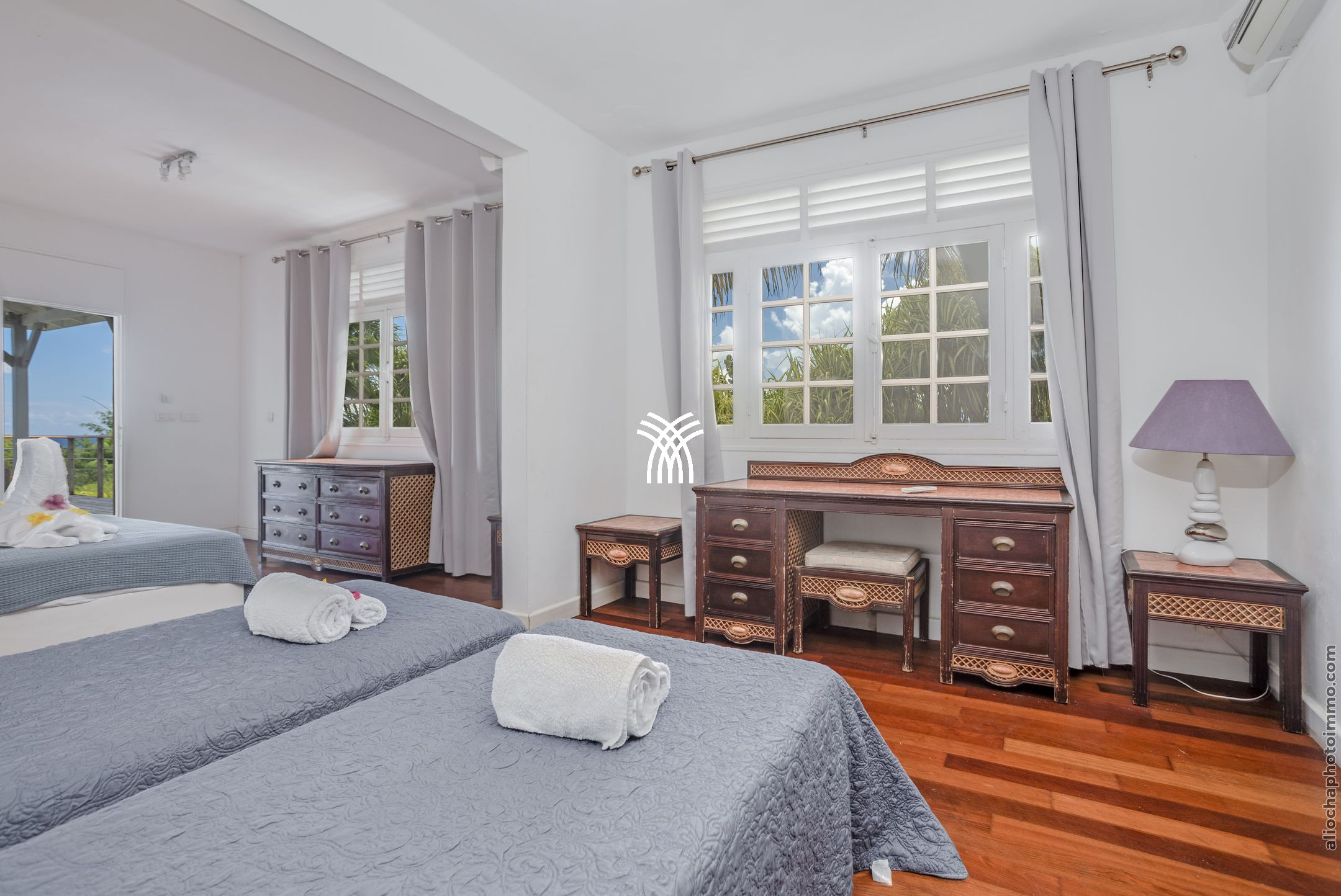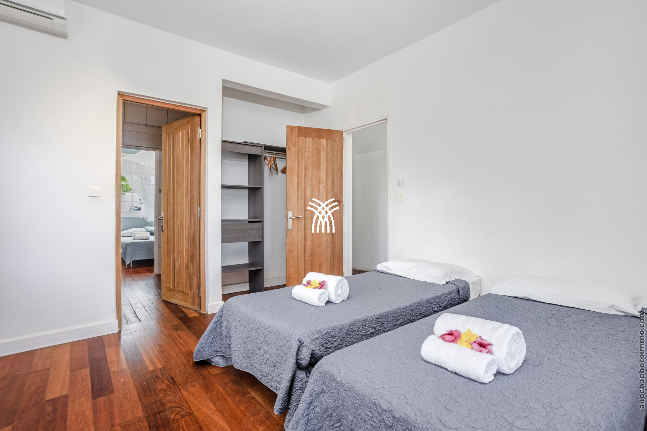 Twin beds (2x90x190) + baby bed, air conditioning, dressing, bathroom with shower and toilet shared with BR 3