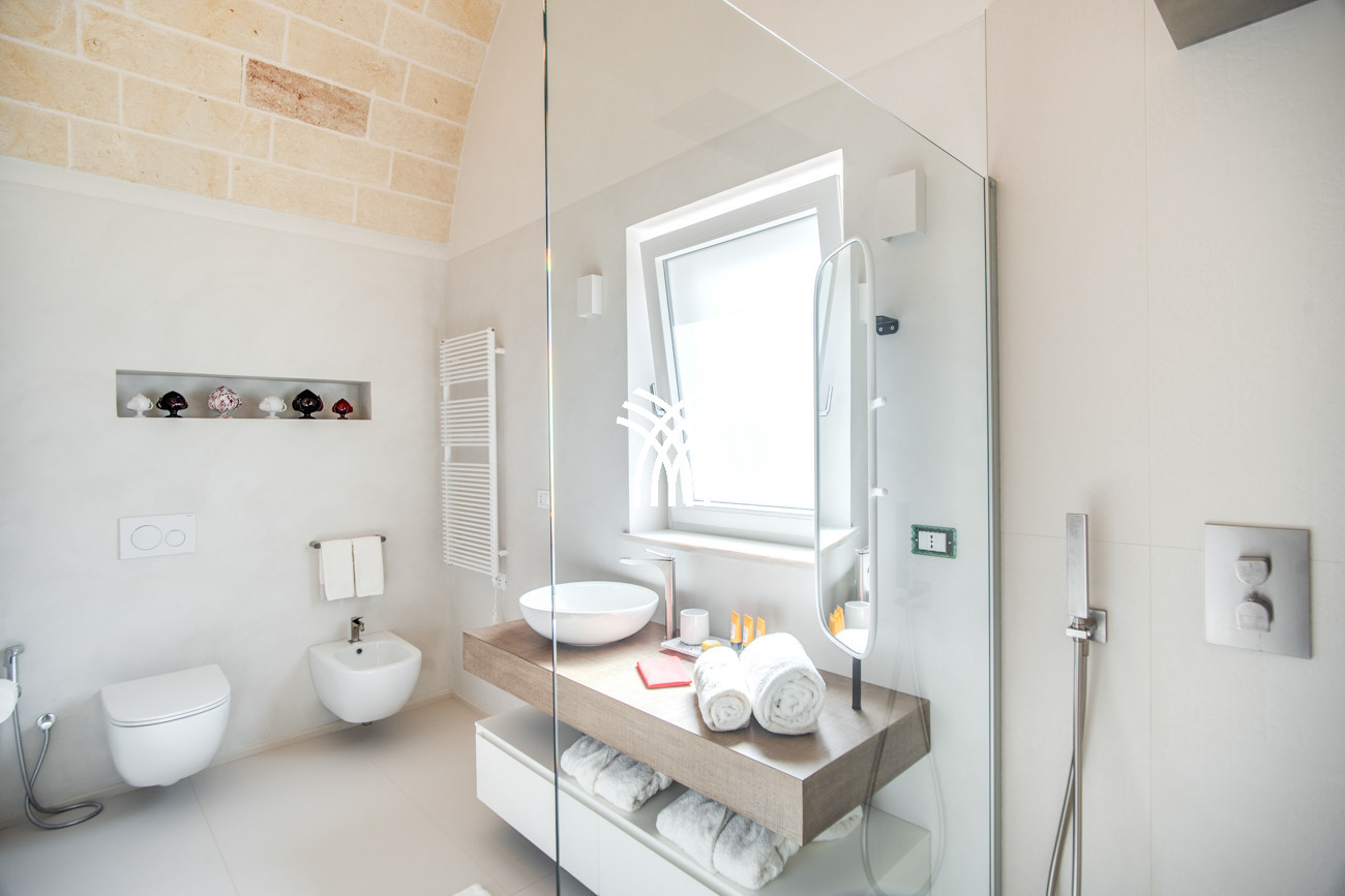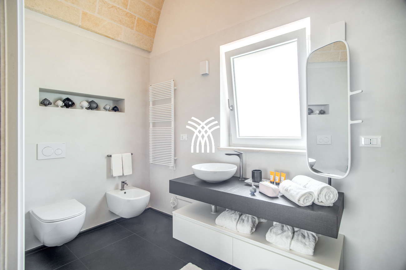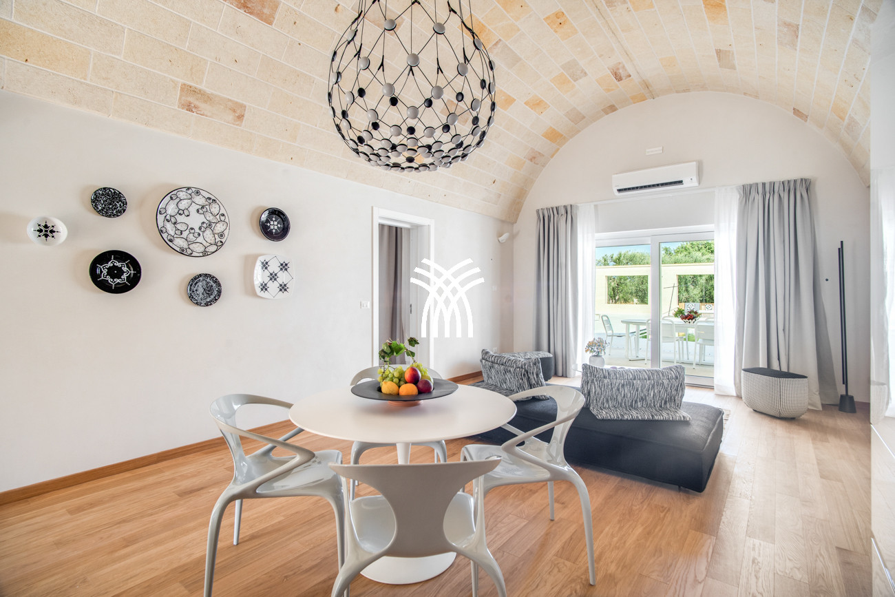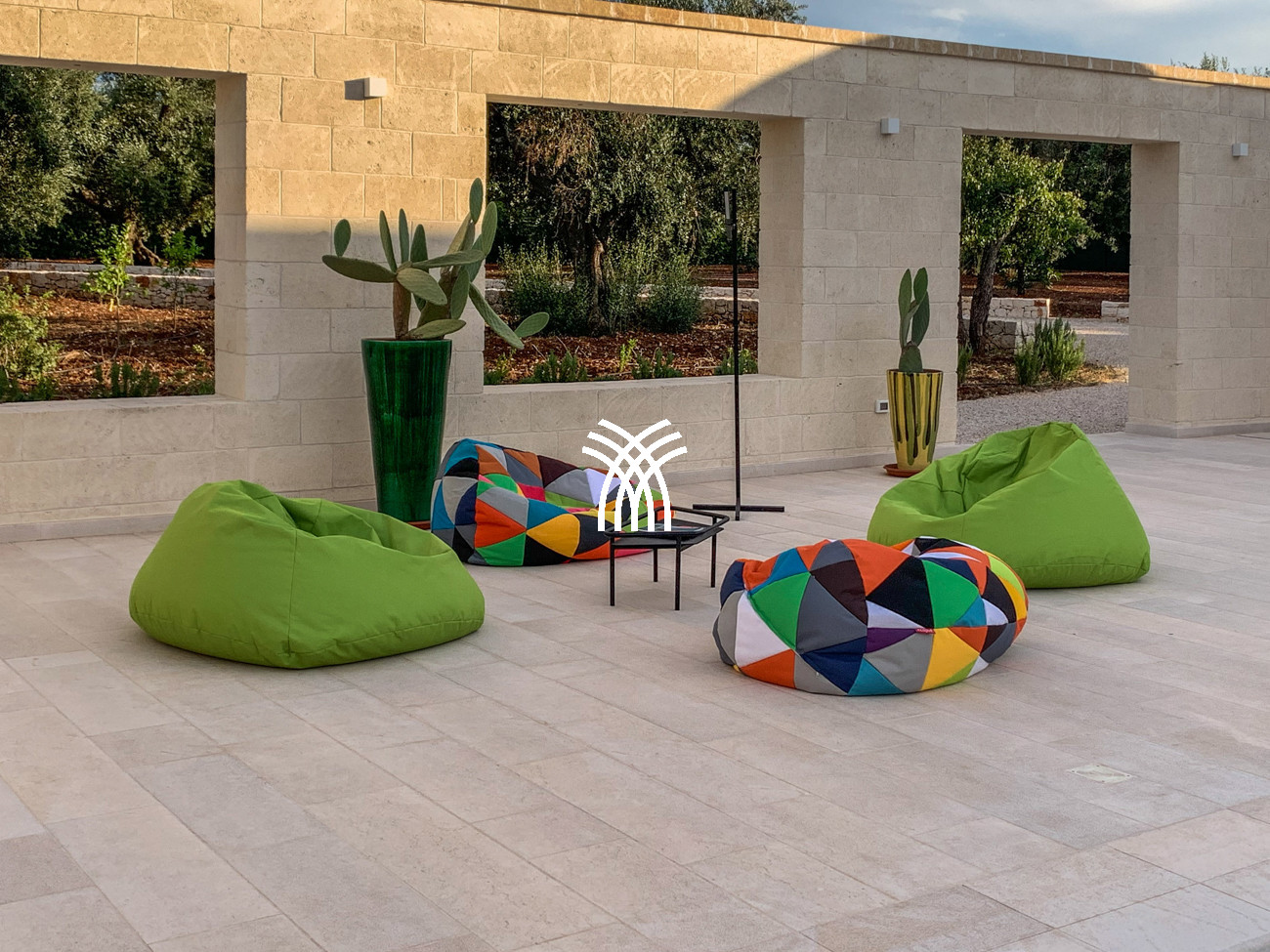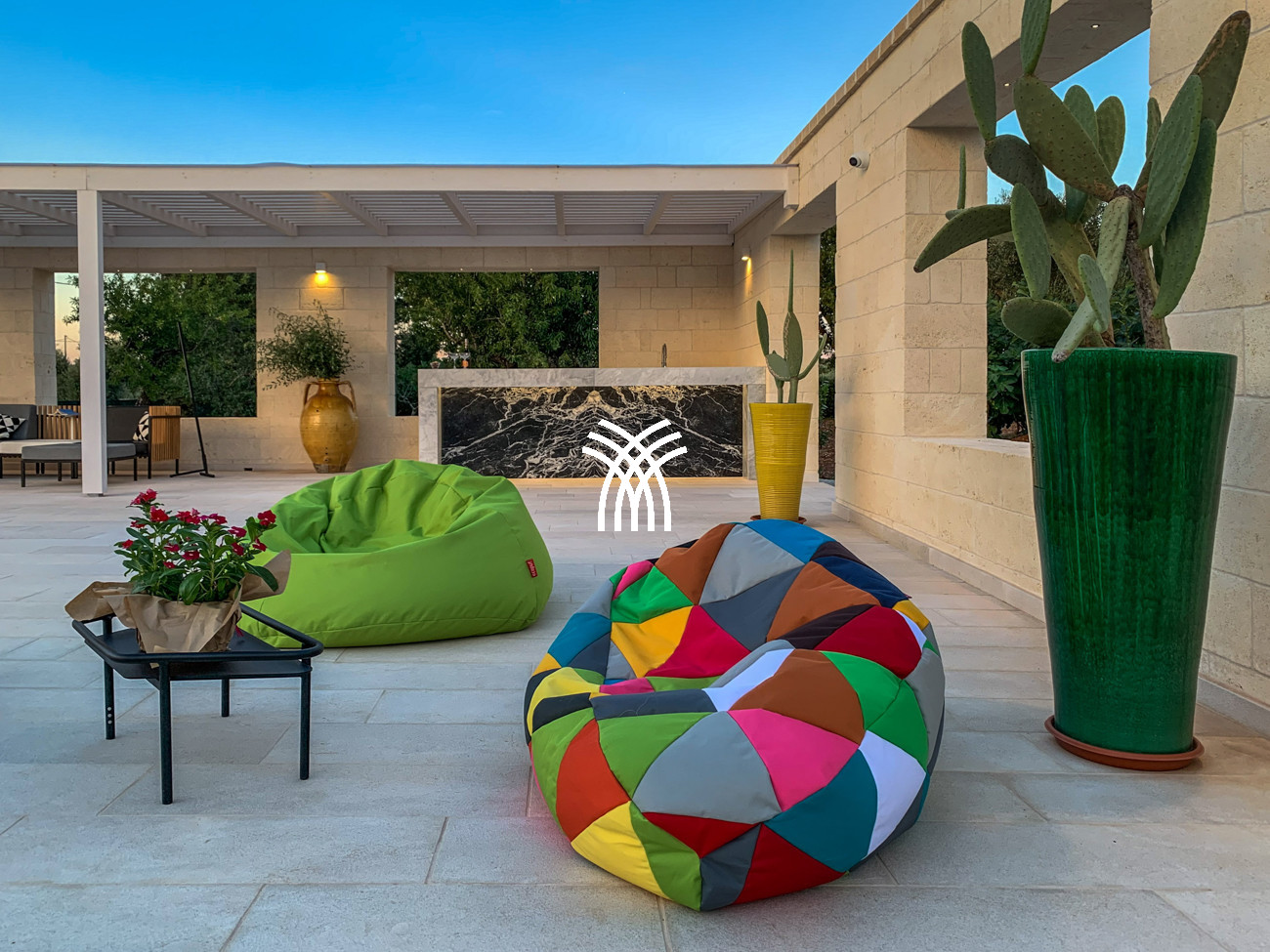 Villa Jehudiel’s outdoor setting is a private oasis immersed in Mediterranean maquis, with over 300 trees ranging from ancient olive to pomegranate, citrus, fig, and almond. A hidden trullo—an ancient dry-stone structure recognized by UNESCO—adds a sense of heritage and wonder to the landscape. At the heart of the grounds is a luxurious pool area with a mosaic-lined, heated hydromassage swimming pool. A marble-clad bar and lounge space with plush seating, sun umbrellas, and a hi-fi stereo system create an ideal atmosphere for sunbathing, entertaining, or sipping cocktails under the southern sky.