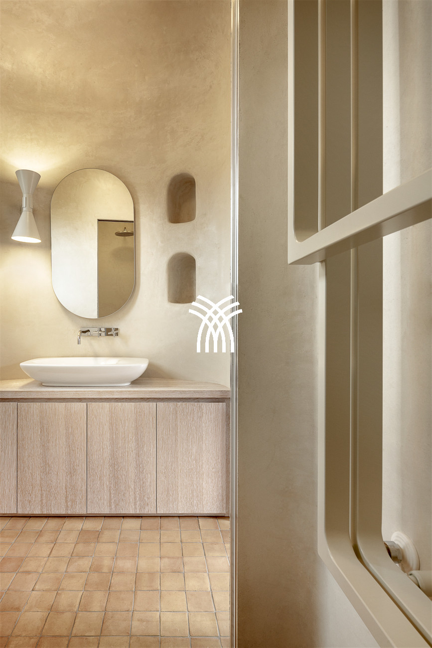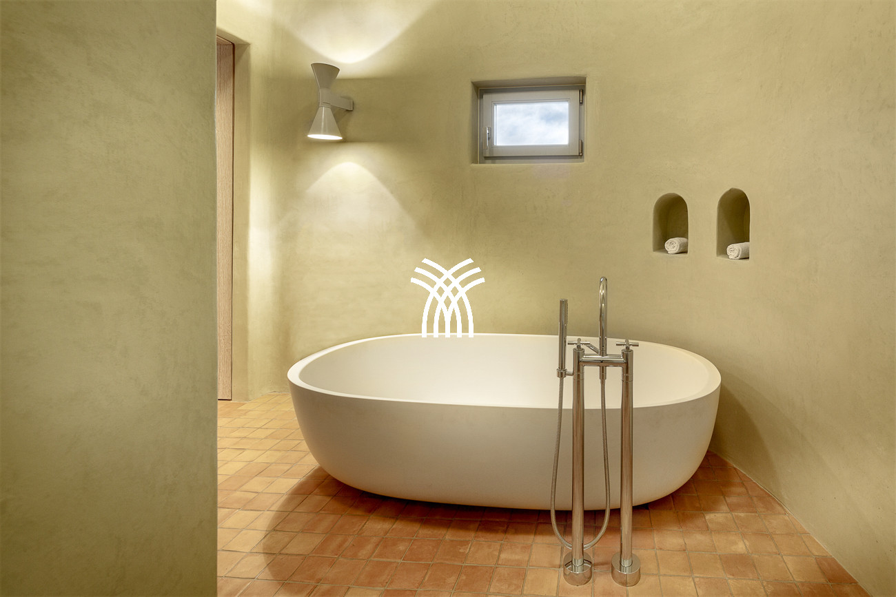 As the largest of the Is Molas resort villas available for rent, the estate is surrounded by an impeccably maintained 1,300 m² garden and enhanced by an impressive 100 m² swimming pool, together with multiple outdoor patios, furnished terraces, and secluded relaxation areas designed for long Mediterranean days and elegant evenings under the open sky. The property is composed of four independent buildings arranged to ensure both convivial gathering spaces and absolute privacy. The main residence hosts the welcoming living area, the kitchen, and two double bedrooms with en suite bathrooms, one of which enjoys direct access to the terrace. The remaining structures accommodate an additional double bedroom with en suite bathroom, two single bedrooms each with their own en suite facilities, and a fitness room overlooking the swimming pool and the beautifully landscaped garden.