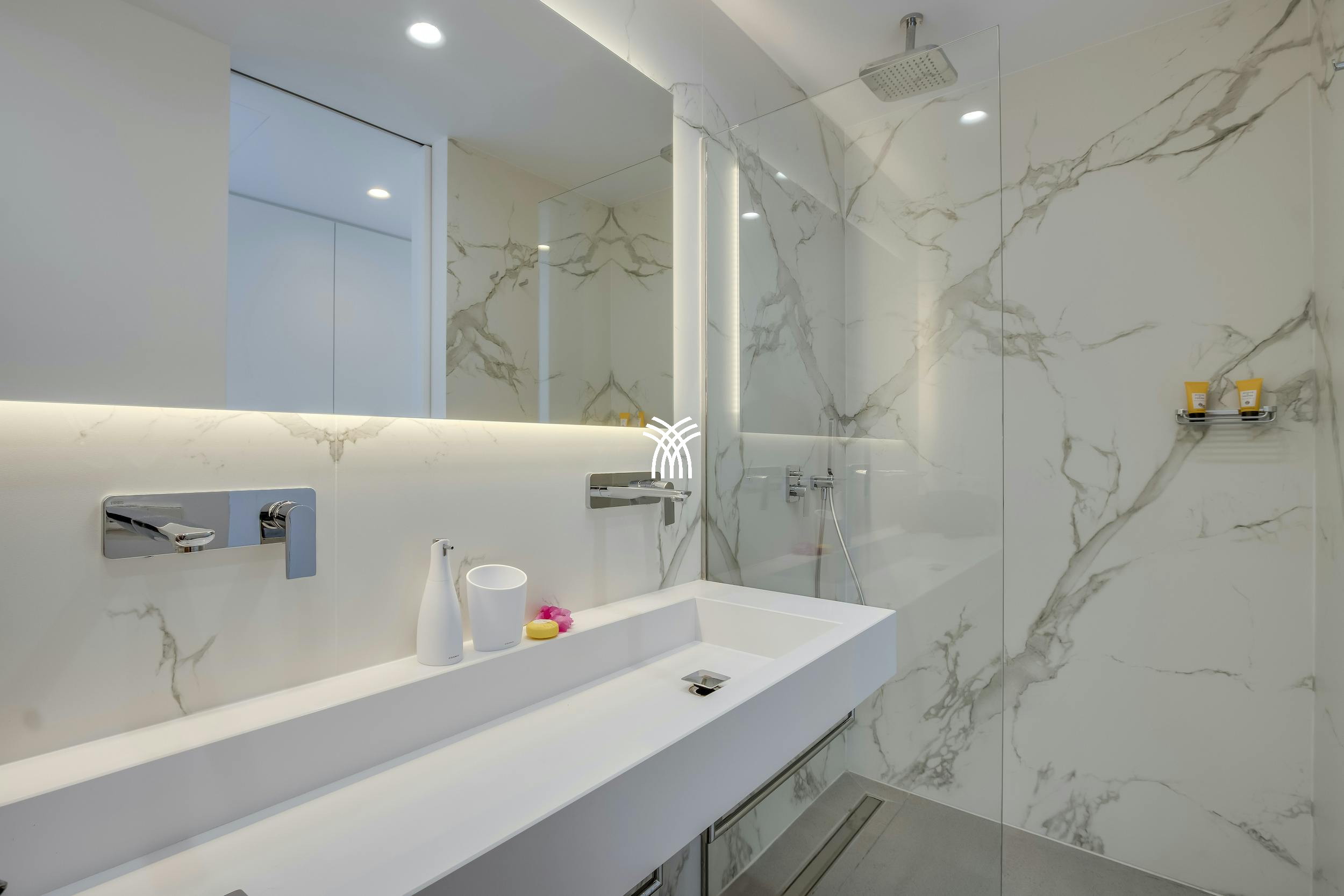 Outside, the villa is surrounded by pristine landscaped gardens that feature cascading waterfalls, serene water mirrors, and an awe-inspiring infinity pool that seems to spill into the horizon. The spacious sun terrace is lined with designer loungers, chill-out beds, and an expansive outdoor dining area complete with a gas barbecue—an ideal setting for relaxing in the sun or hosting unforgettable evenings.
