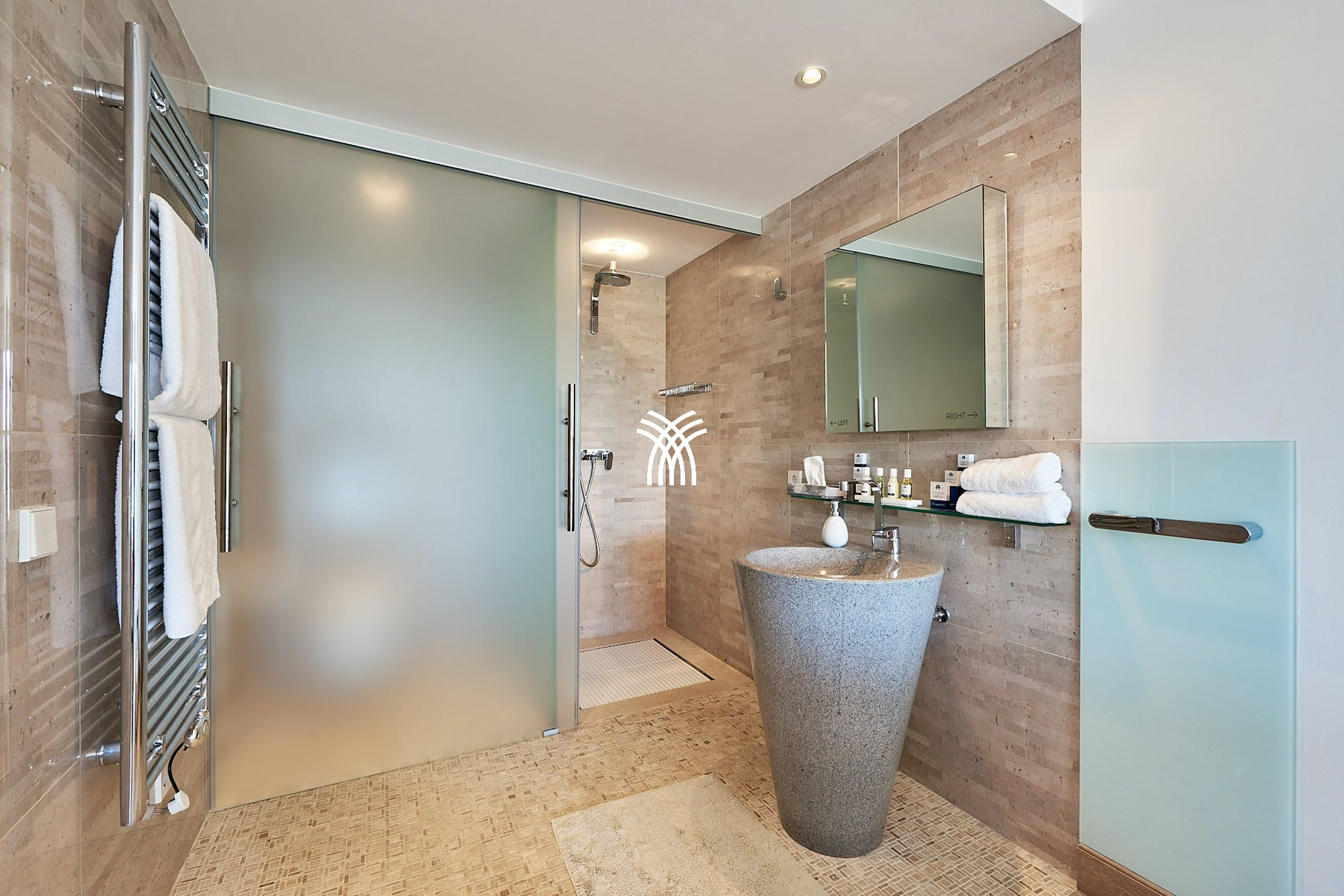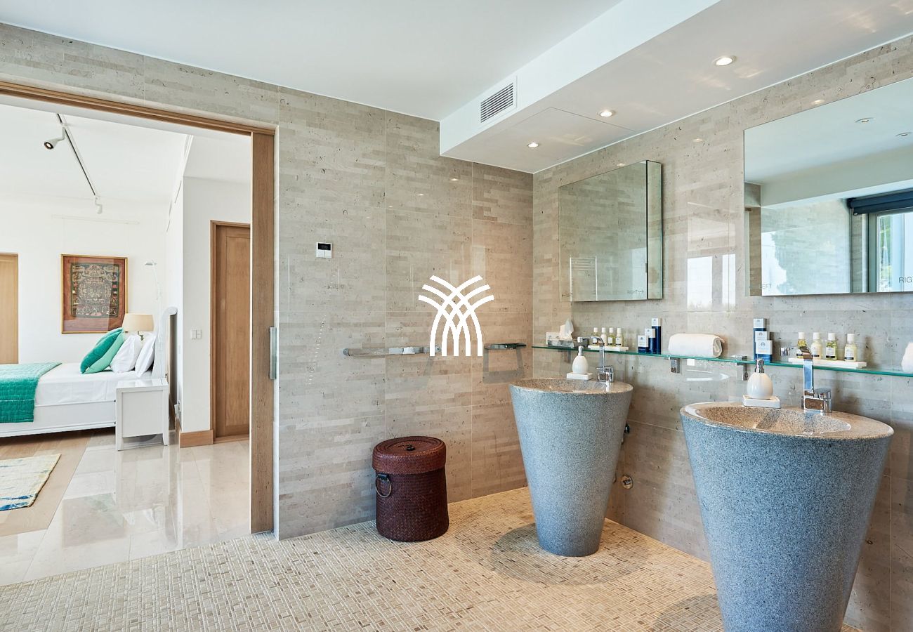 Outside, the villa is surrounded by pristine landscaped gardens that feature cascading waterfalls, serene water mirrors, and an awe-inspiring infinity pool that seems to spill into the horizon. The spacious sun terrace is lined with designer loungers, chill-out beds, and an expansive outdoor dining area complete with a gas barbecue—an ideal setting for relaxing in the sun or hosting unforgettable evenings.