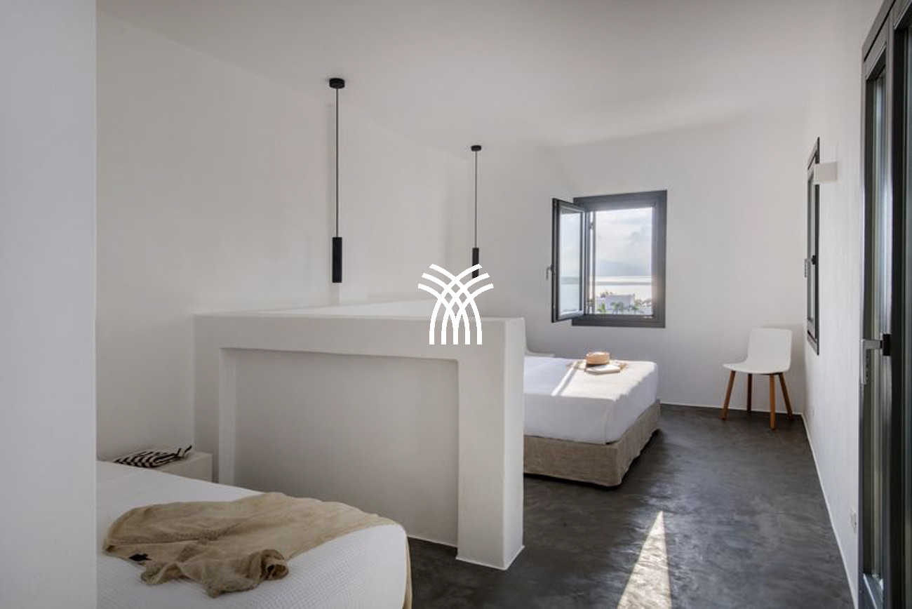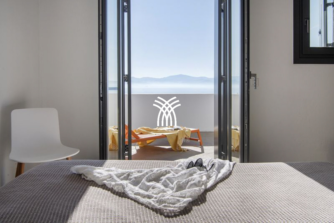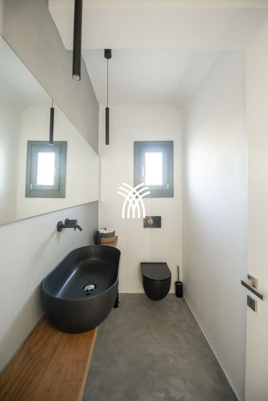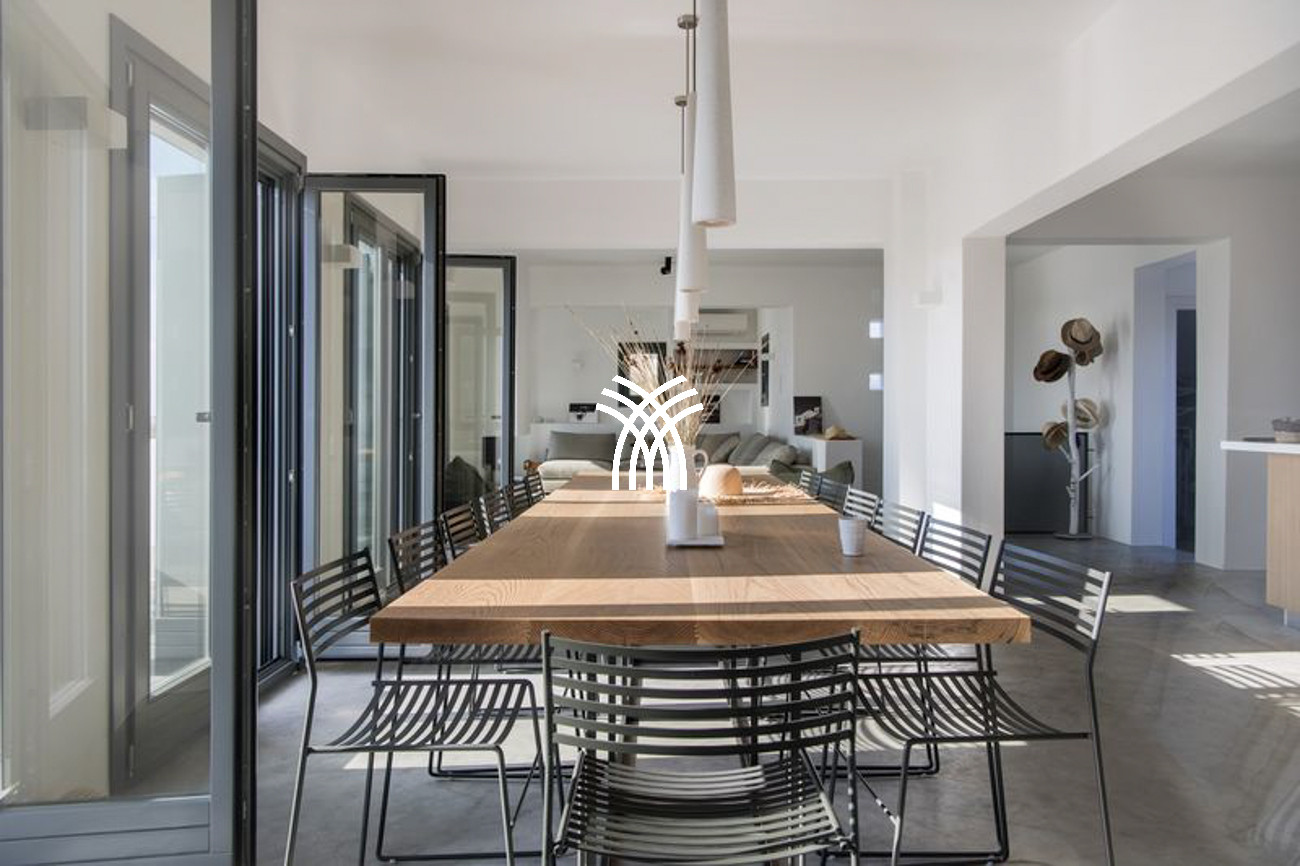 Outdoors, a sparkling swimming pool measuring 7 by 3.40 meters becomes the focal point of sun-drenched days, inviting guests to relax beneath the Mediterranean sky while gazing toward sweeping views of the Aegean Sea. The outdoor areas offer an idyllic setting for quiet moments on a sunbed, convivial gatherings, and unforgettable sunsets that paint the horizon with poetic intensity.