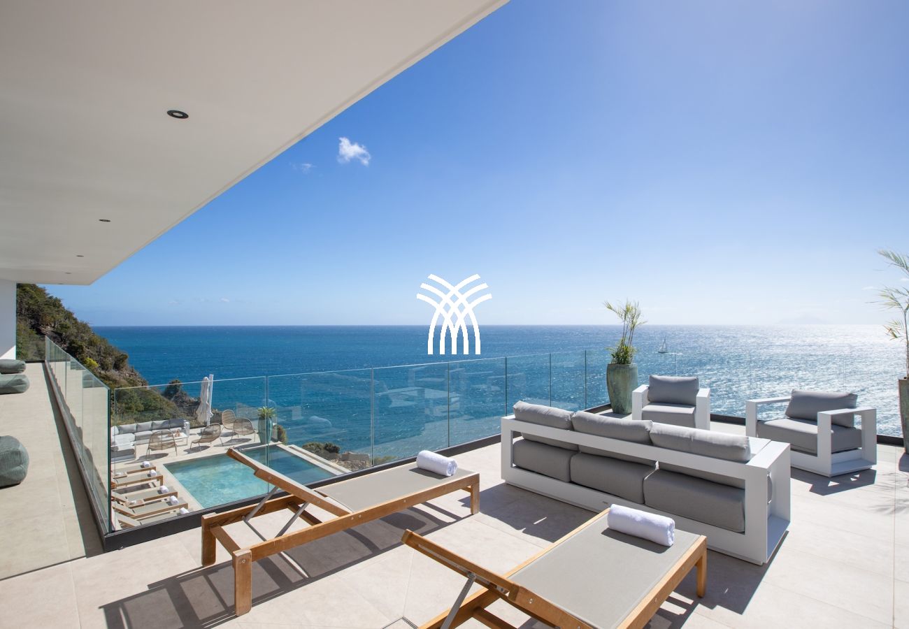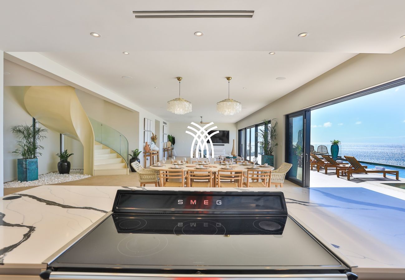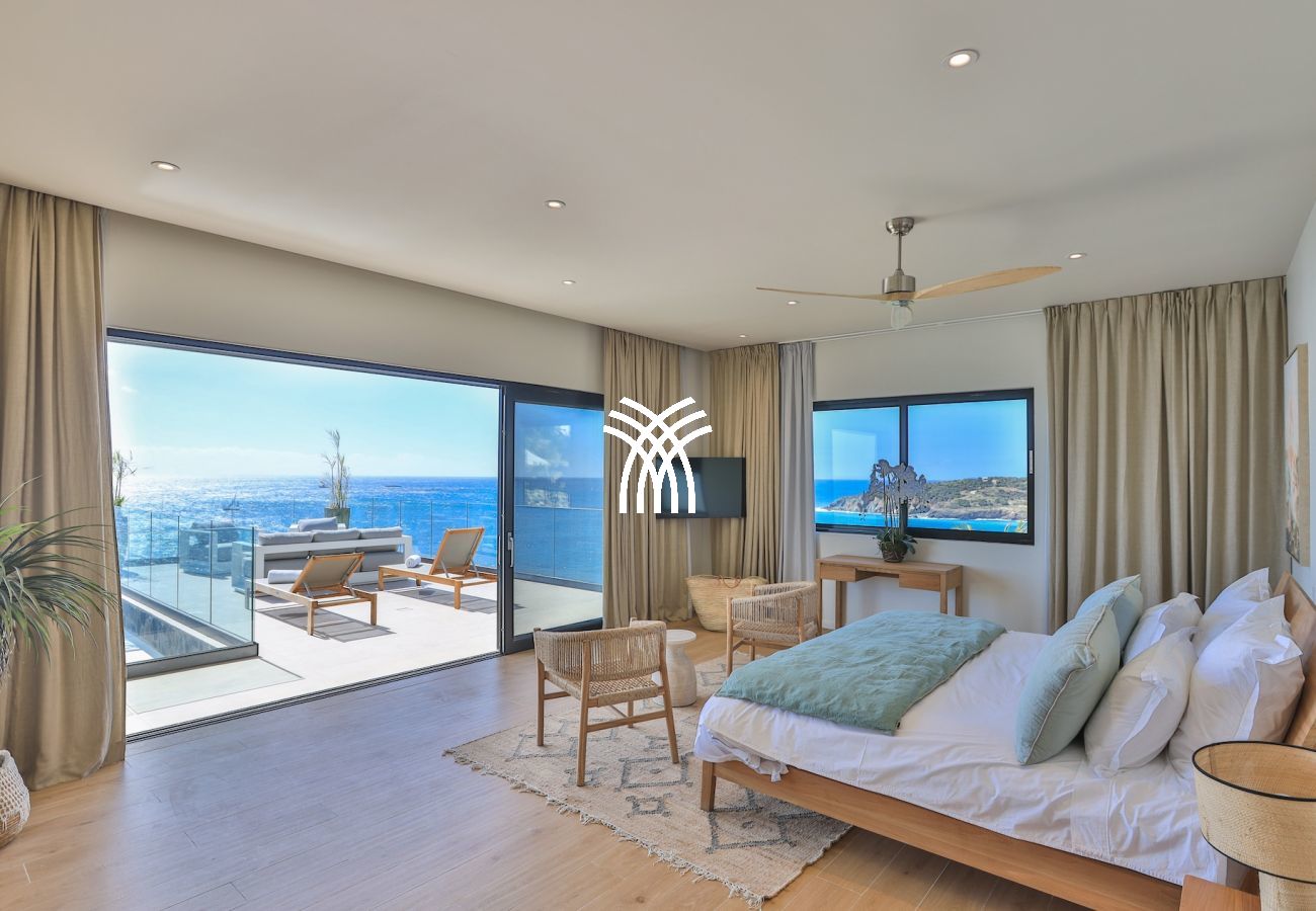 The architecture of the villa favors clean lines and generous volumes, where natural light floods the interiors through immense glass windows. The spacious living room opens onto a spectacular terrace where the infinity pool seems to merge with the azure horizon. The open kitchen, equipped with high-end appliances, invites sharing convivial moments facing an infinite sea. The fluidity between interior and exterior confers a sensation of absolute freedom, accentuated by the sophisticated design and noble materials used.