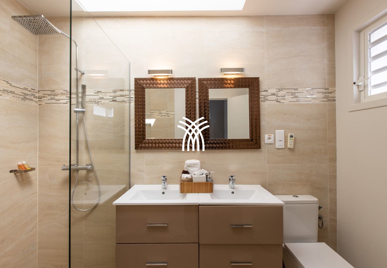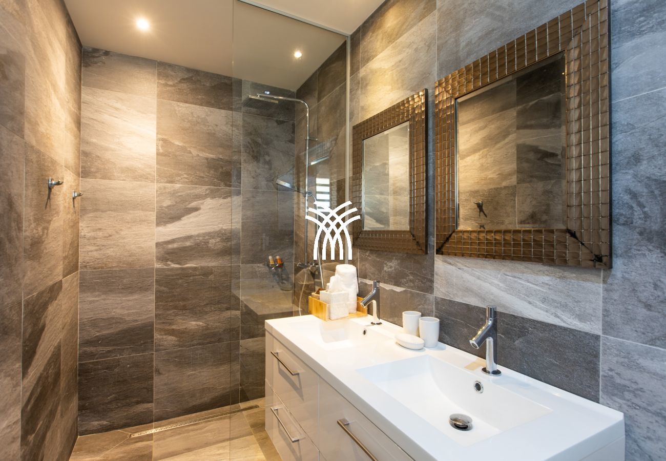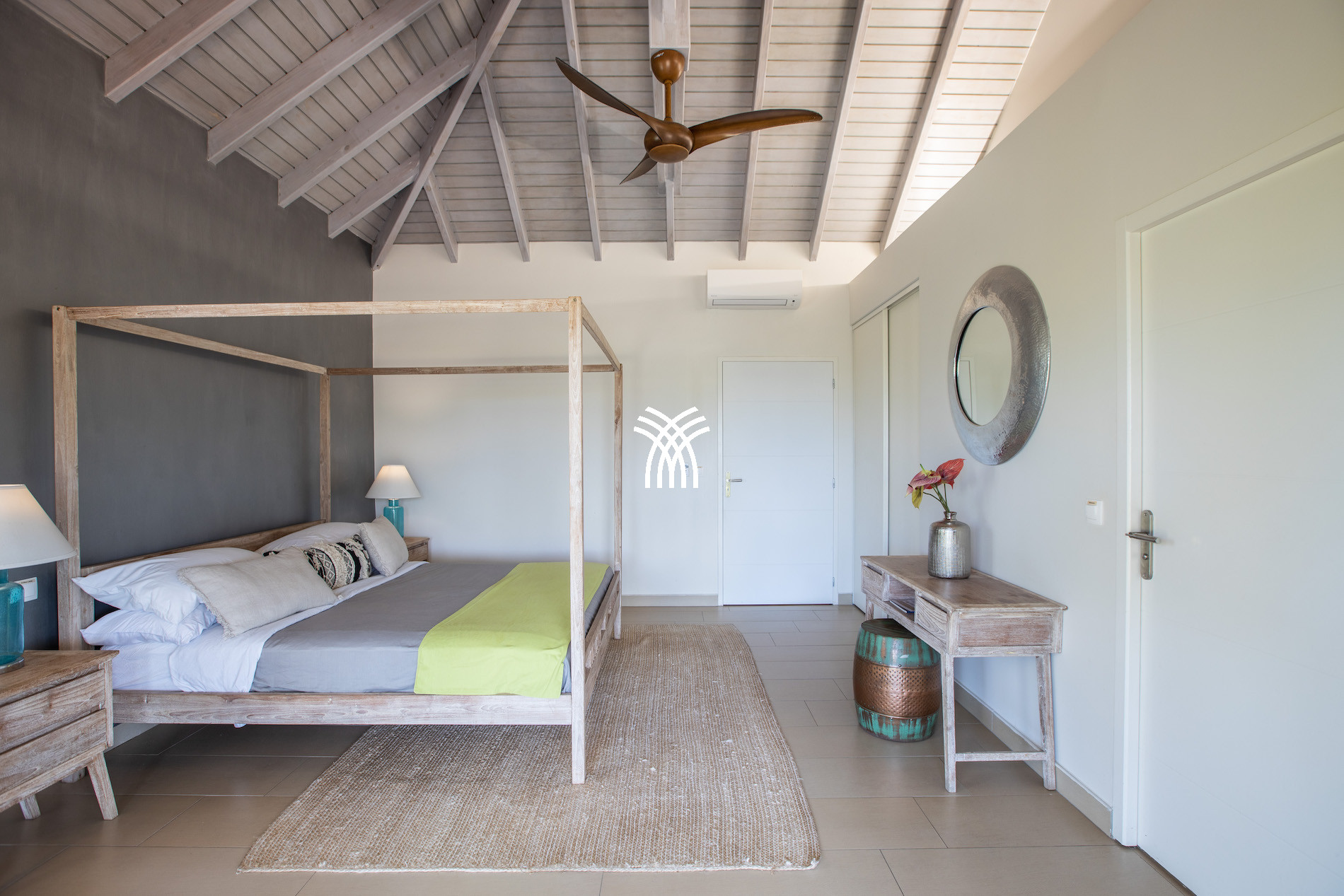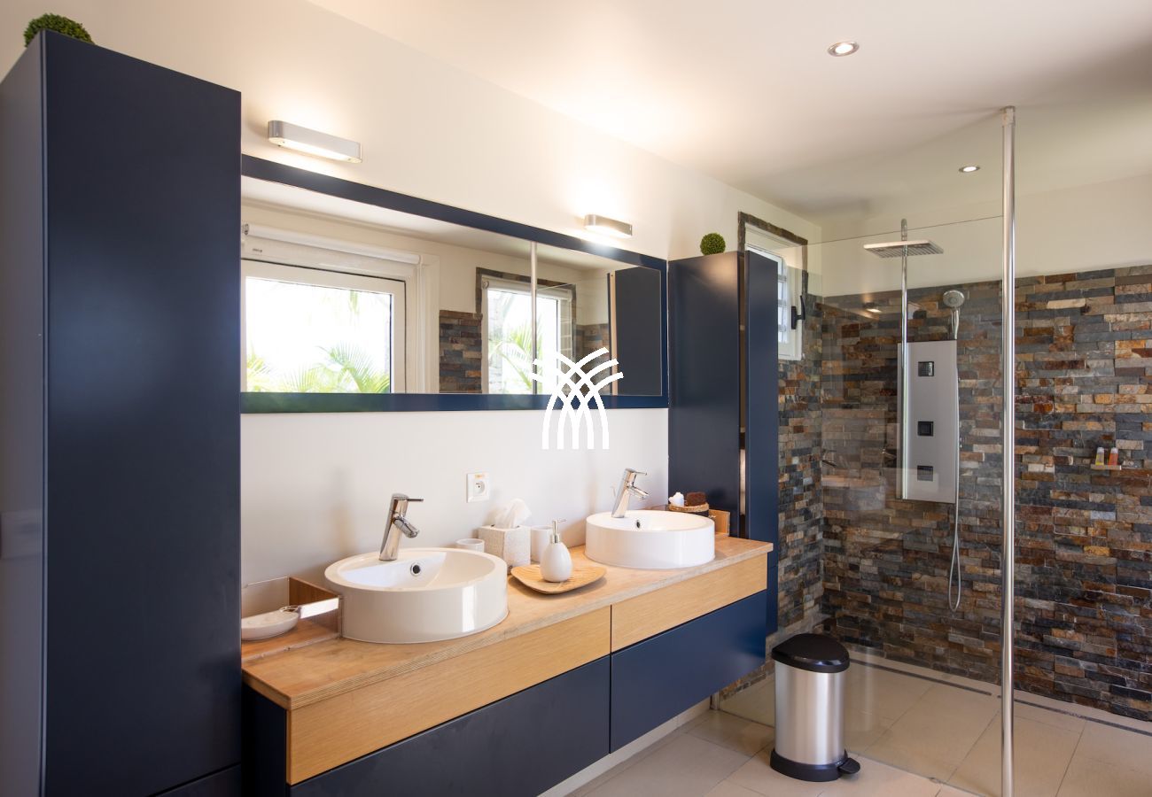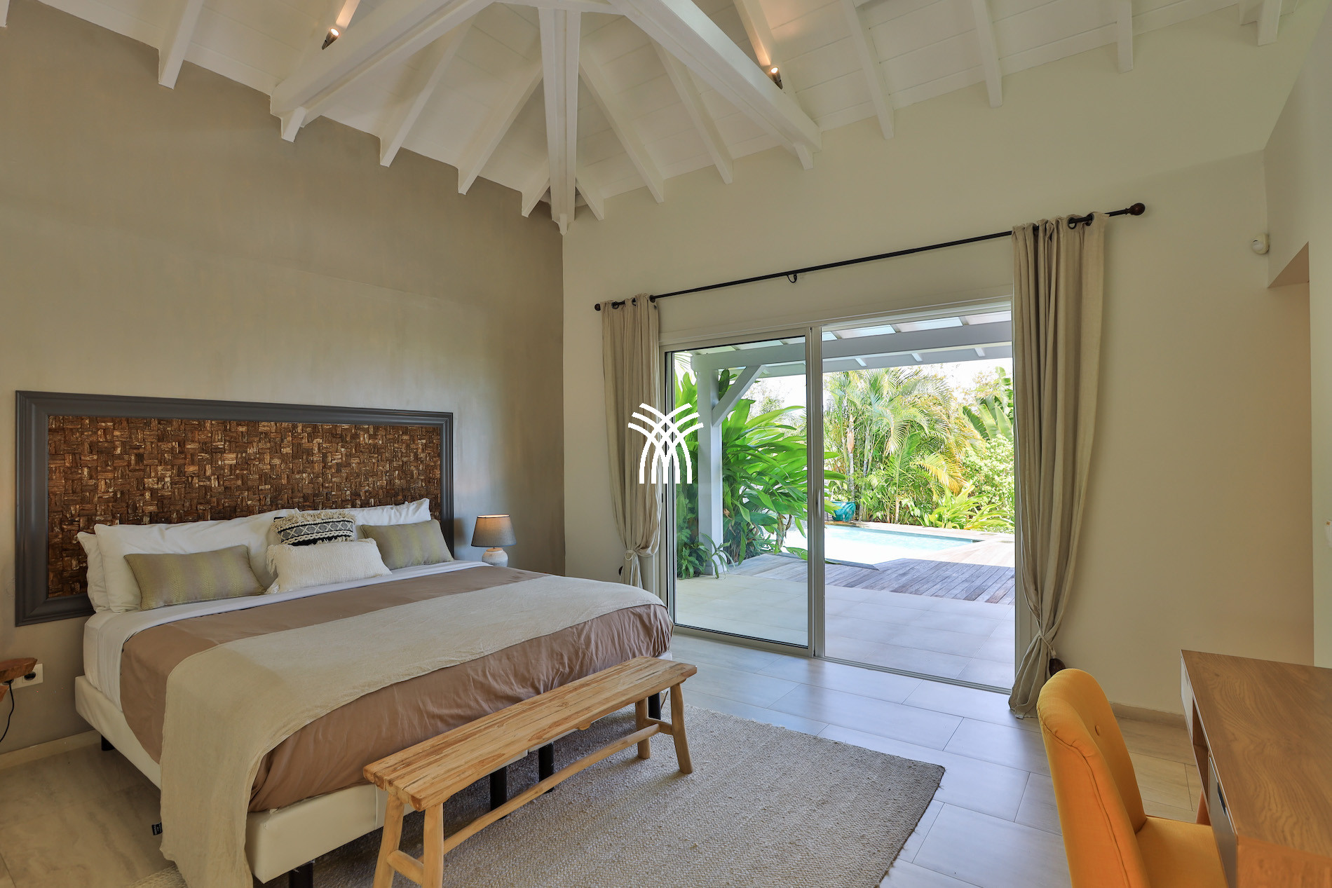 Inside, this luxury villa for rent in Saint-Martin reveals a spacious and refined living space, tastefully decorated in warm tones. High-end furniture and modern amenities ensure optimal comfort. Villa Amber has four air-conditioned bedrooms, each with its private bathroom, guaranteeing privacy and well-being for all guests. Three bedrooms, including the main suite, open directly onto the terrace and pool. The fourth bedroom, located on the lower floor with independent access, is an ideal space for those seeking more privacy.