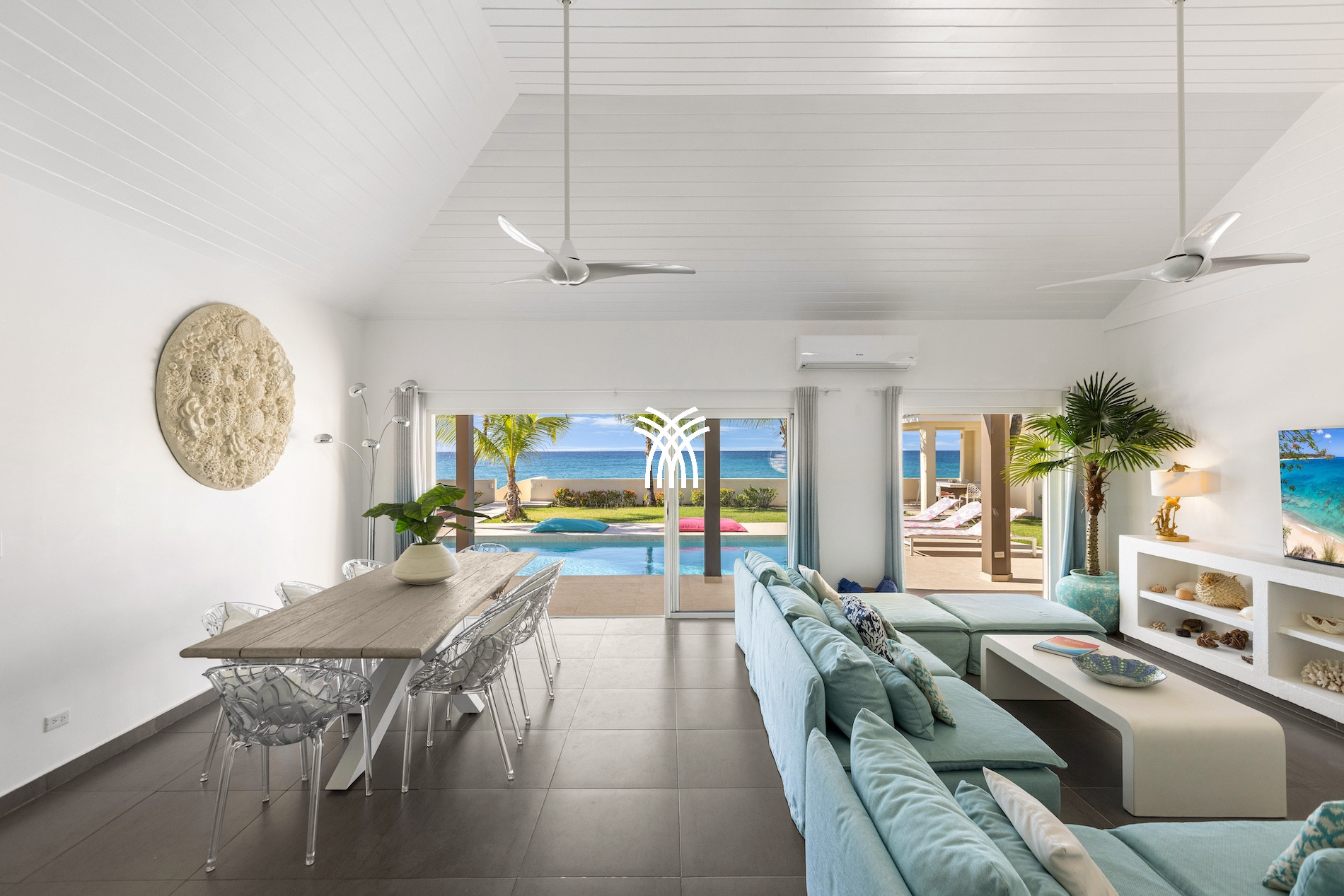 The vast living room with an open kitchen is bathed in light and opens directly onto the outdoor terrace and private pool. It is the ideal place to relax, admire sunsets, or share convivial moments with family or friends.