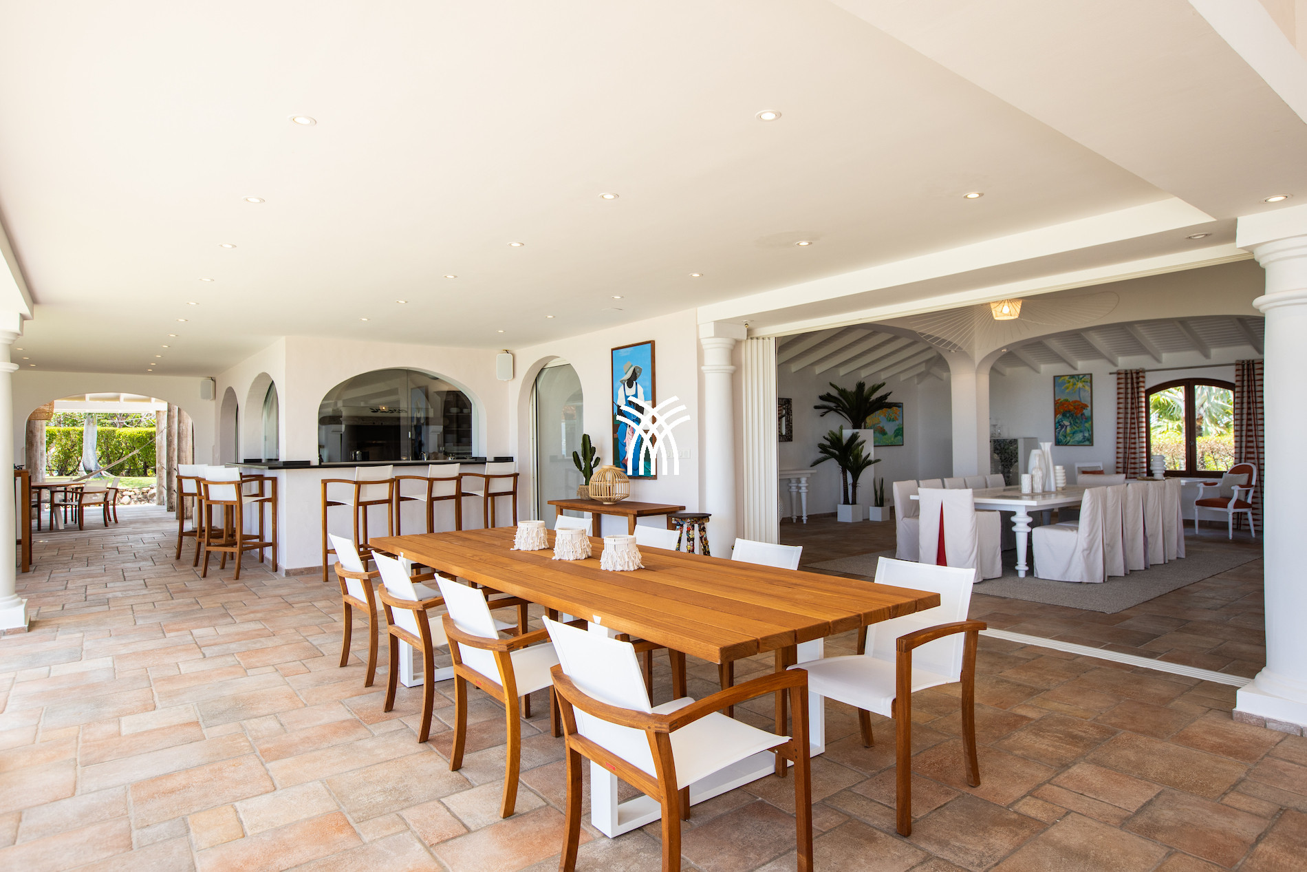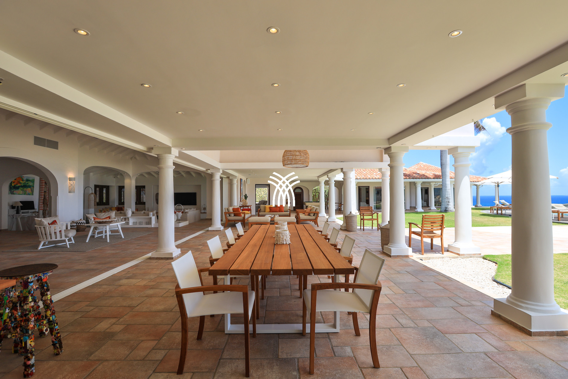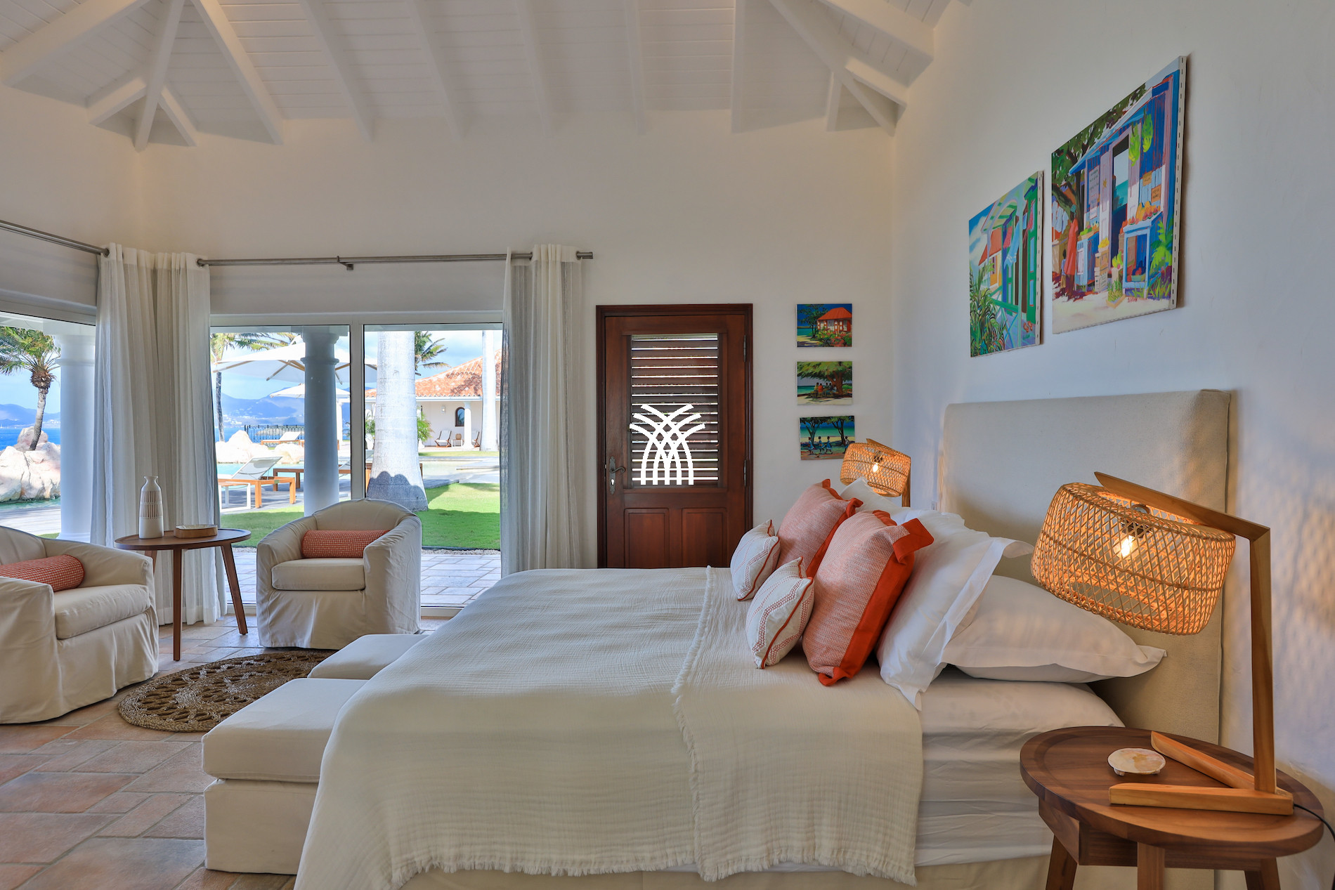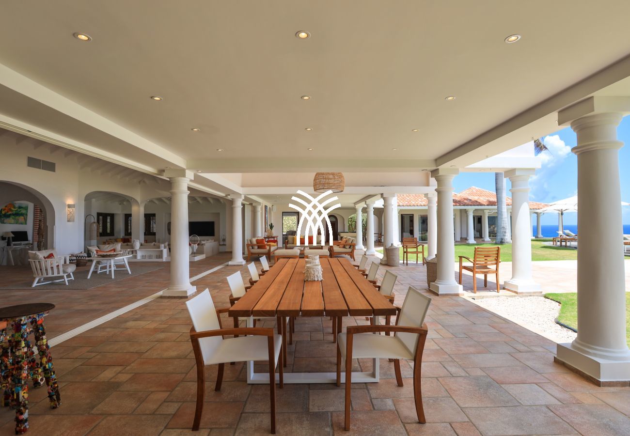 The exterior of this luxury villa for rent in Saint Martin is a true haven of peace. The large terrace with an outdoor lounge inspired by Moroccan design, an infinity pool, and an outdoor dining area allows you to fully experience the Caribbean art of living, between relaxation and conviviality.