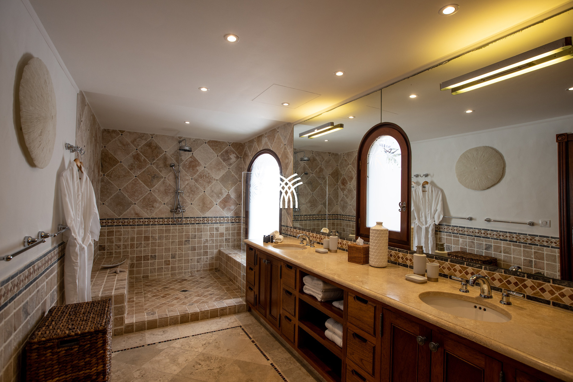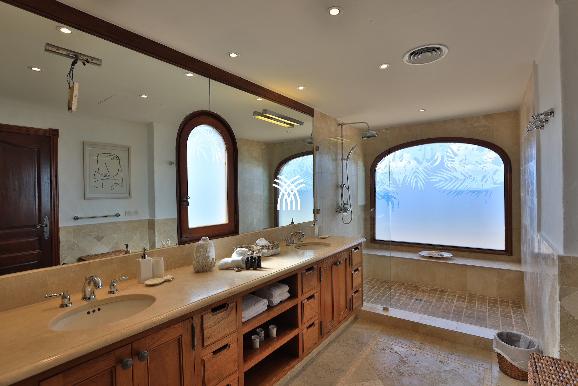 This exceptional villa has 5 bedrooms, all with private bathrooms. Three bedrooms are located on the main level, with direct access to the magnificent infinity pool, ideal for relaxing while facing the sea. The other two bedrooms are located on the lower level, each with an independent external access.