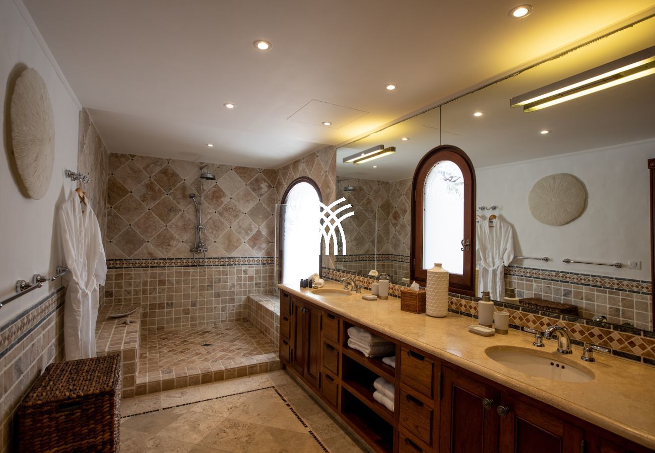 This prestigious villa has 5 bedrooms. Four bedrooms offer an incredible view of the ocean, and the fifth bedroom, located in an independent bungalow in the heart of the garden, ensures maximum privacy.