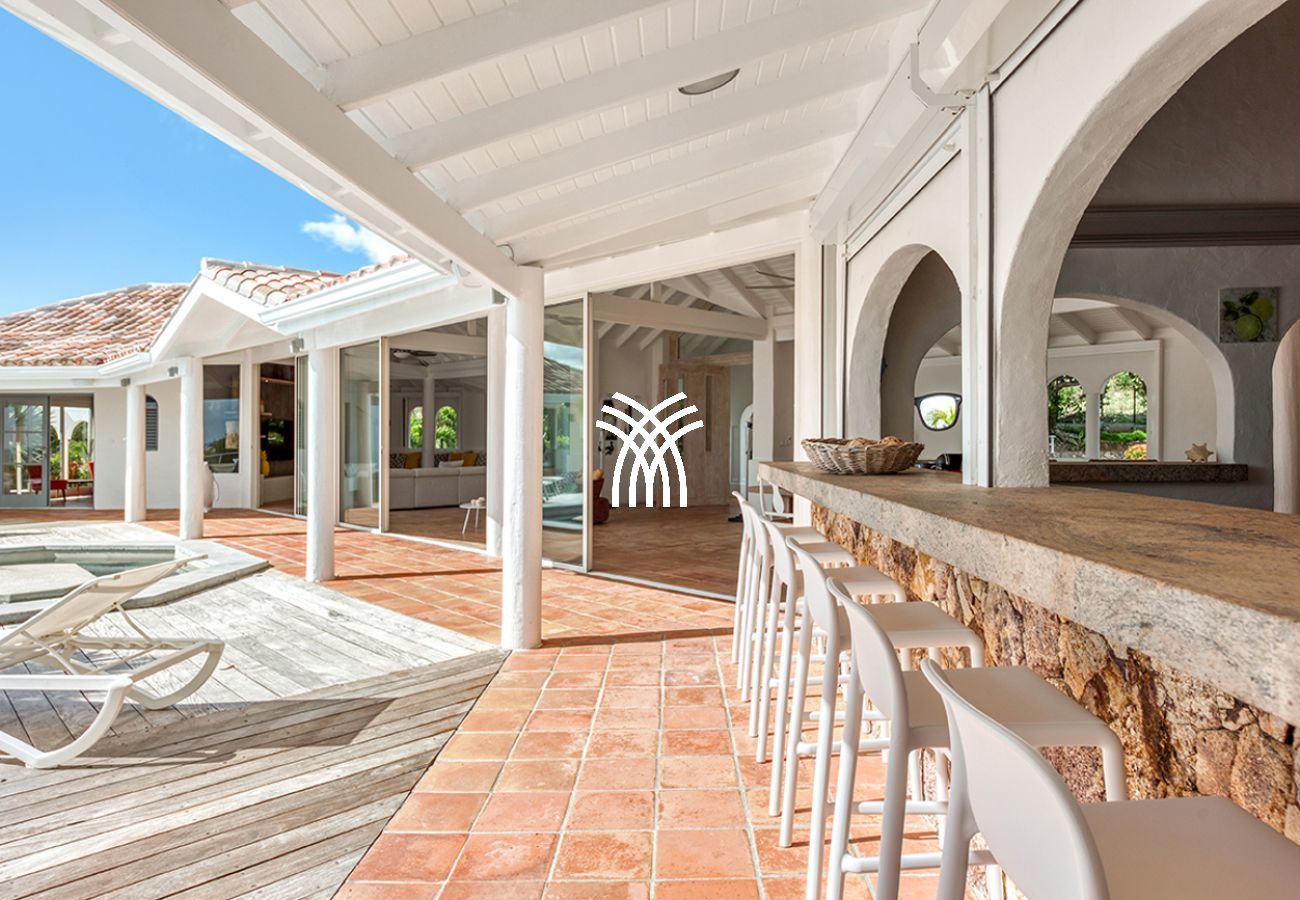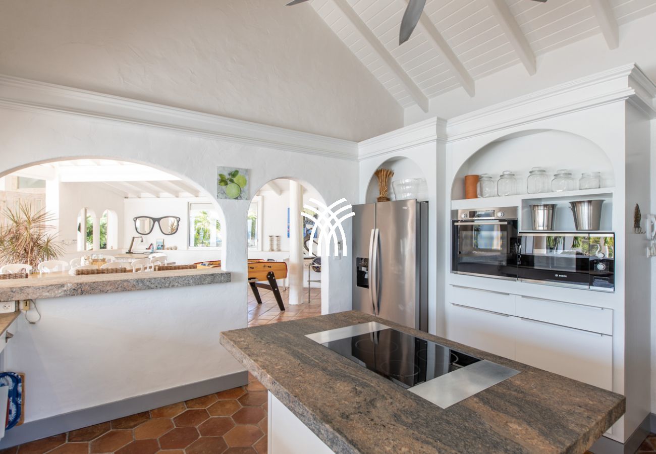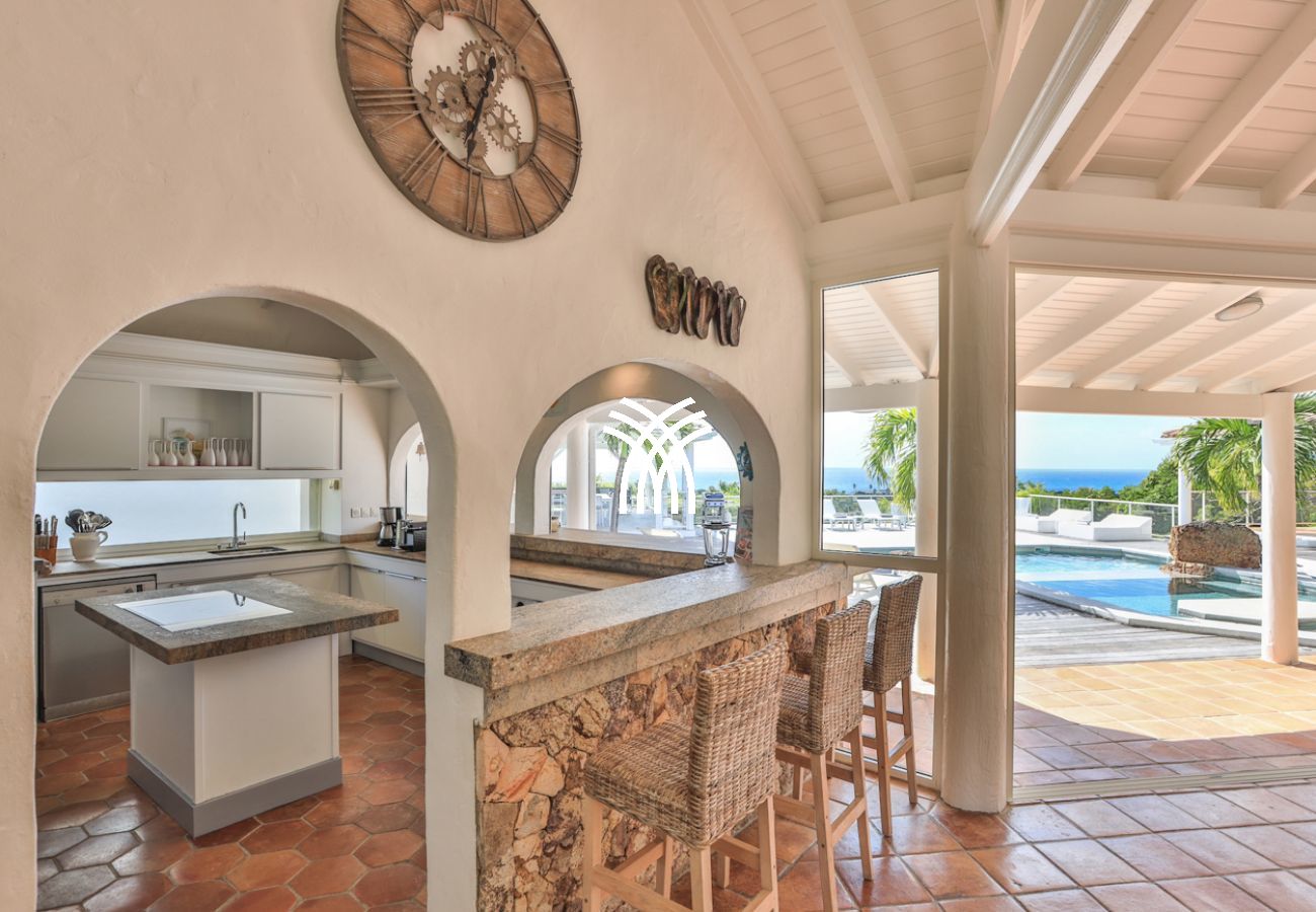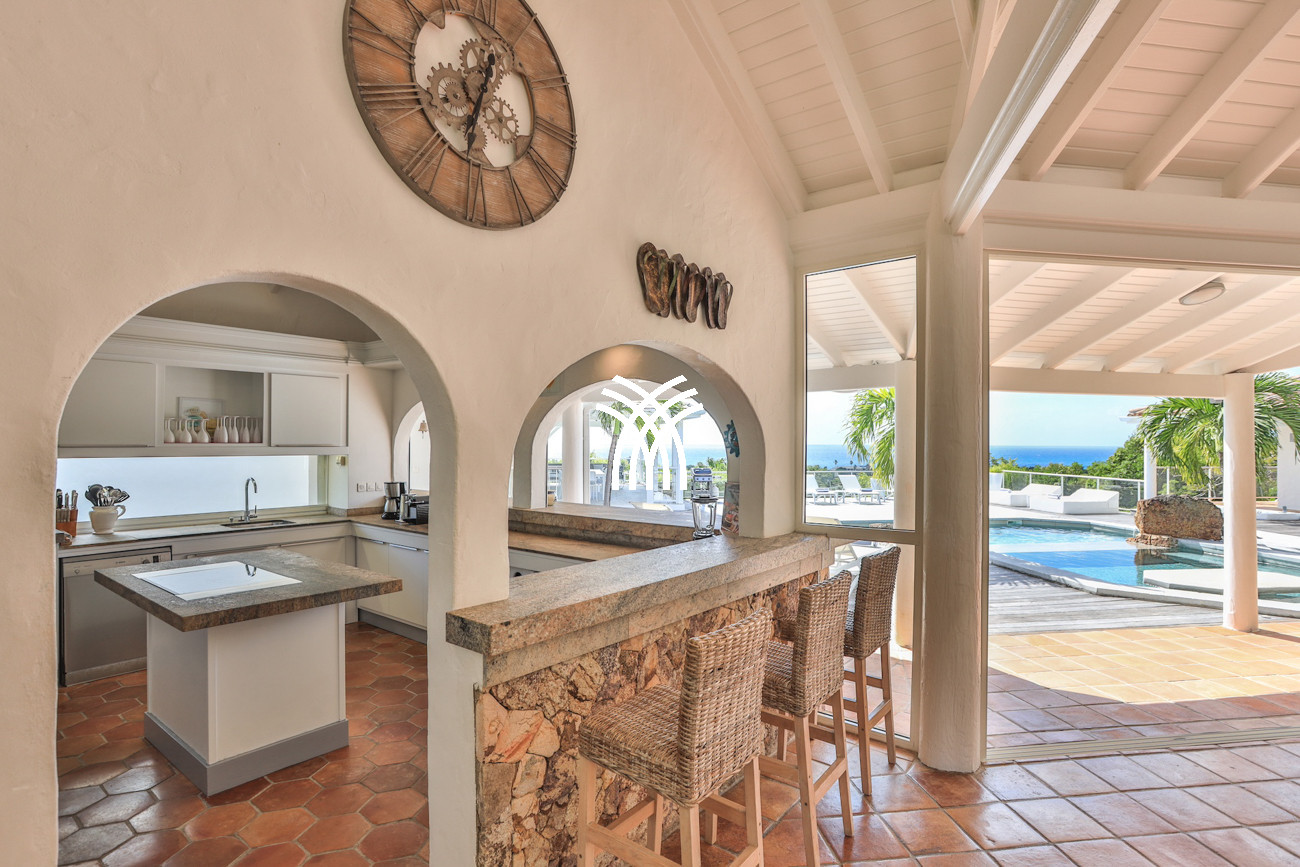 Gourmet cuisine is another asset of this luxury villa for rent in Saint Martin. Its elegant design, high-end equipment, and large arched windows open to the terrace make it a central and bright living space.