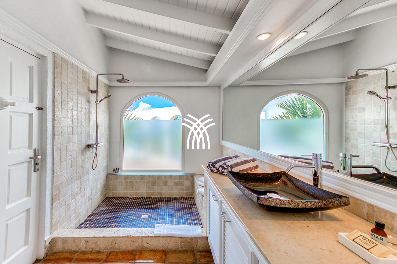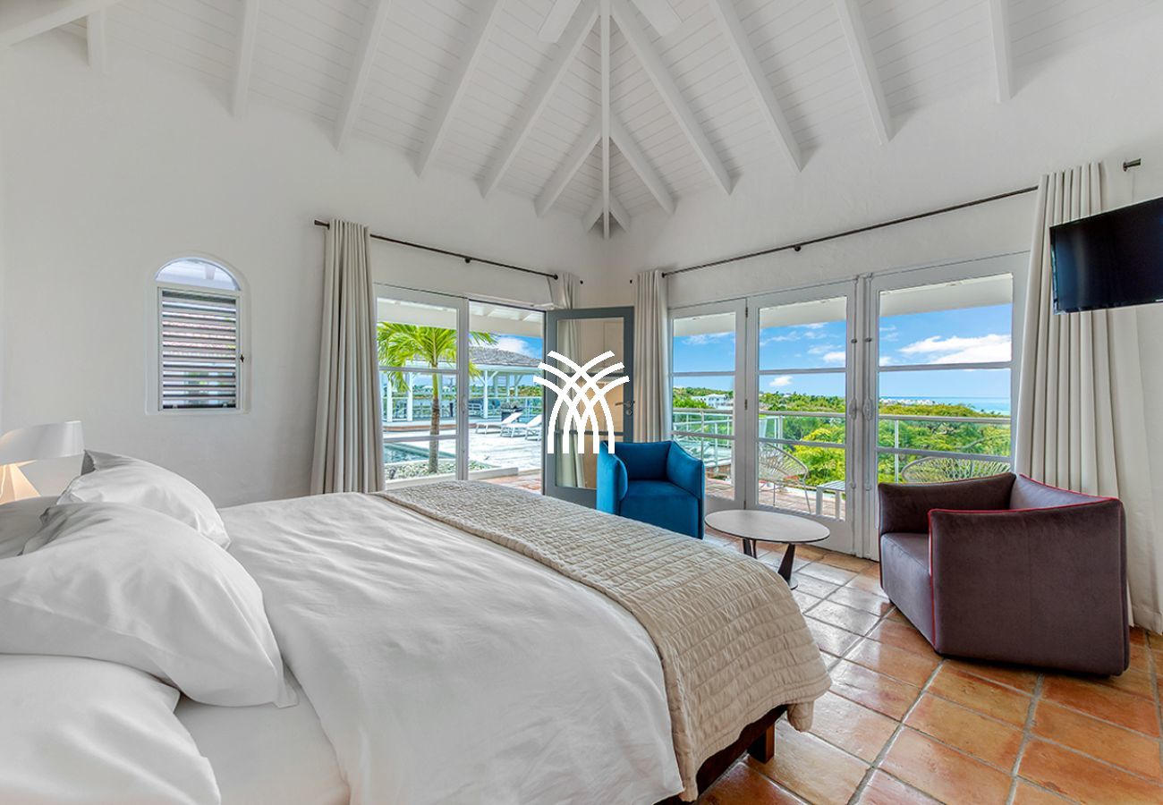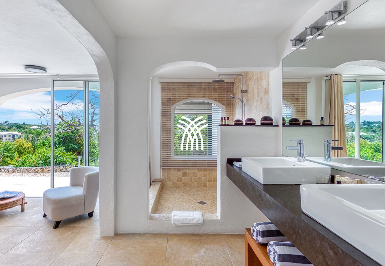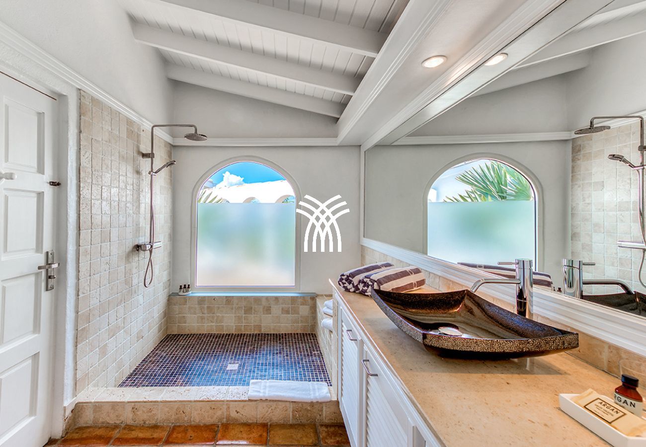 Four bedrooms of equal size have a view of the Caribbean Sea and are at the level of the pool terrace. The 5th bedroom and its ensuite bathroom are on the lower level with views of the Caribbean Sea. This bedroom also includes a kitchenette.