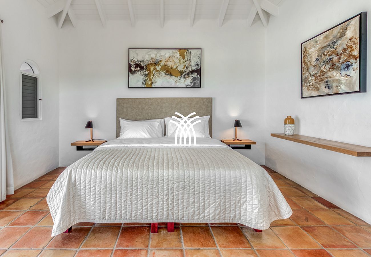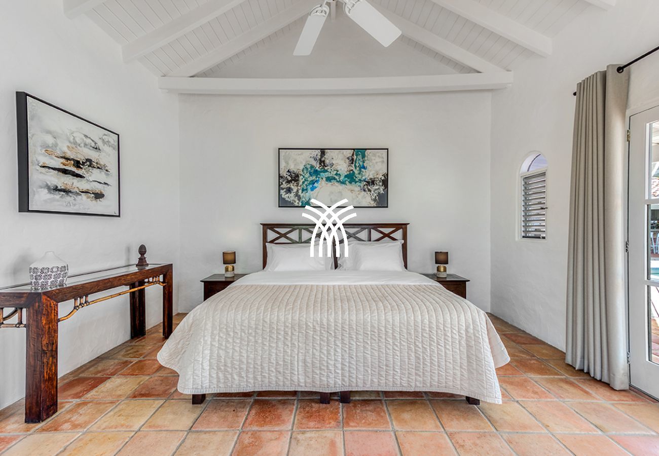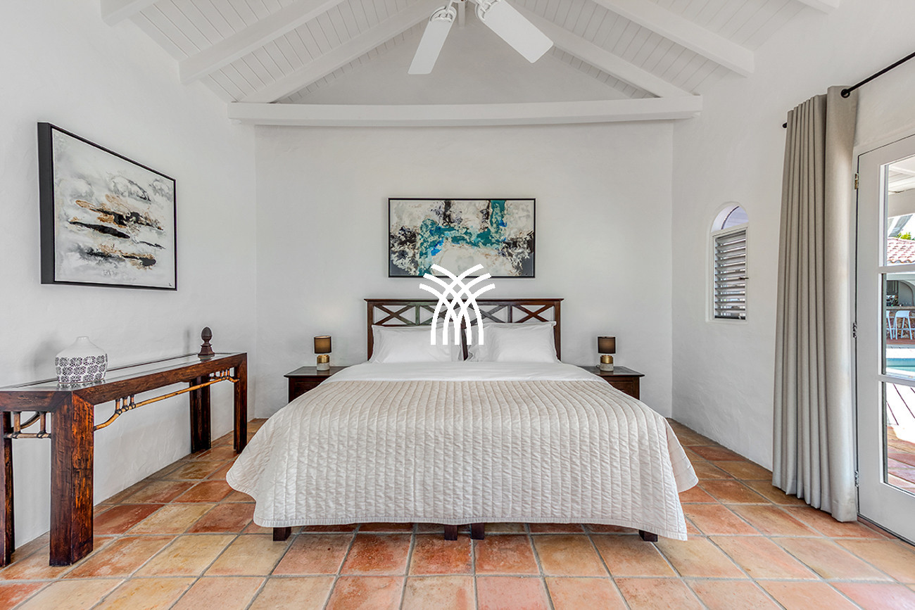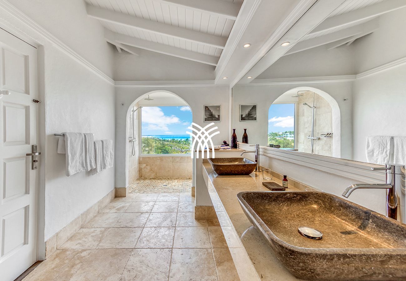Four bedrooms of equal size have a view of the Caribbean Sea and are at the level of the pool terrace. The 5th bedroom and its ensuite bathroom are on the lower level with views of the Caribbean Sea. This bedroom also includes a kitchenette.