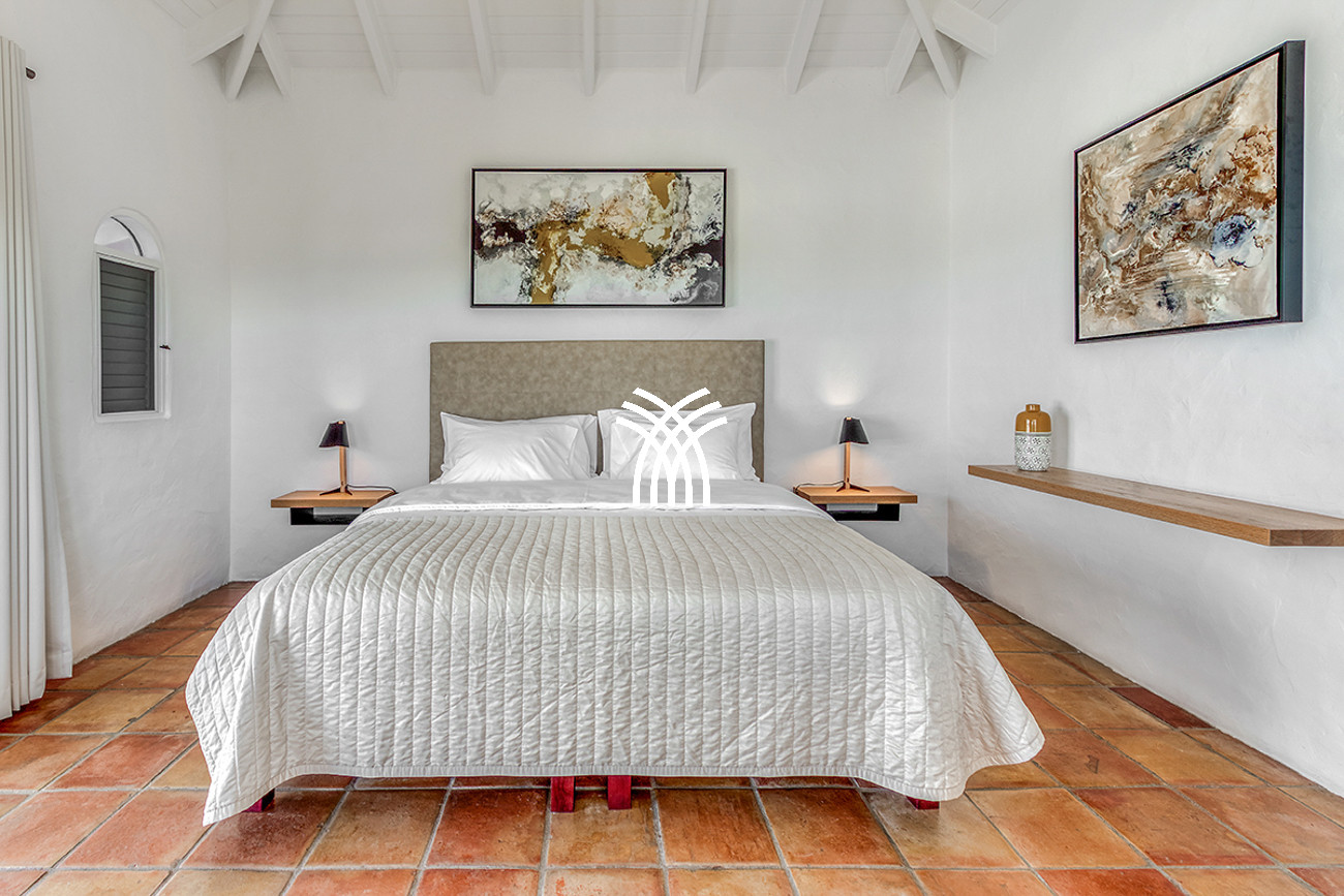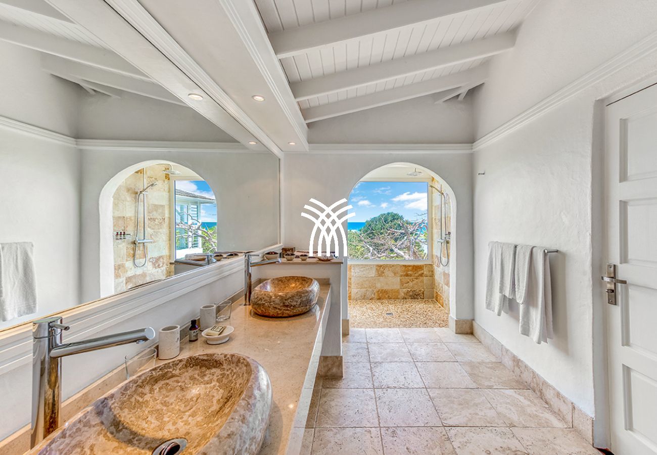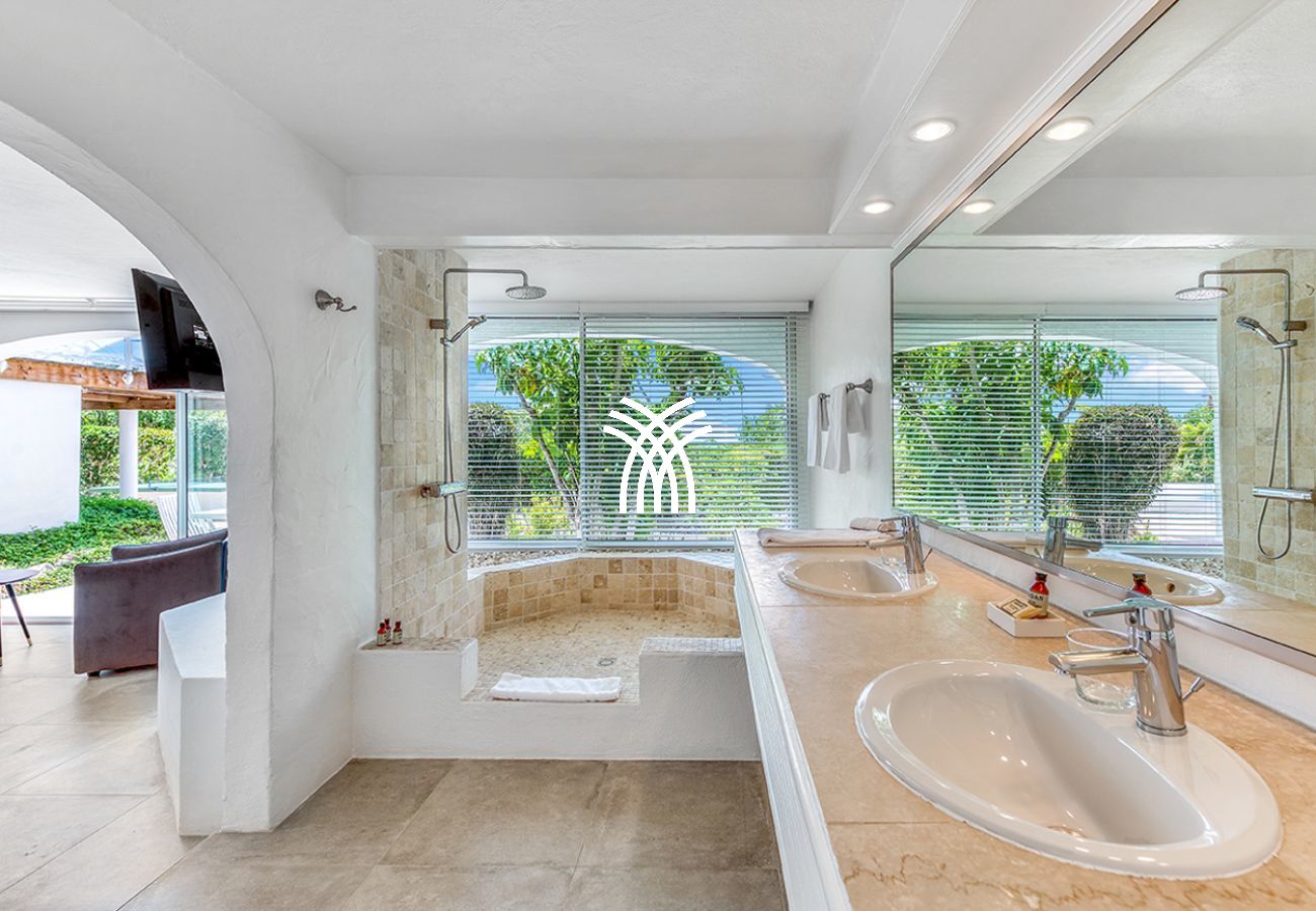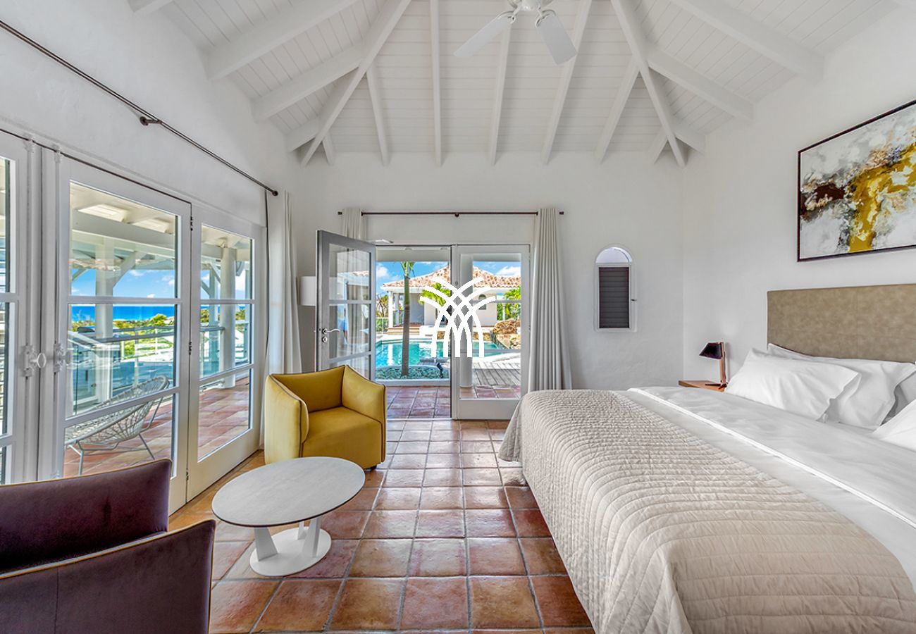 Four bedrooms of equal size have a view of the Caribbean Sea and are at the level of the pool terrace. The 5th bedroom and its ensuite bathroom are on the lower level with views of the Caribbean Sea. This bedroom also includes a kitchenette.