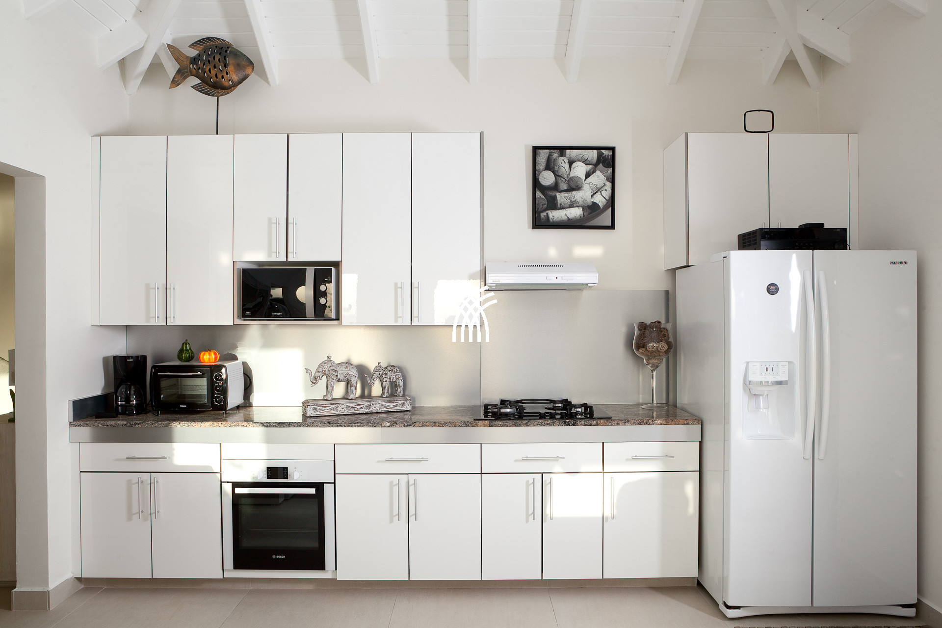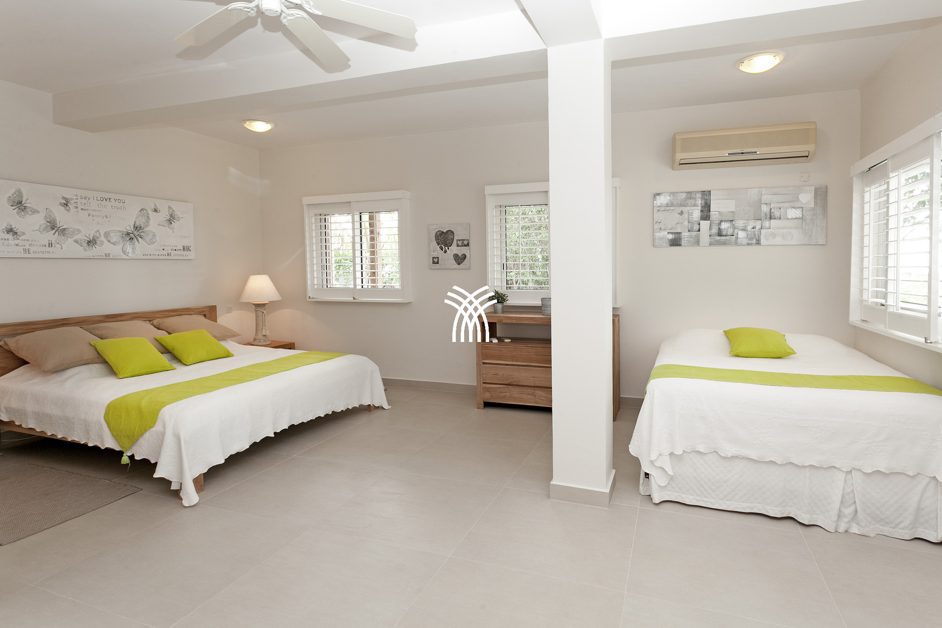 Four bedrooms of equal size have a view of the Caribbean Sea and are at the level of the pool terrace. The 5th bedroom and its ensuite bathroom are on the lower level with views of the Caribbean Sea. This bedroom also includes a kitchenette.