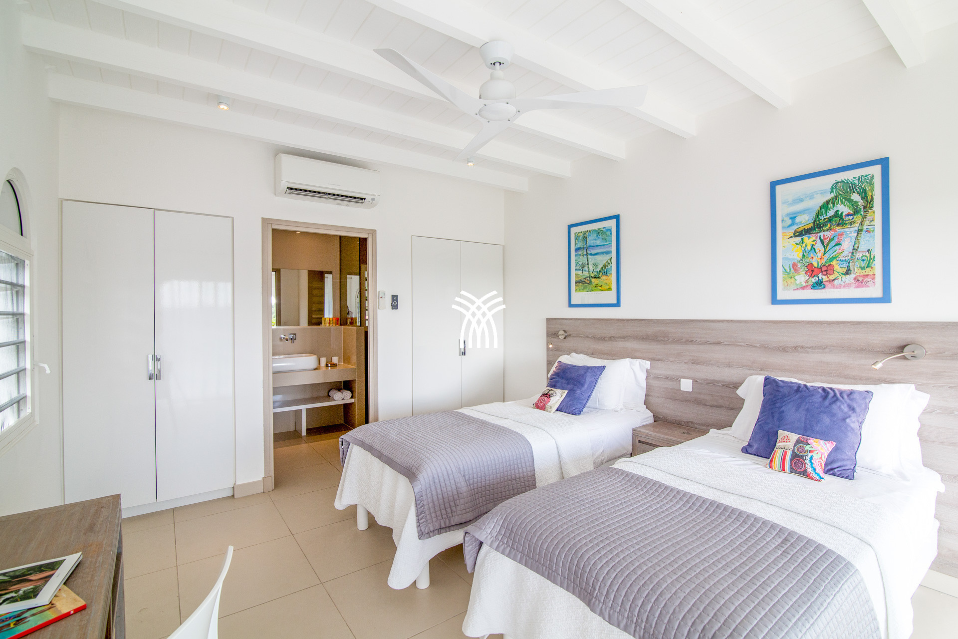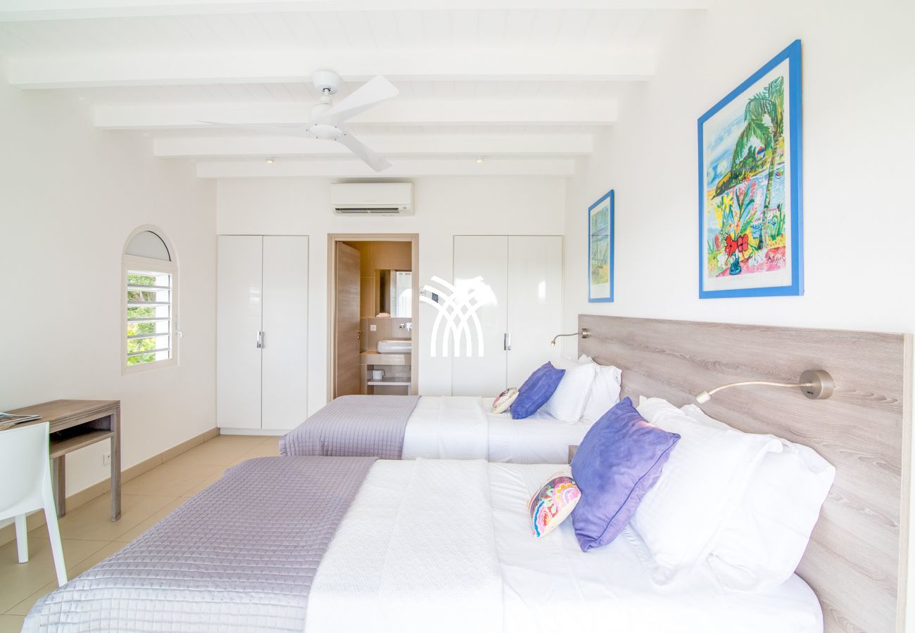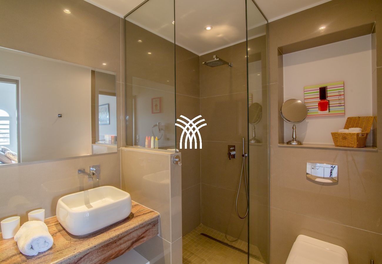 Four bedrooms of equal size have a view of the Caribbean Sea and are at the level of the pool terrace. The 5th bedroom and its ensuite bathroom are on the lower level with views of the Caribbean Sea. This bedroom also includes a kitchenette.