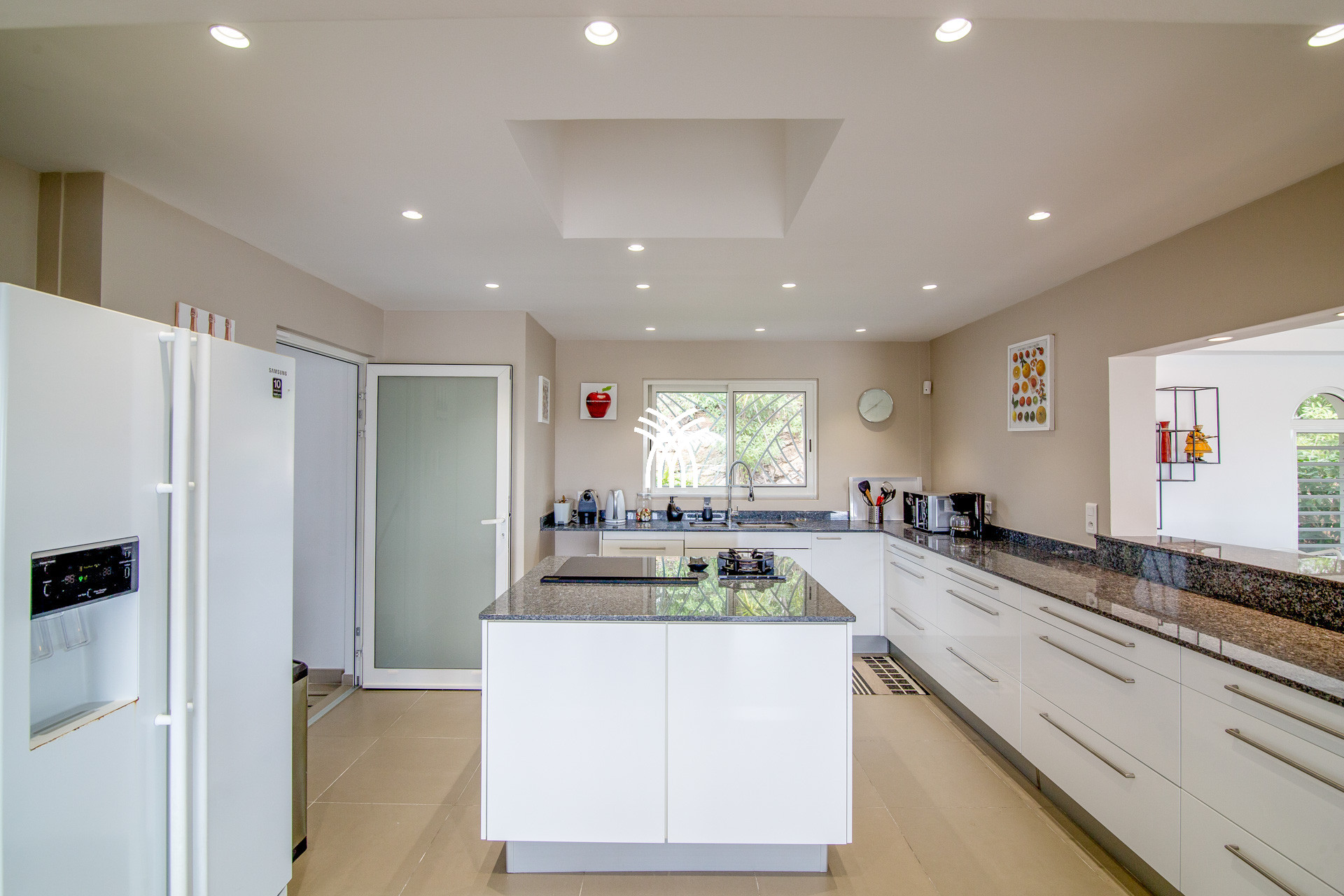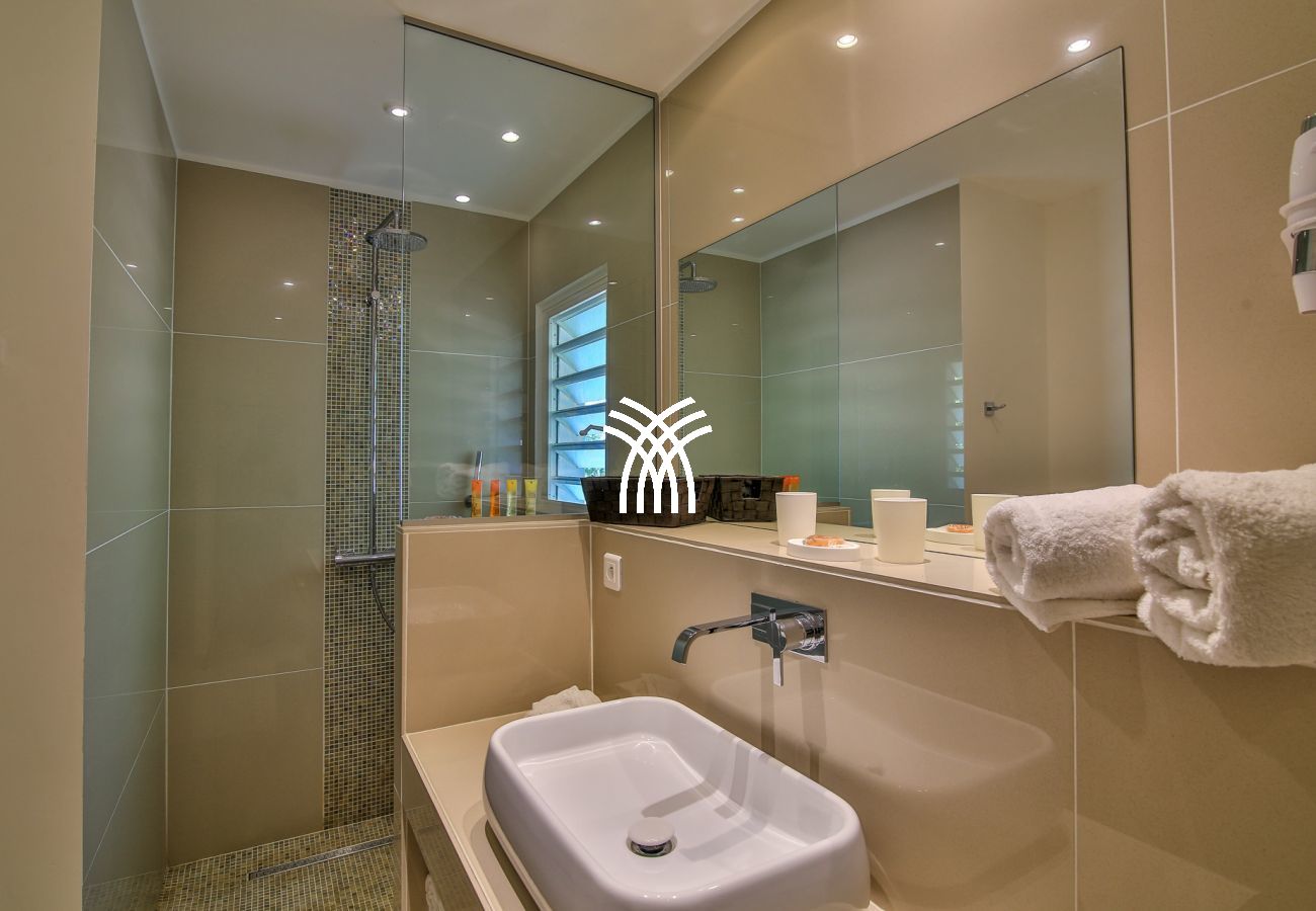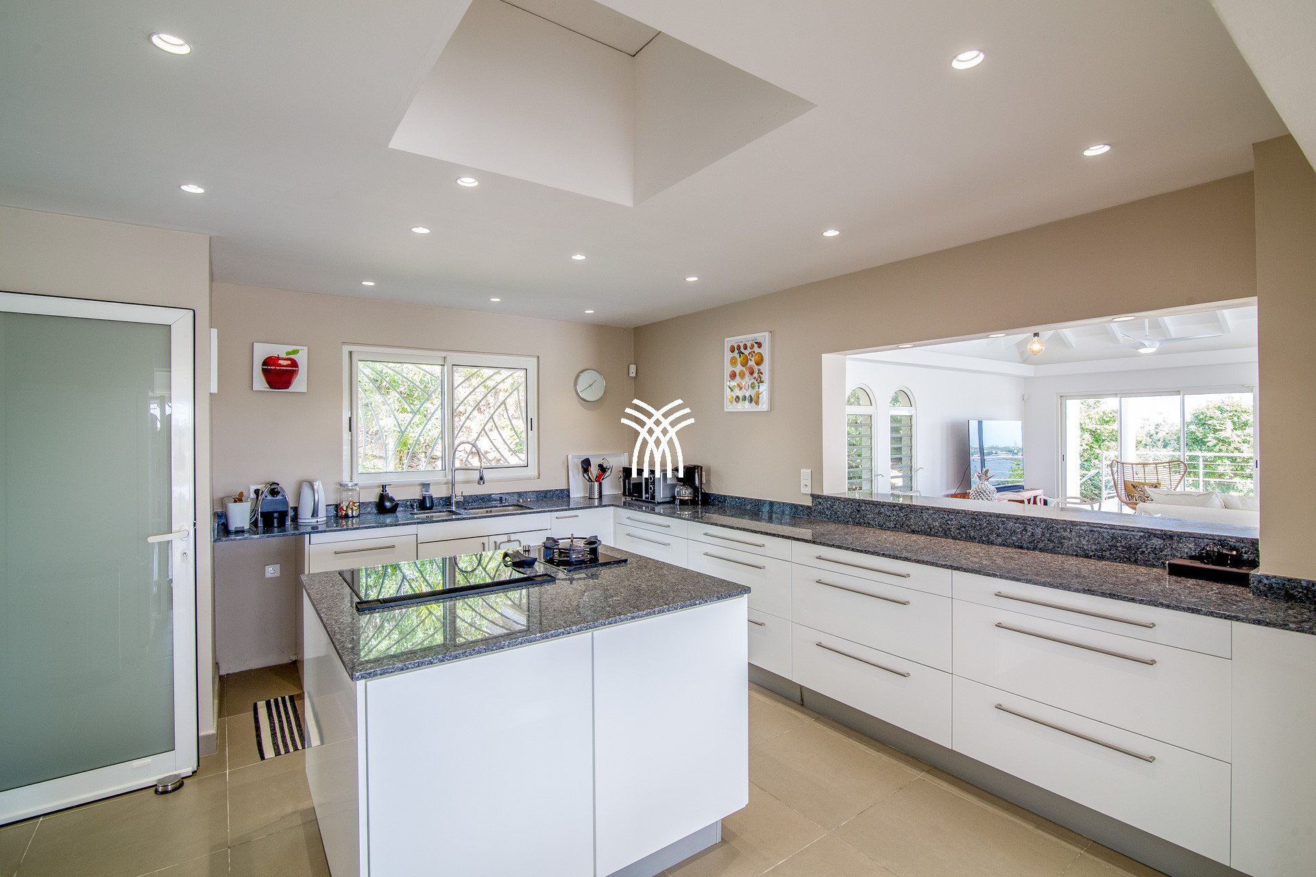 Four bedrooms of equal size have a view of the Caribbean Sea and are at the level of the pool terrace. The 5th bedroom and its ensuite bathroom are on the lower level with views of the Caribbean Sea. This bedroom also includes a kitchenette.