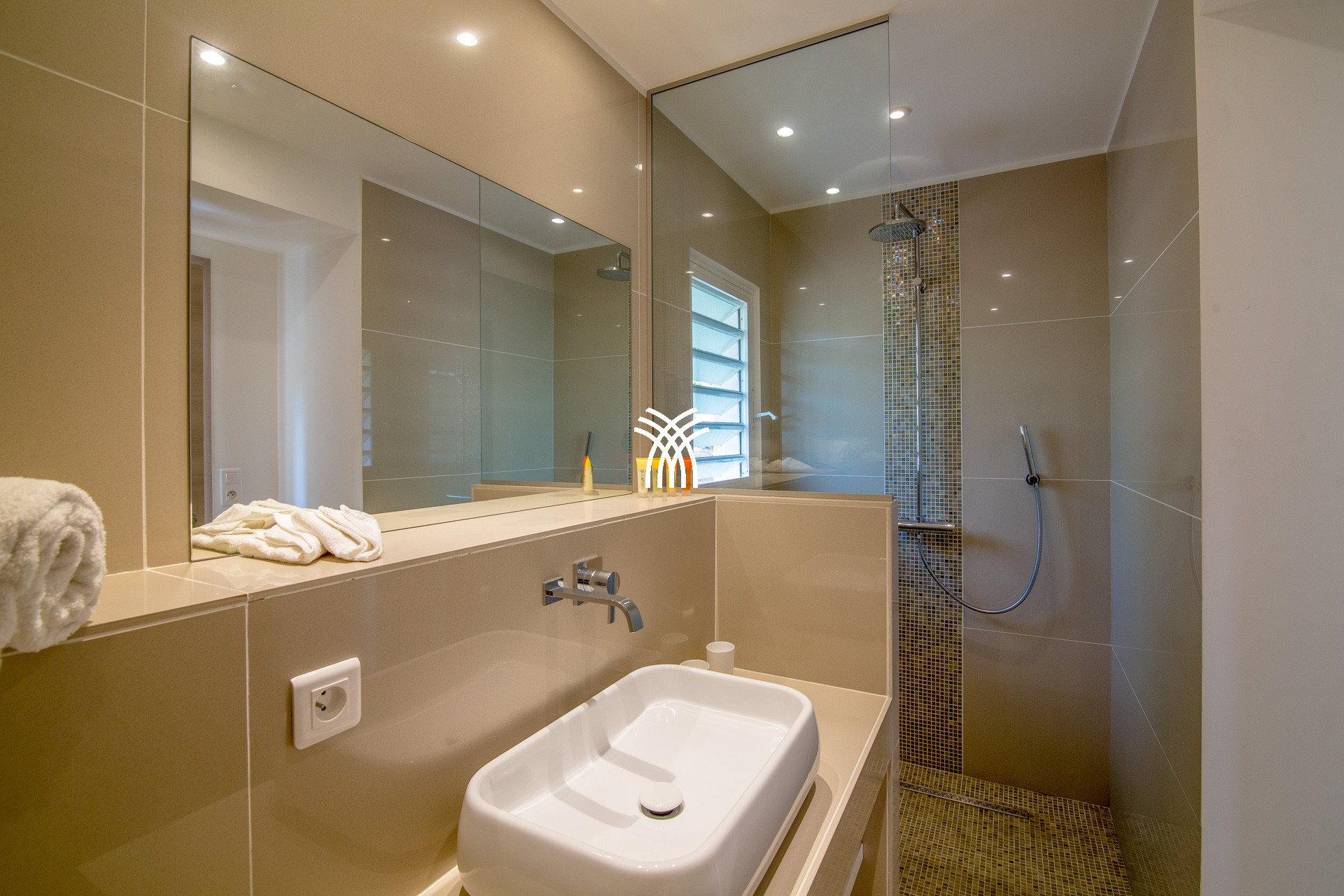 This exceptional villa has 5 bedrooms, all with private bathrooms. Three bedrooms are located on the main level, with direct access to the magnificent infinity pool, ideal for relaxing while facing the sea. The other two bedrooms are located on the lower level, each with an independent external access.