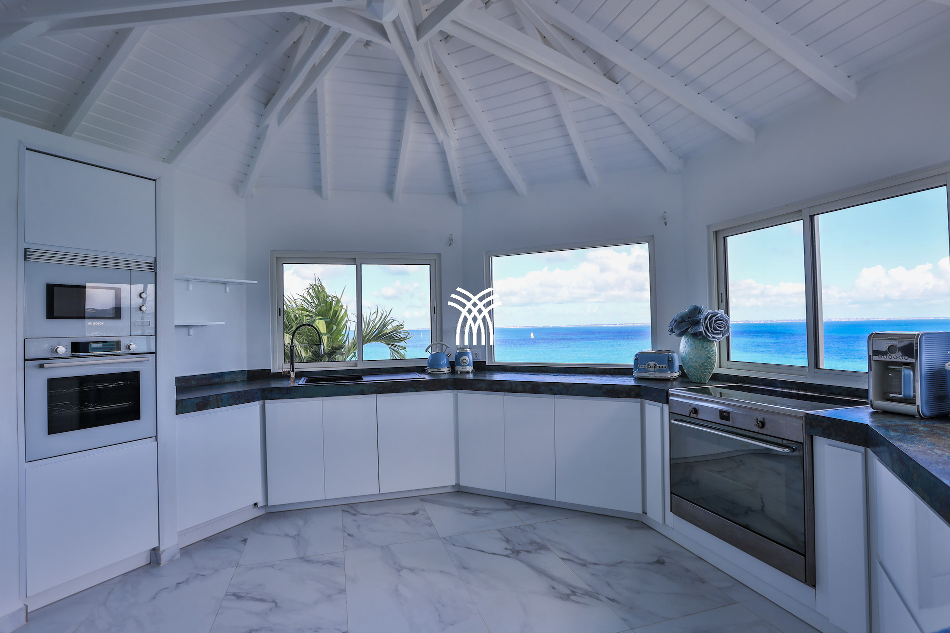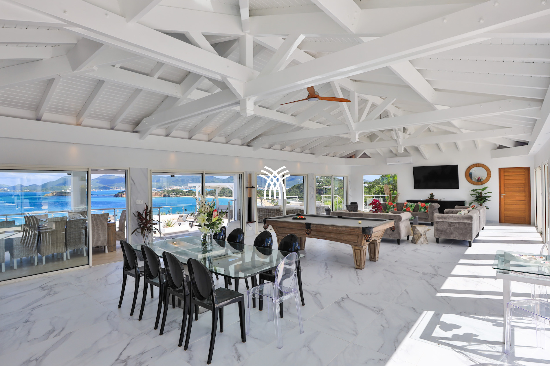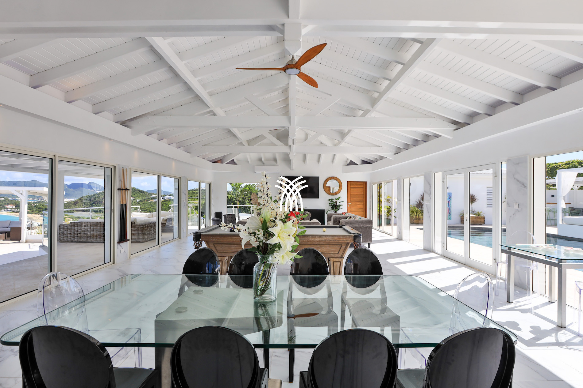 The living spaces of this luxury villa for rent in Saint Martin are designed for comfort and pleasure: a fully equipped kitchen (meals are exclusively prepared by the villa's private chef), a multimedia room with plasma screen, large shaded or sunny terraces, a jacuzzi, a gym, a spa, and relaxation areas facing the ocean.