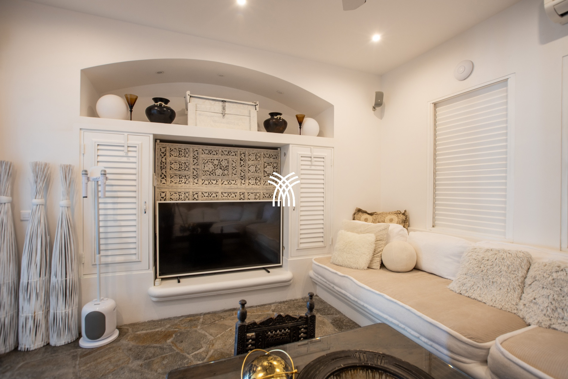 The architecture of the villa favors clean lines and generous volumes, where natural light floods the interiors through immense glass windows. The spacious living room opens onto a spectacular terrace where the infinity pool seems to merge with the azure horizon. The open kitchen, equipped with high-end appliances, invites sharing convivial moments facing an infinite sea. The fluidity between interior and exterior confers a sensation of absolute freedom, accentuated by the sophisticated design and noble materials used.