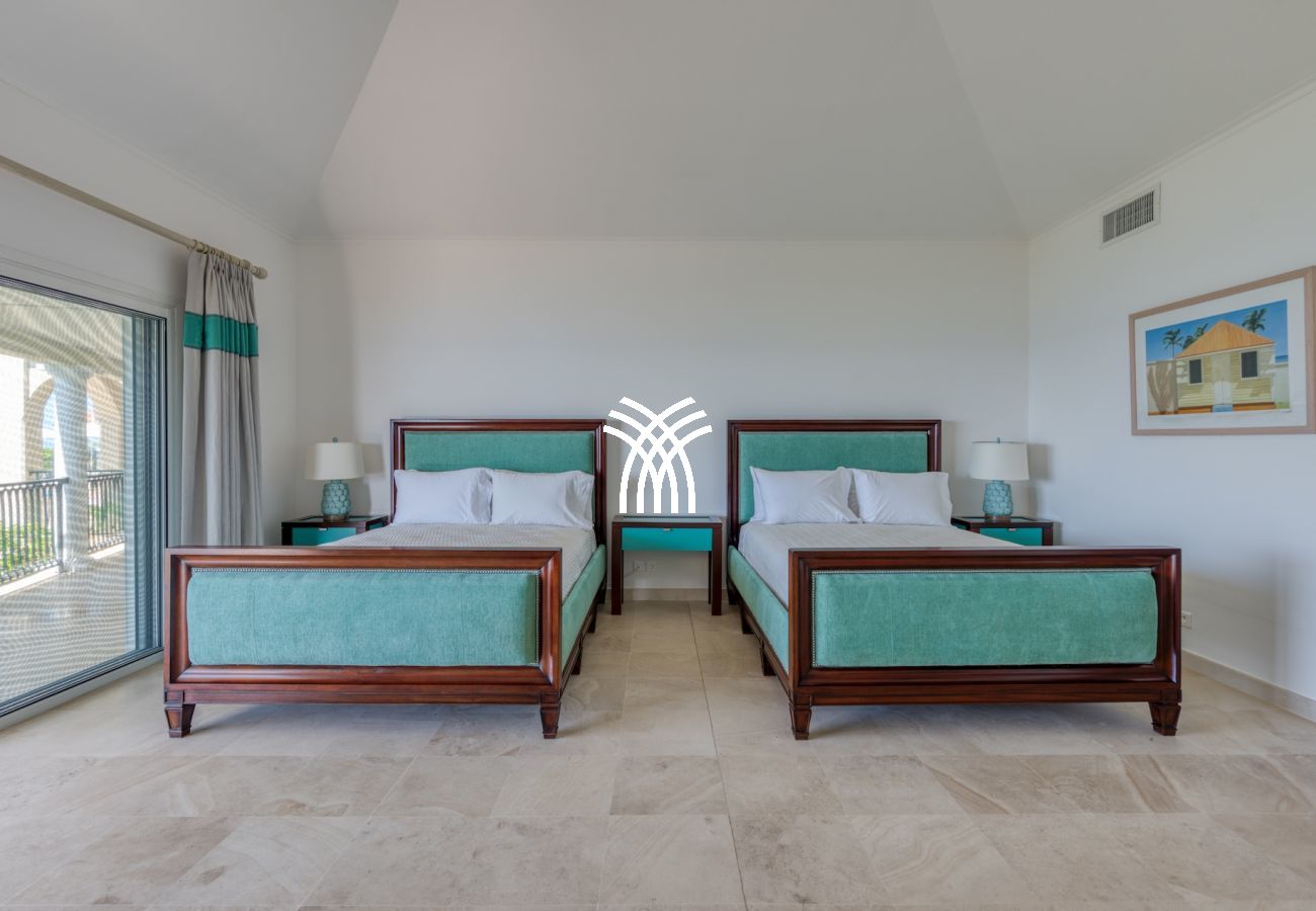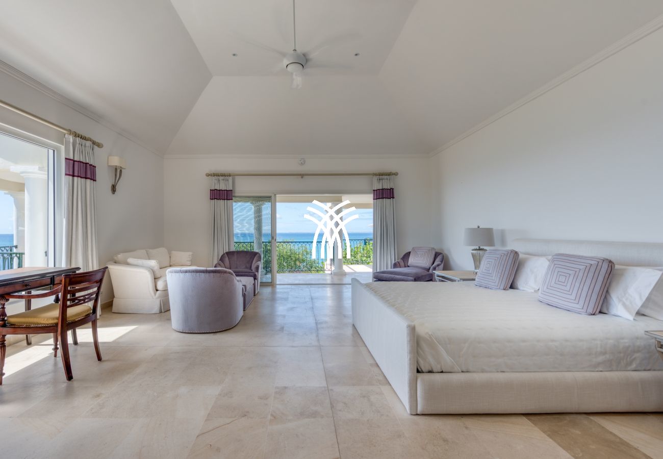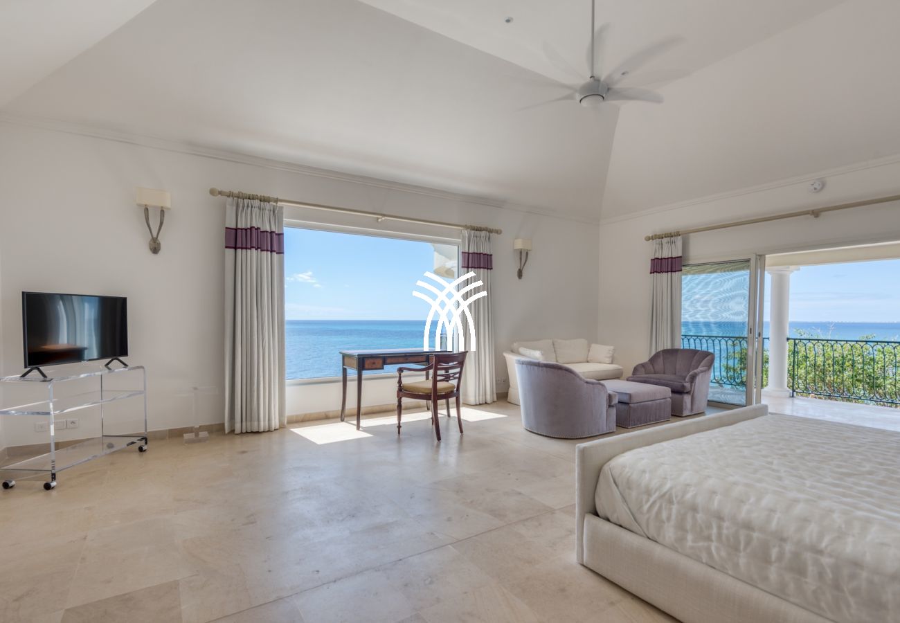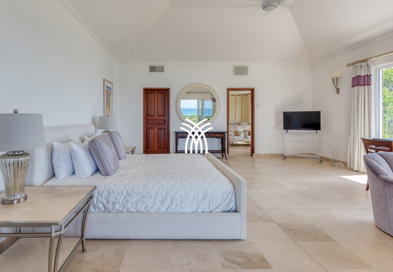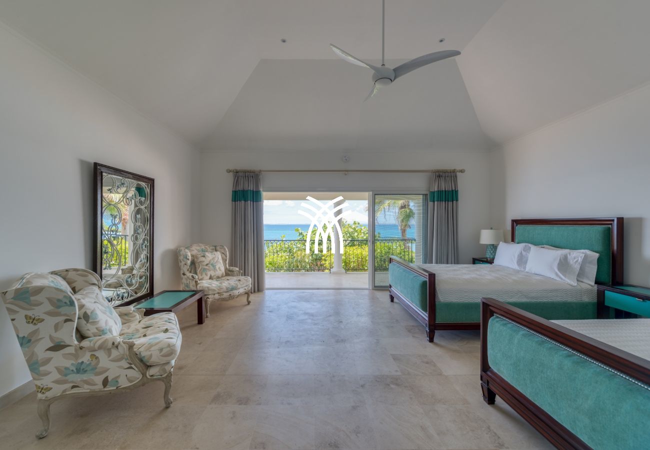 Four bedrooms of equal size have a view of the Caribbean Sea and are at the level of the pool terrace. The 5th bedroom and its ensuite bathroom are on the lower level with views of the Caribbean Sea. This bedroom also includes a kitchenette.