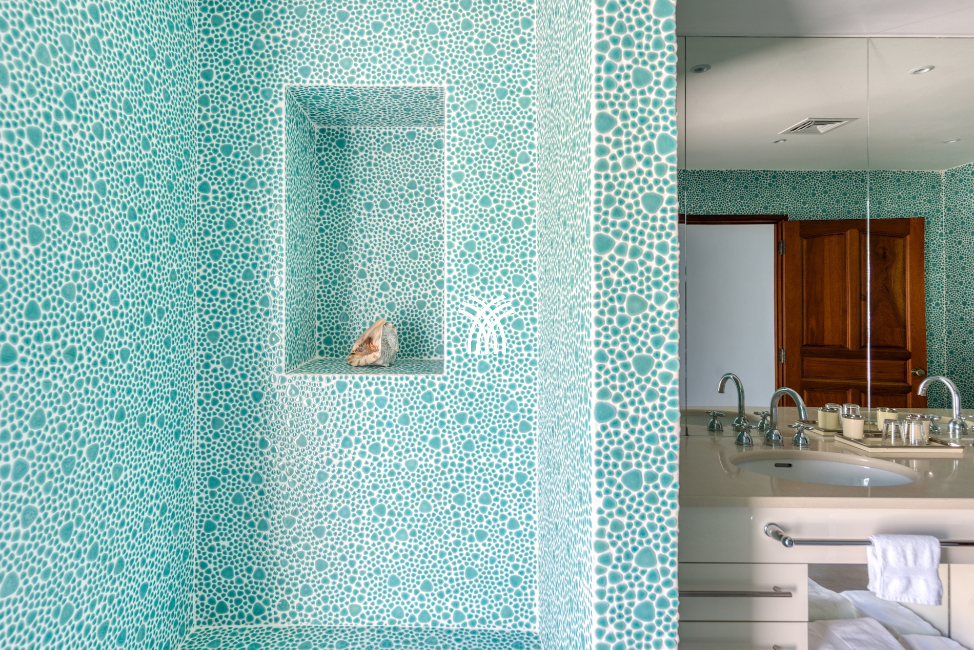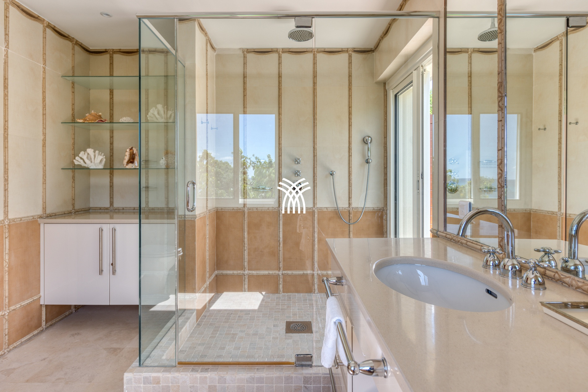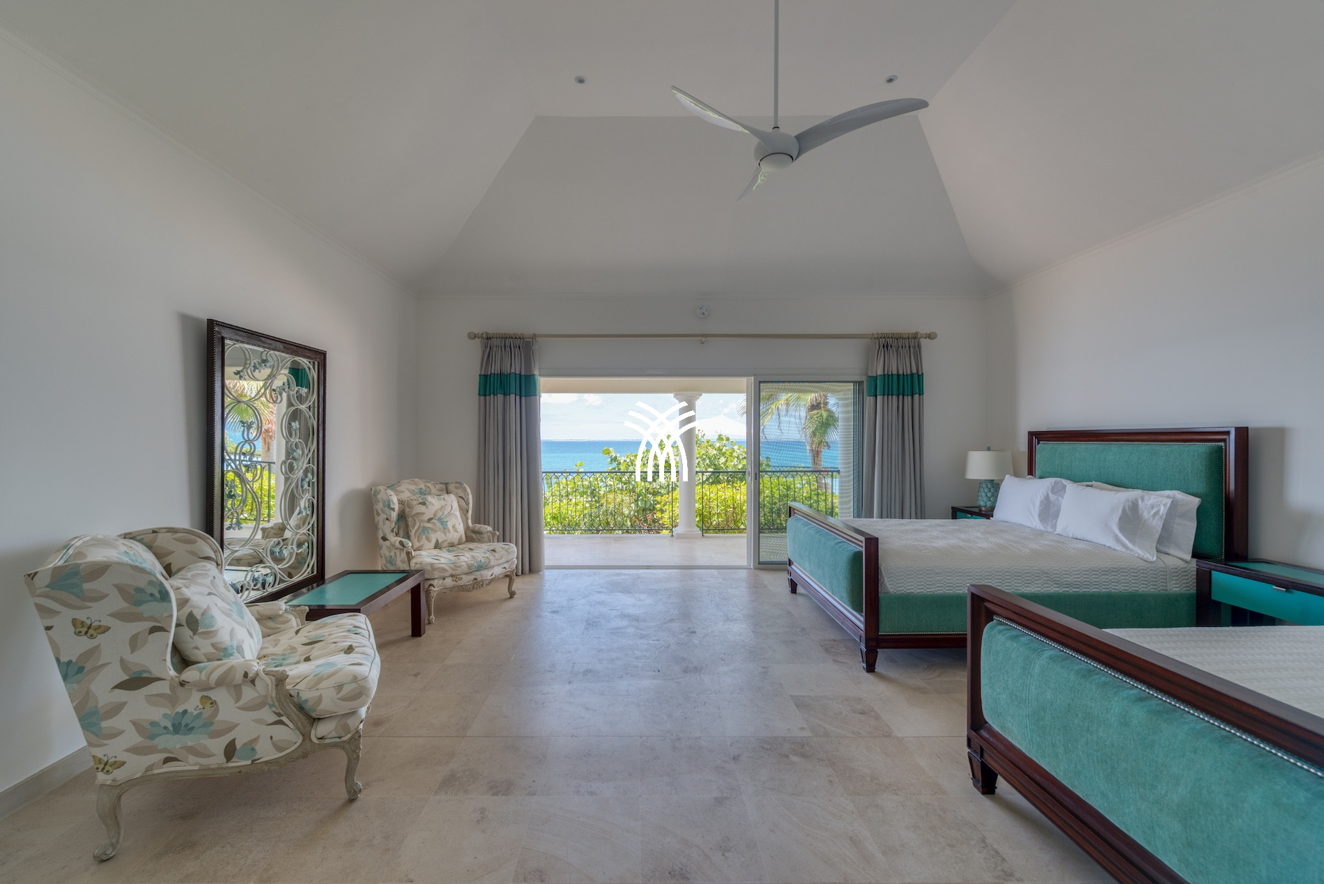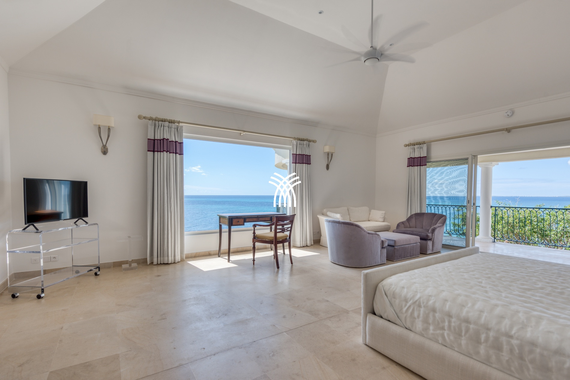 Four bedrooms of equal size have a view of the Caribbean Sea and are at the level of the pool terrace. The 5th bedroom and its ensuite bathroom are on the lower level with views of the Caribbean Sea. This bedroom also includes a kitchenette.