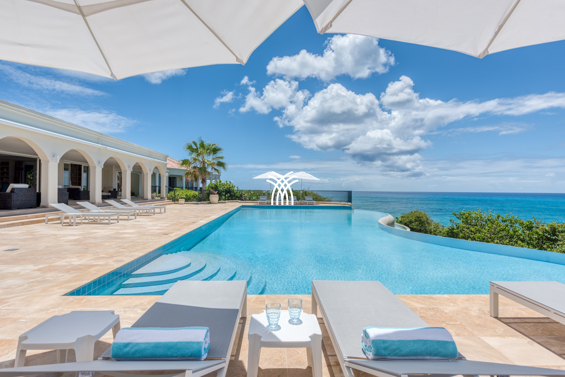 From the entrance, the generous volumes, careful decoration and noble materials infuse a warm and soothing atmosphere. Fully air-conditioned, the villa is organized around a vast luminous living room, a perfectly equipped modern kitchen, and a large outdoor terrace with bar, lounge area and dining space. The heated infinity pool, lined with parasols and sunbeds, overlooks the horizon, offering a stunning view of the ocean. It is heated from 15 October to 15 April, and can be heated outside this period upon request (350 USD/week).