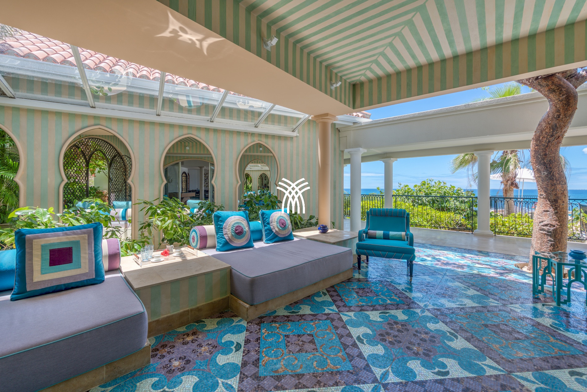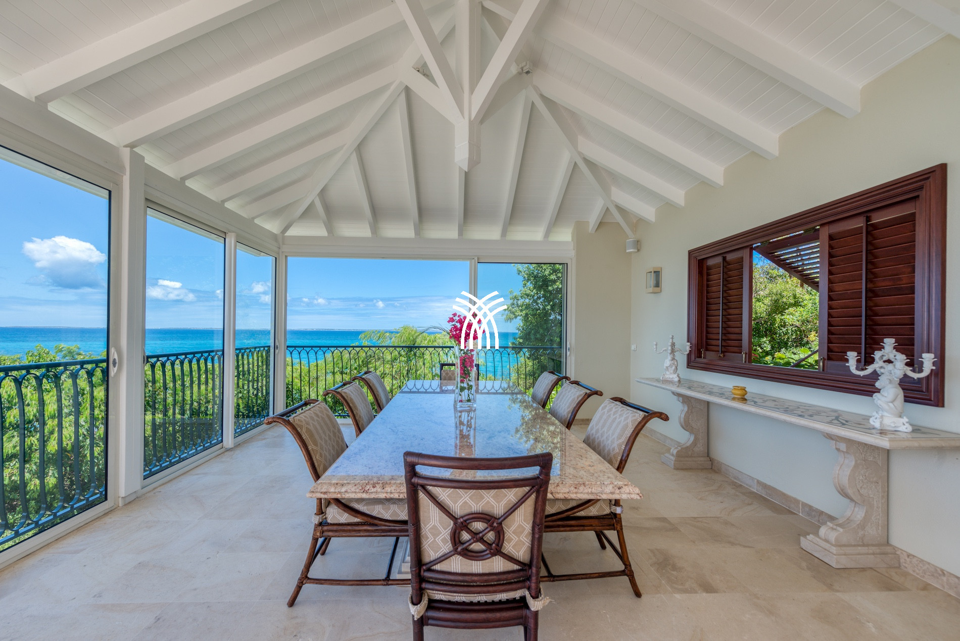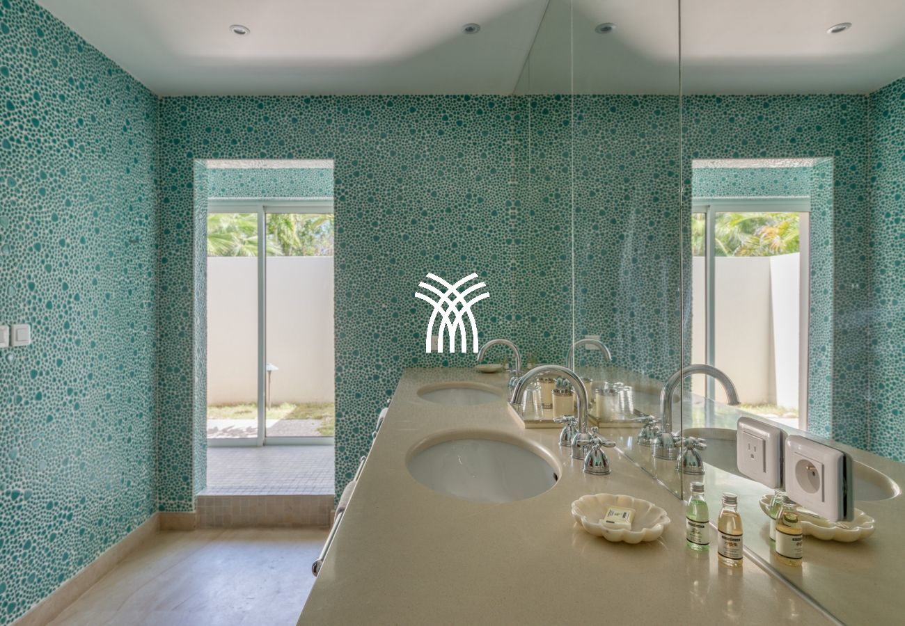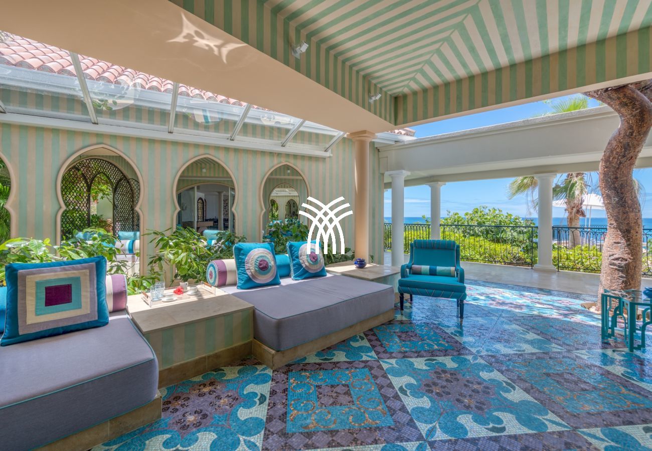 The exterior of this luxury villa for rent in Saint Martin is a true haven of peace. The large terrace with an outdoor lounge inspired by Moroccan design, an infinity pool, and an outdoor dining area allows you to fully experience the Caribbean art of living, between relaxation and conviviality.