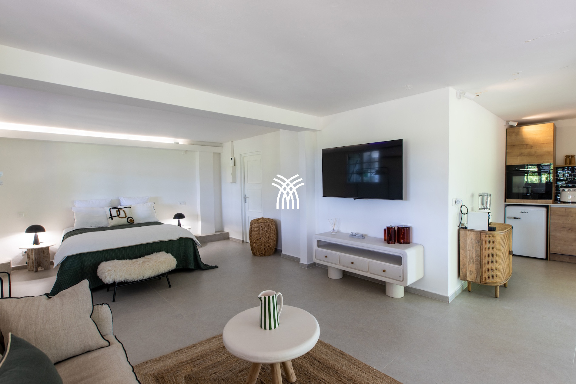 The fourth room, a true independent cocoon, is located on the lower level of the villa. Accessible by a charming path along the house, it enjoys its own private terrace and a decorative basin with magnificent koi carp, offering a space of absolute tranquility.
