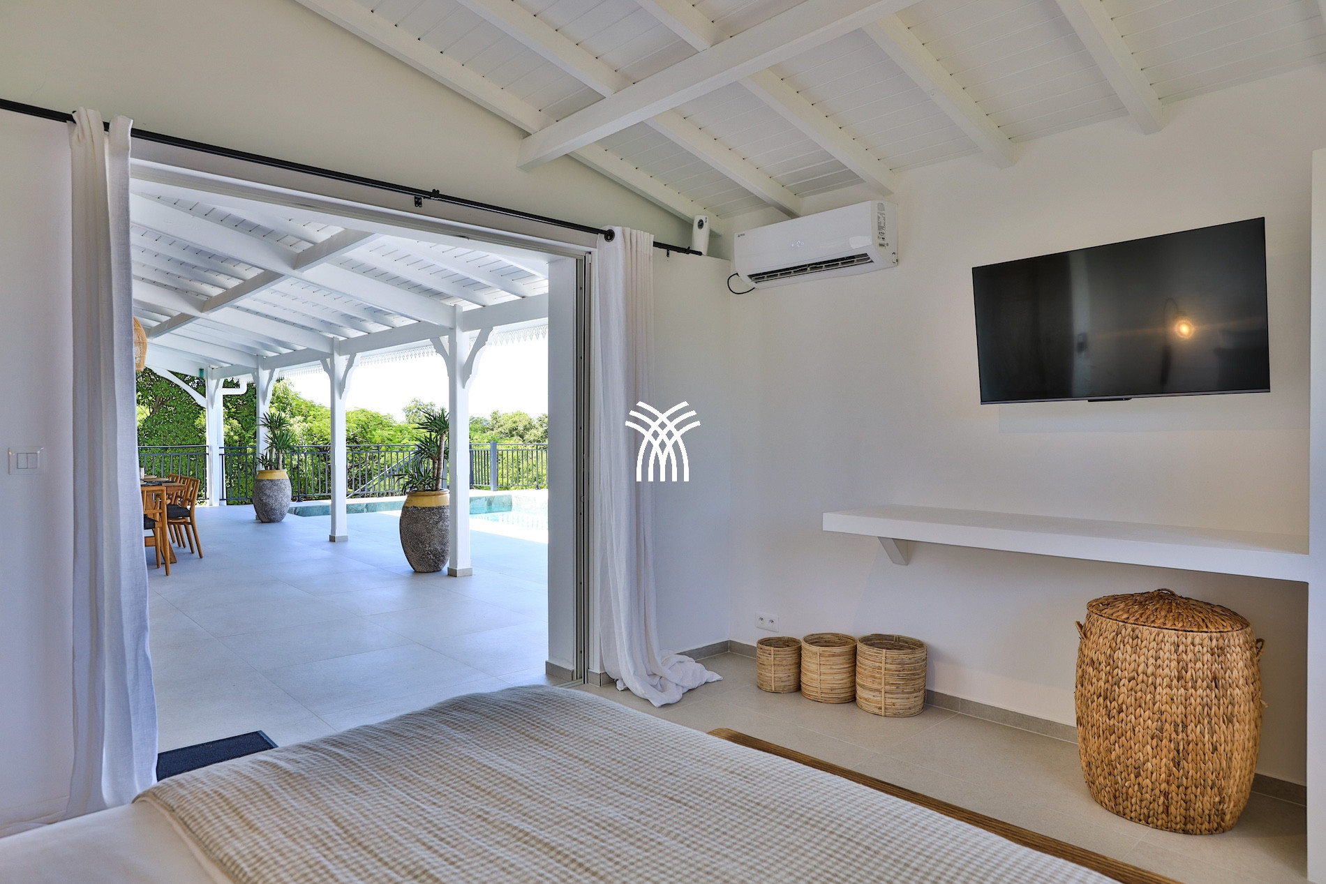 The living spaces of this luxury villa for rent in Saint Martin are designed for comfort and conviviality. You will find a bright double living room: a relaxation area open to the pool and a second cozy living room with television, perfect for family or friends' evenings.