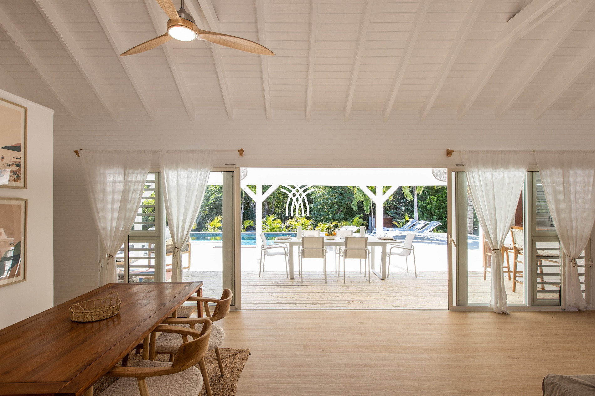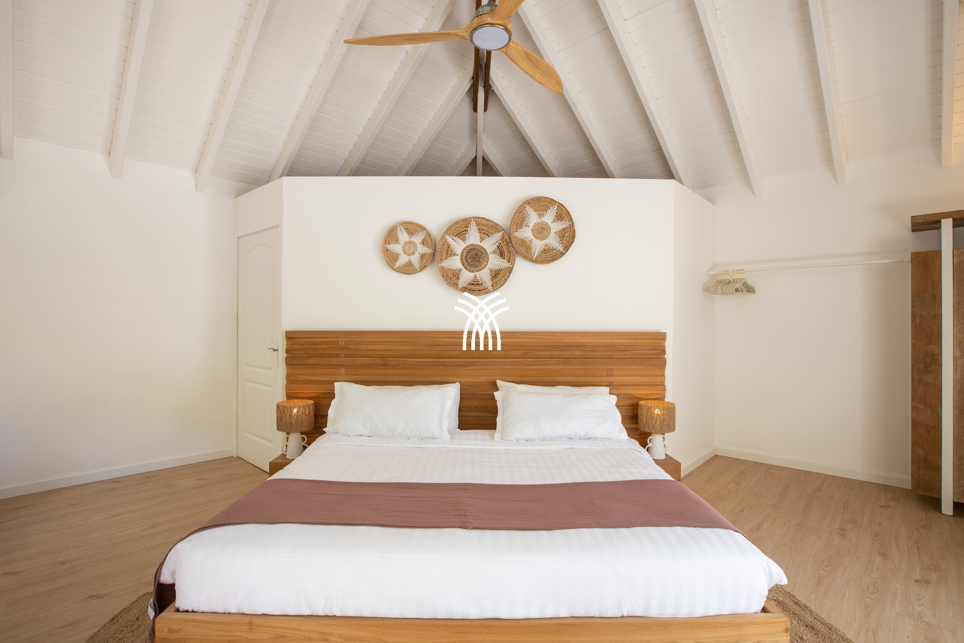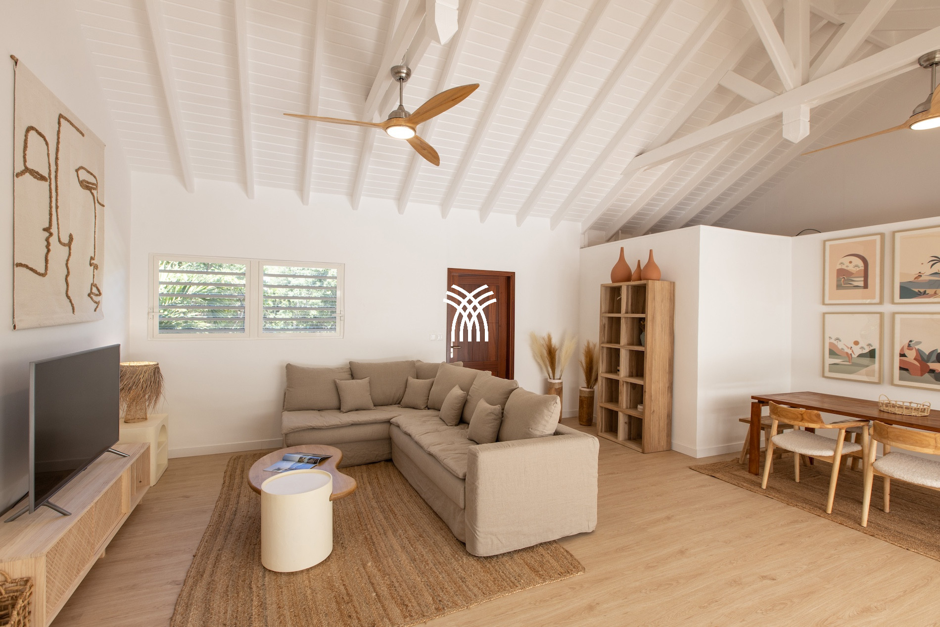 From the moment of arrival, the charm takes effect. Protected by lush vegetation, the property reveals an architecture inspired by the French Caribbean, blending traditional spirit and contemporary touches. The layout with several distinct bungalows, a rare and sought-after signature in the luxury villa rental world of Terres Basses, offers each guest a sense of freedom, calm, and space.