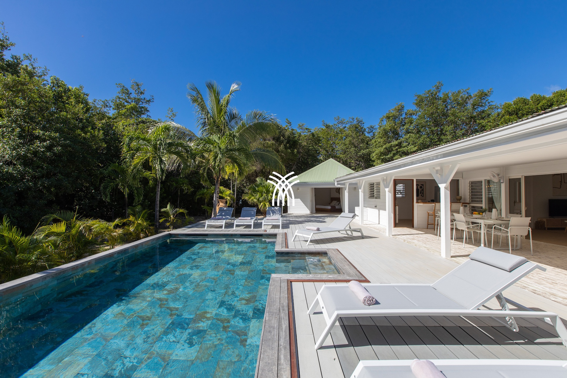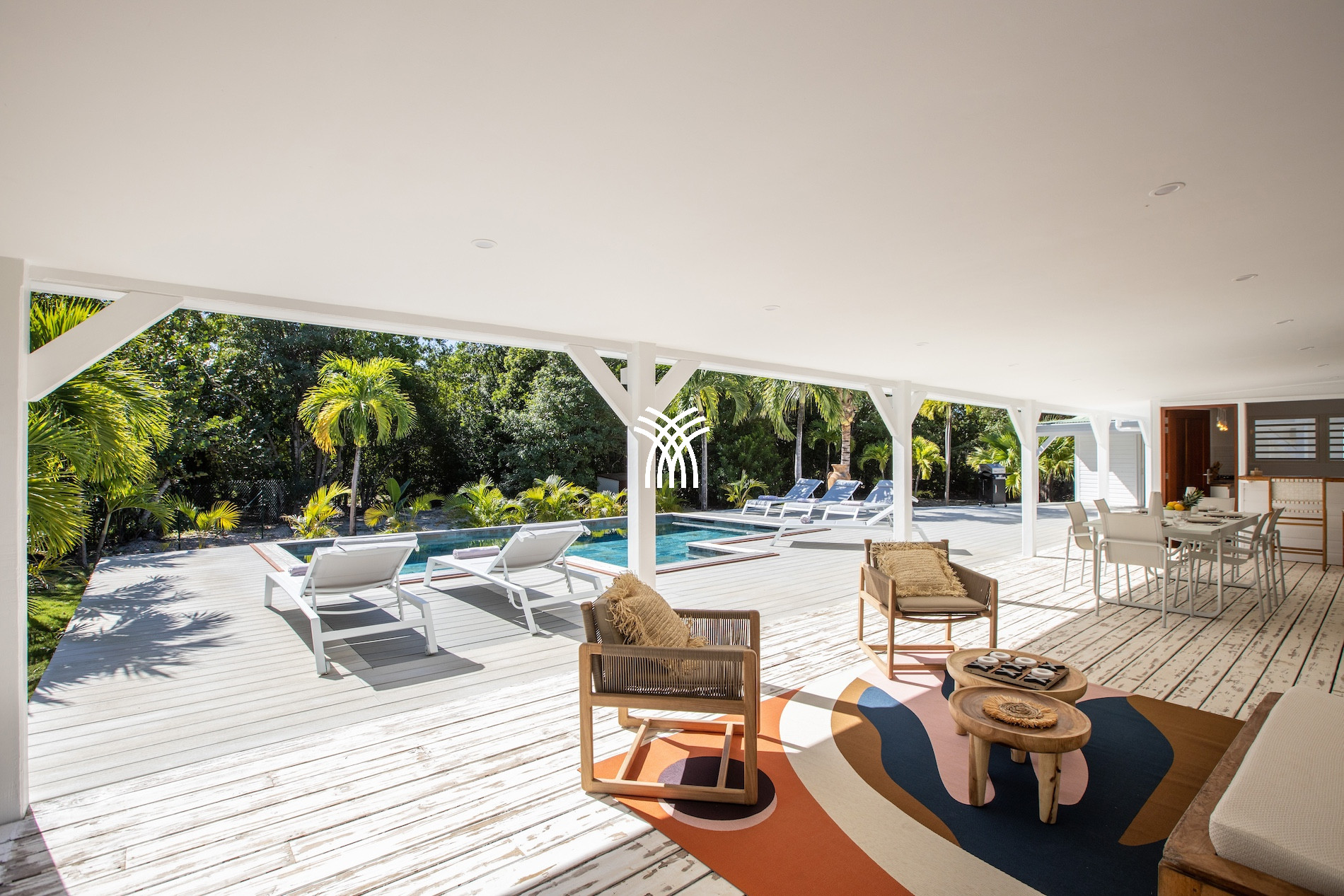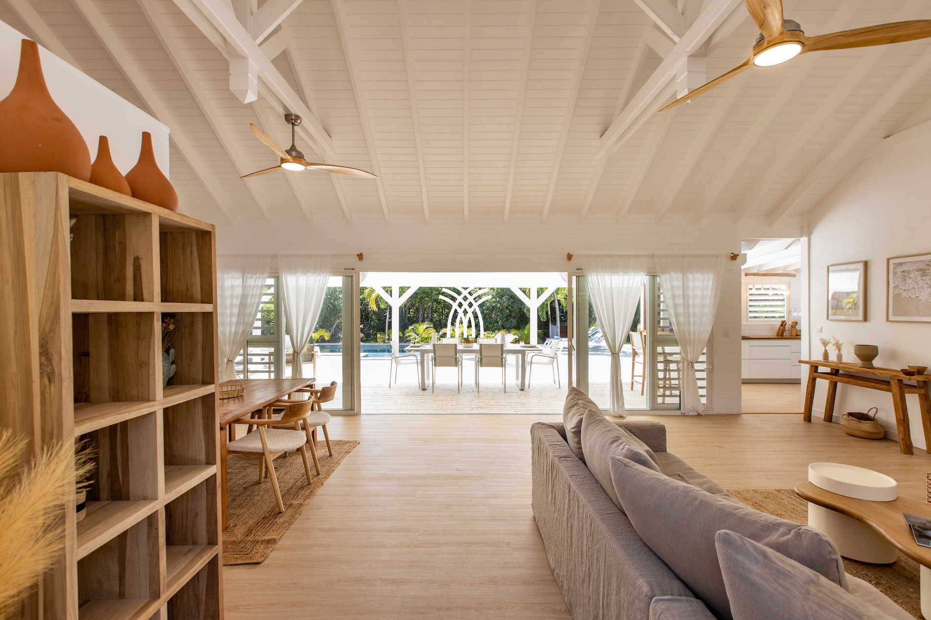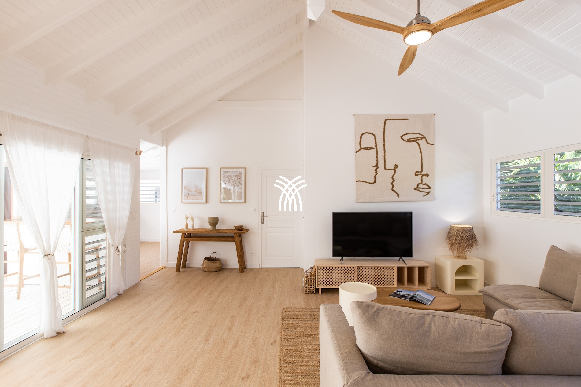 From the moment of arrival, the charm takes effect. Protected by lush vegetation, the property reveals an architecture inspired by the French Caribbean, blending traditional spirit and contemporary touches. The layout with several distinct bungalows, a rare and sought-after signature in the luxury villa rental world of Terres Basses, offers each guest a sense of freedom, calm, and space.