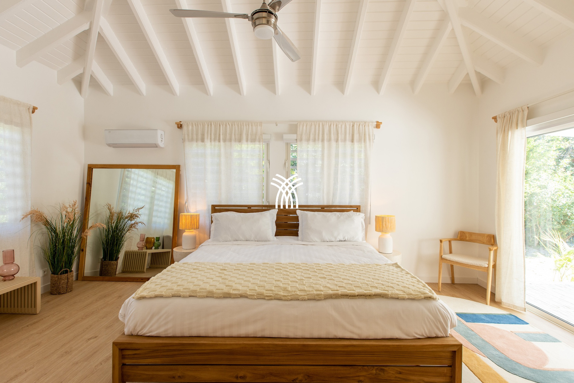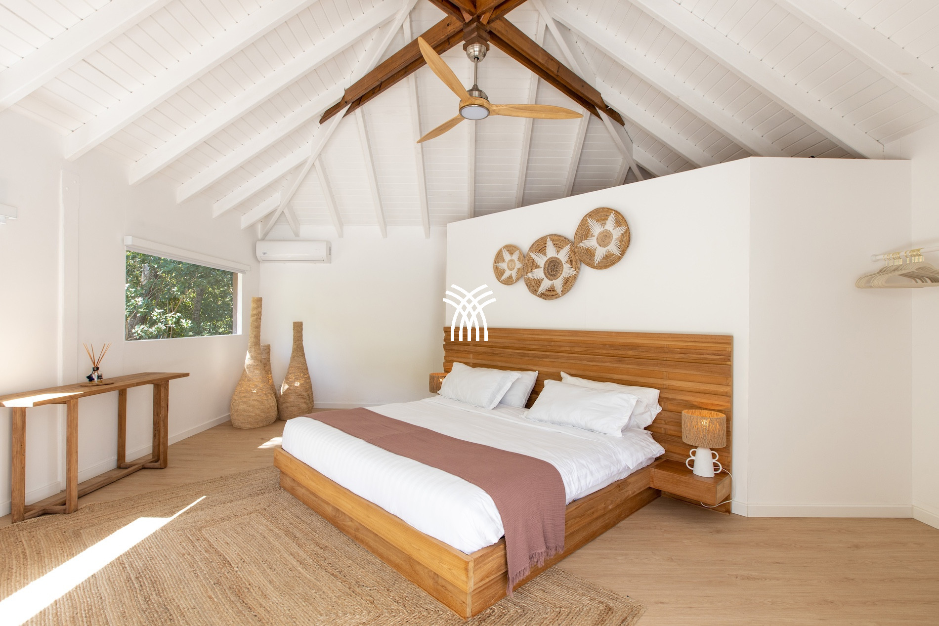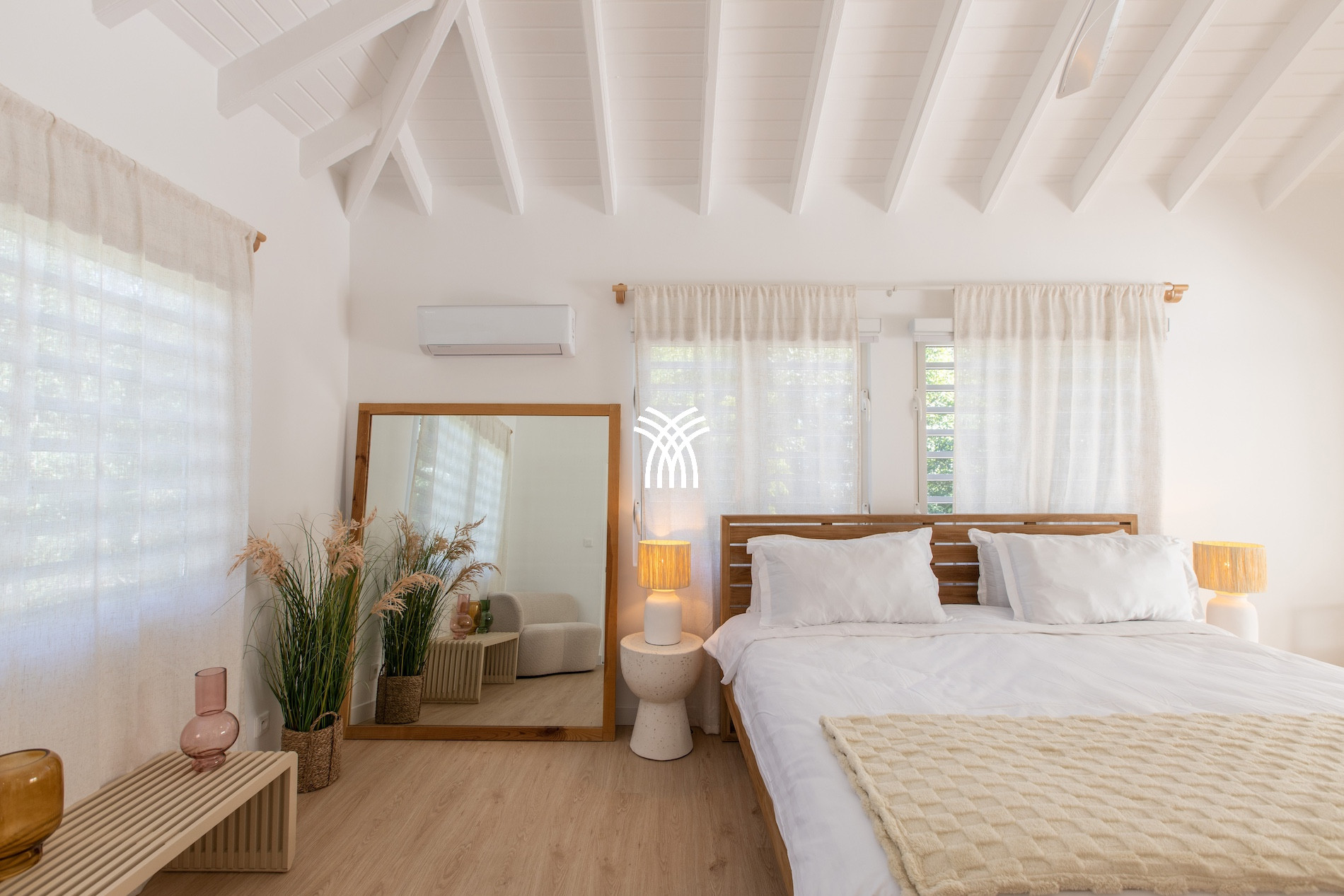 The three rooms of Villa Greystone, all with direct access to the terrace, are distributed in separate units to ensure comfort and privacy for each guest. Decorated with sobriety and elegance, they offer high-end bedding and private bathrooms, ideal for welcoming couples, families or friends in search of serenity. The villa can thus be rented in a two or three bedroom configuration according to your needs, making it a perfectly flexible luxury villa rental in Saint Martin, suitable for all types of stays.
