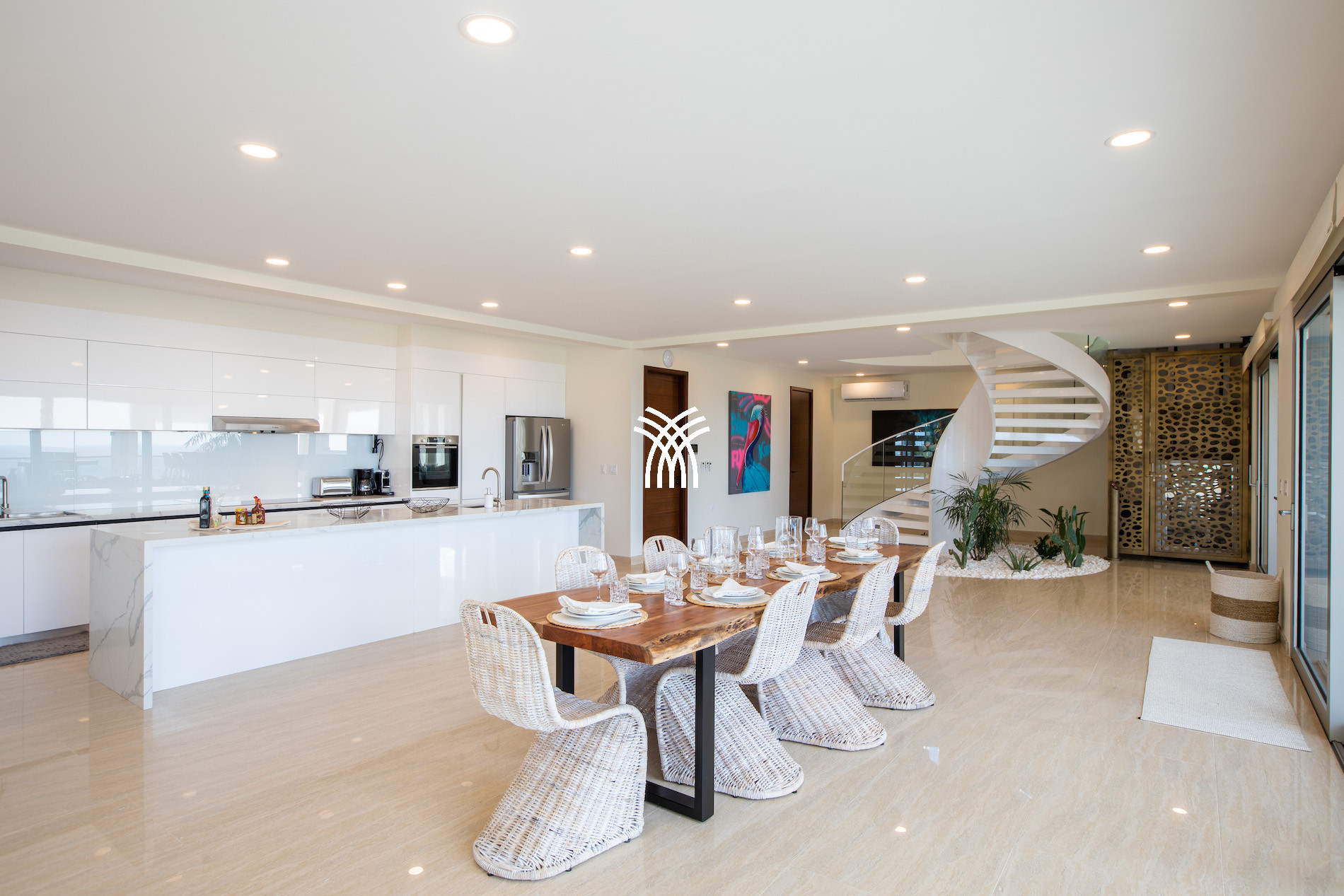 The Villa Aqua Dream is not limited to a simple exceptional residence, it also offers a private gym equipped with the latest technologies to allow guests to maintain their wellness routine while enjoying the paradisiacal setting. The exterior extends to a spacious terrace, with areas dedicated to relaxation and a covered outdoor dining area, ideal for savoring a meal under the stars.
