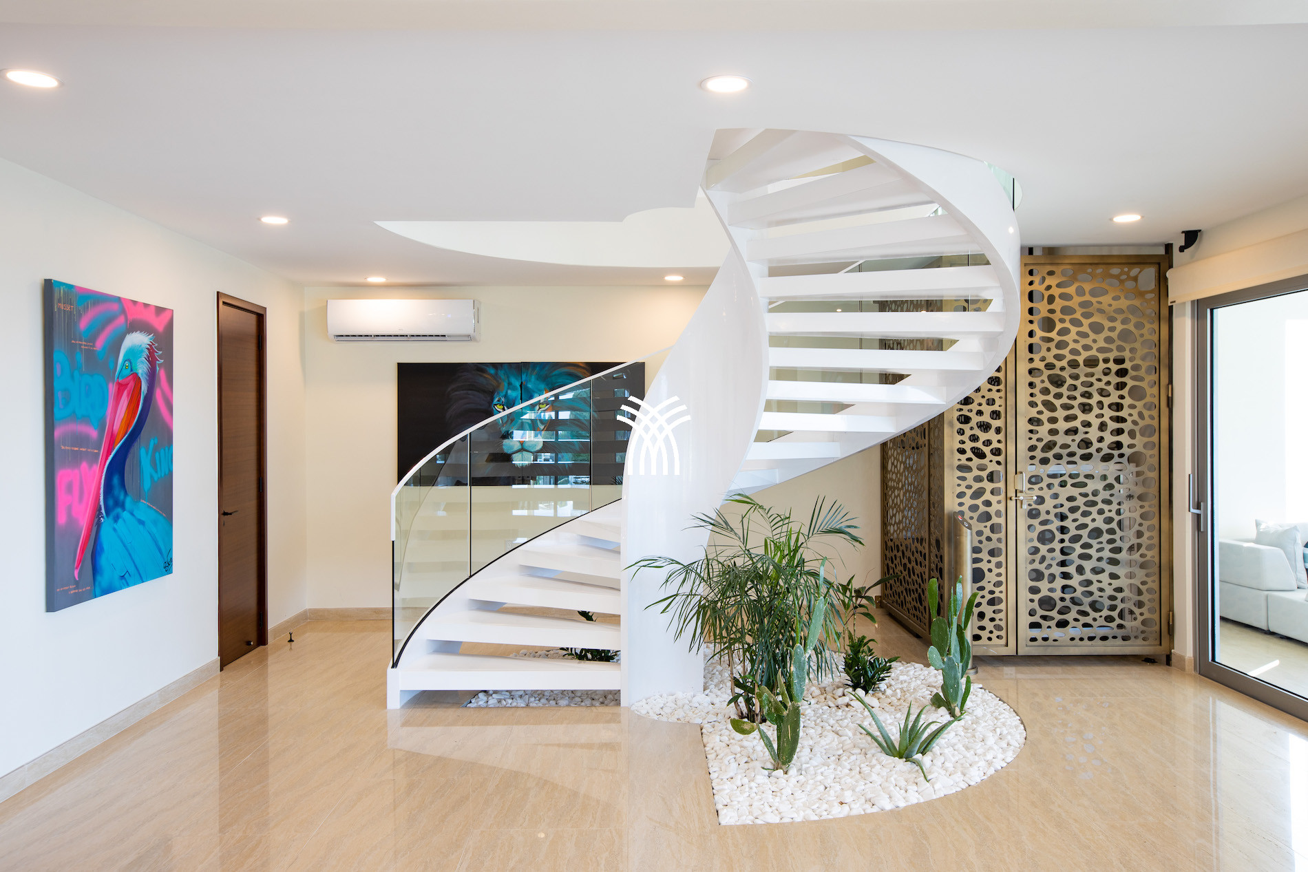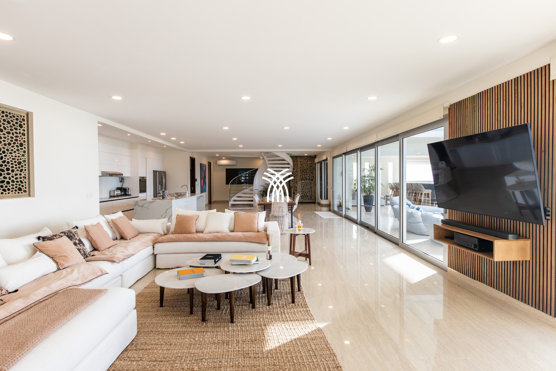 The main living space is located on the lower level, accessible by a beautiful spiral staircase or elevator from the entrance hall. This vast, bright, and air-conditioned living room opens onto a large outdoor terrace, an infinity pool with sea view, and a comfortable lounge area.