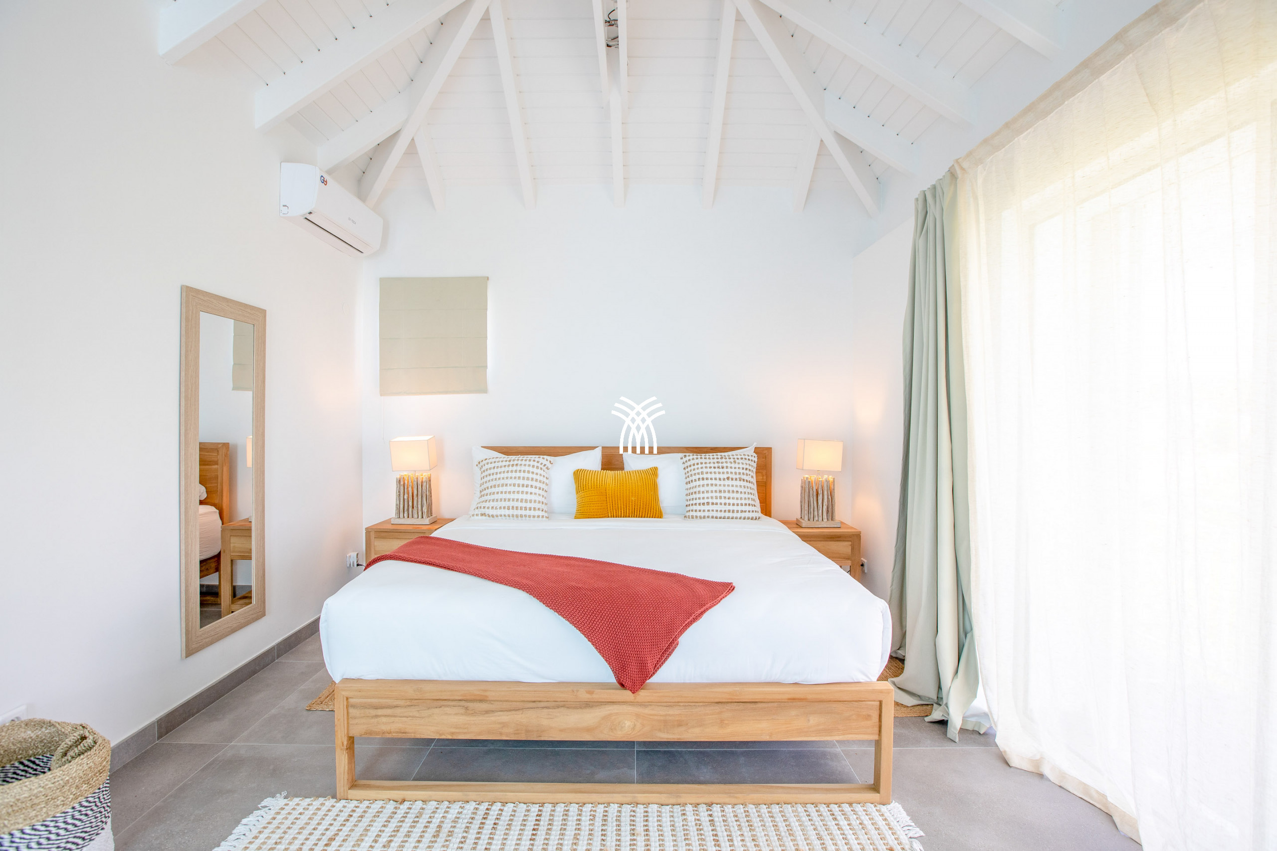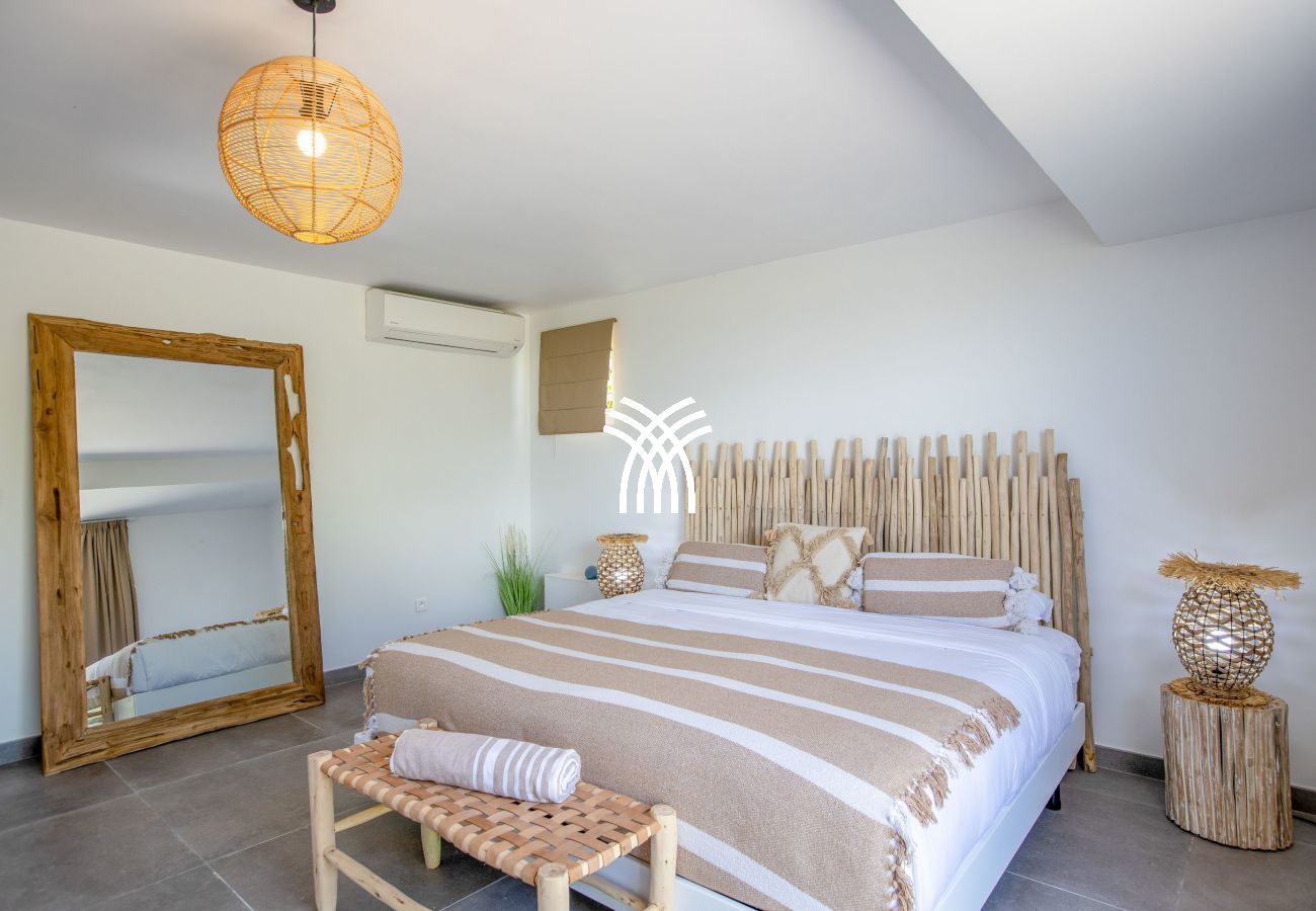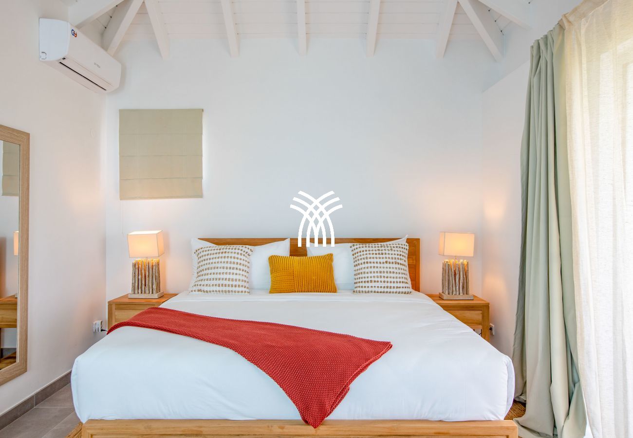 Inside, this luxury villa for rent in Saint-Martin reveals a spacious and refined living space, tastefully decorated in warm tones. High-end furniture and modern amenities ensure optimal comfort. Villa Amber has four air-conditioned bedrooms, each with its private bathroom, guaranteeing privacy and well-being for all guests. Three bedrooms, including the main suite, open directly onto the terrace and pool. The fourth bedroom, located on the lower floor with independent access, is an ideal space for those seeking more privacy.
