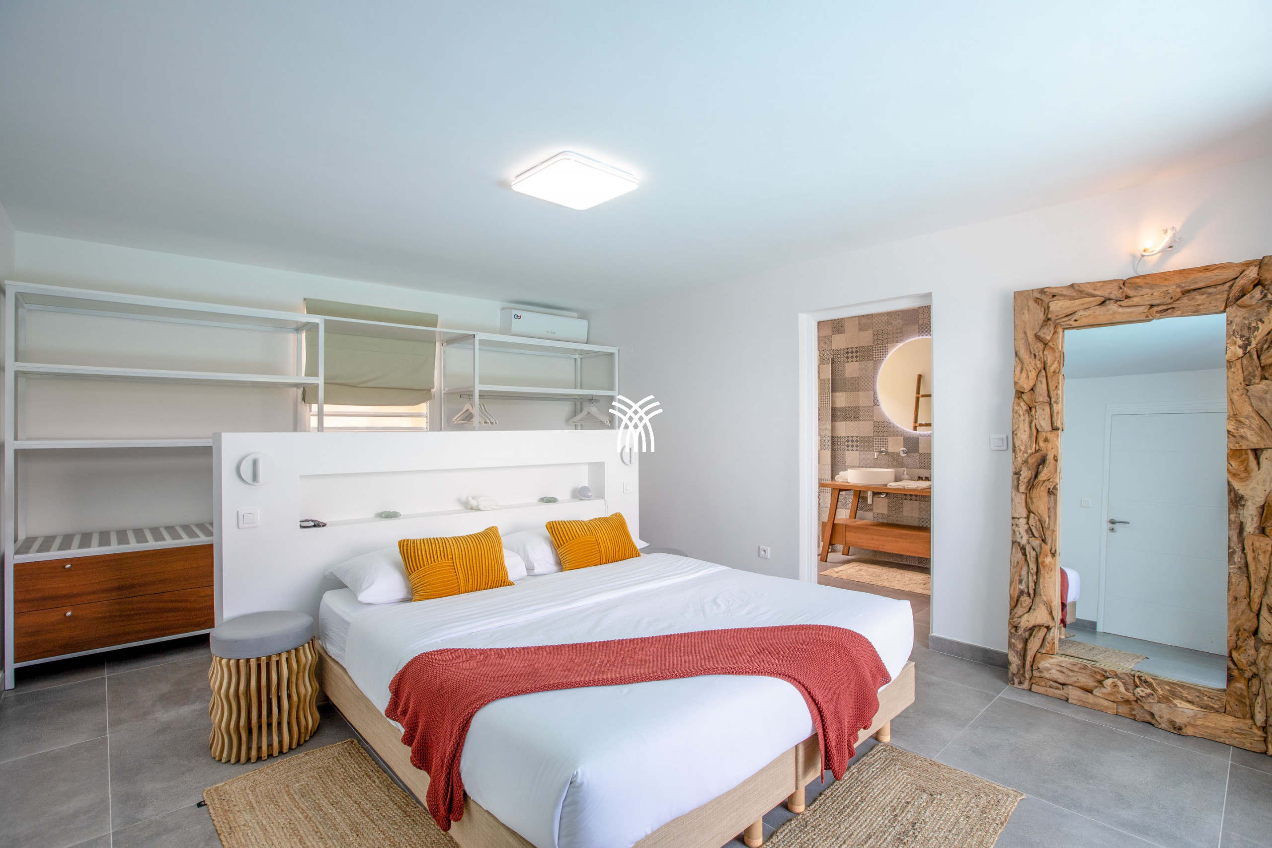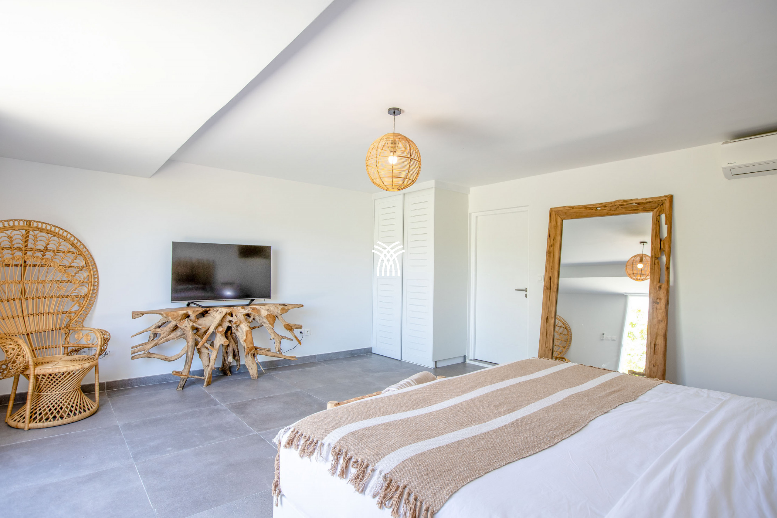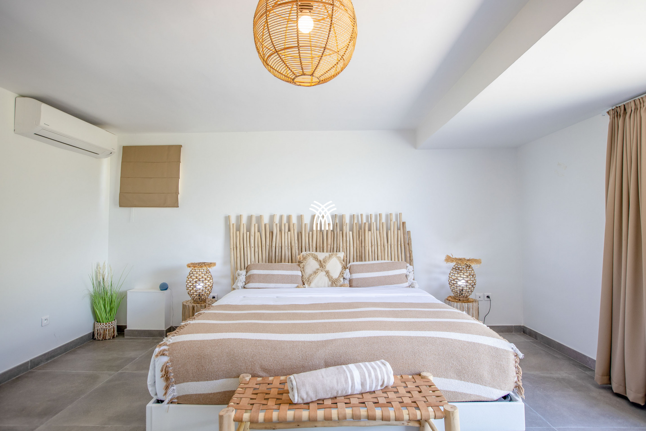 Inside, this luxury villa for rent in Saint-Martin reveals a spacious and refined living space, tastefully decorated in warm tones. High-end furniture and modern amenities ensure optimal comfort. Villa Amber has four air-conditioned bedrooms, each with its private bathroom, guaranteeing privacy and well-being for all guests. Three bedrooms, including the main suite, open directly onto the terrace and pool. The fourth bedroom, located on the lower floor with independent access, is an ideal space for those seeking more privacy.
