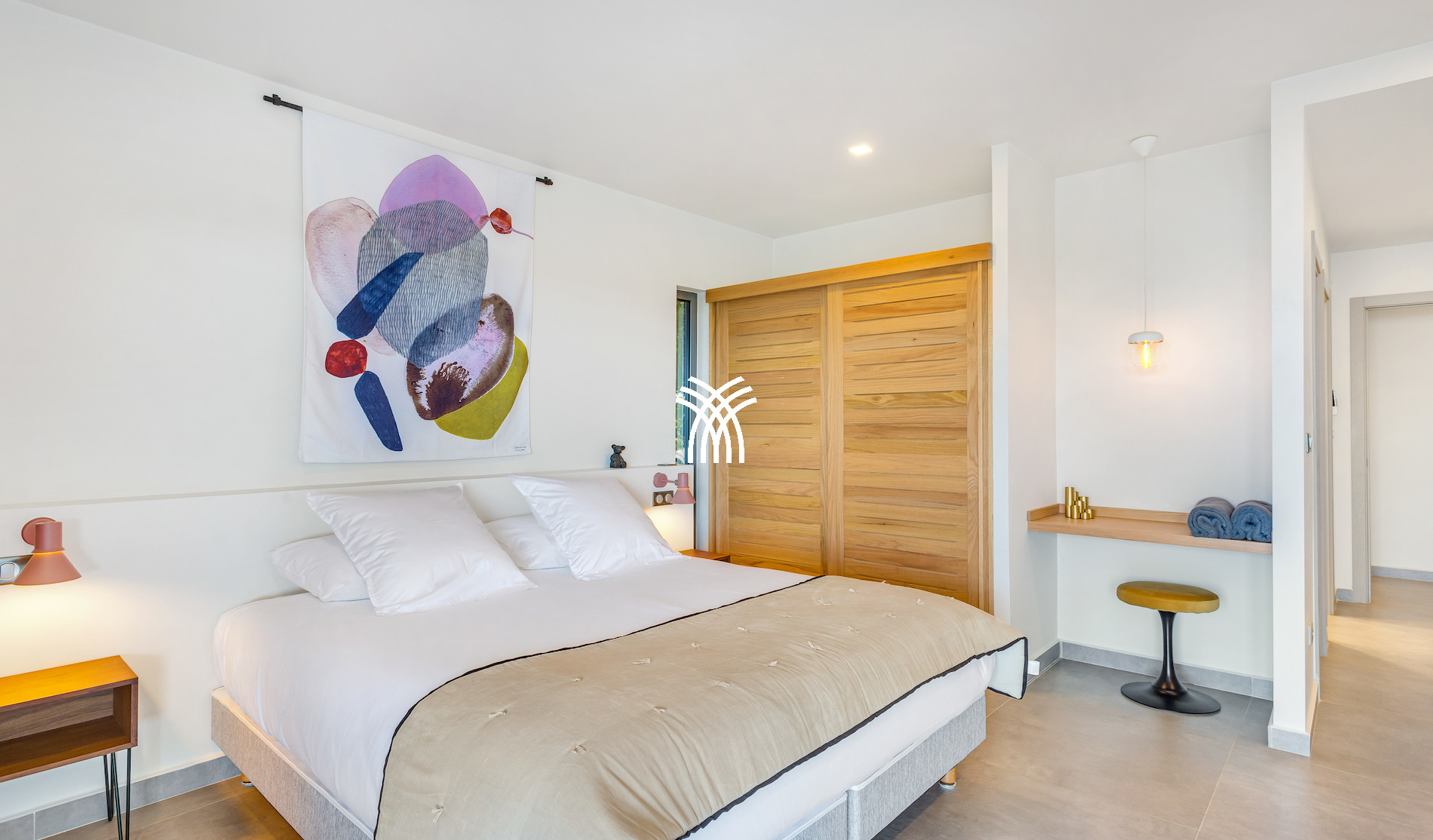 This exceptional villa has 5 bedrooms, all with private bathrooms. Three bedrooms are located on the main level, with direct access to the magnificent infinity pool, ideal for relaxing while facing the sea. The other two bedrooms are located on the lower level, each with an independent external access.