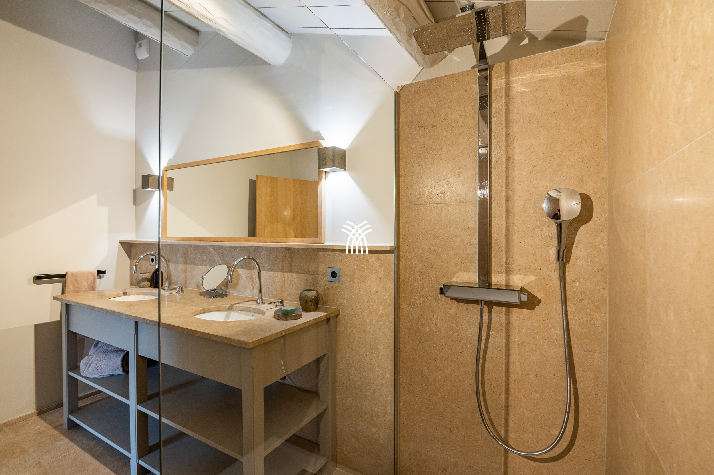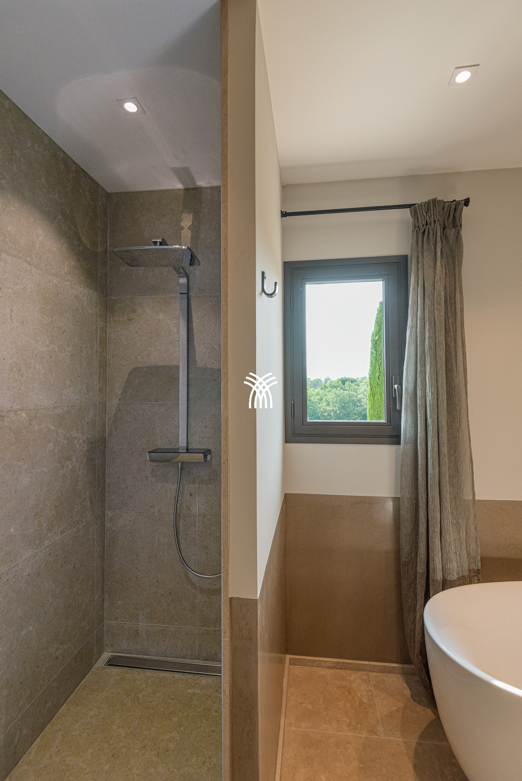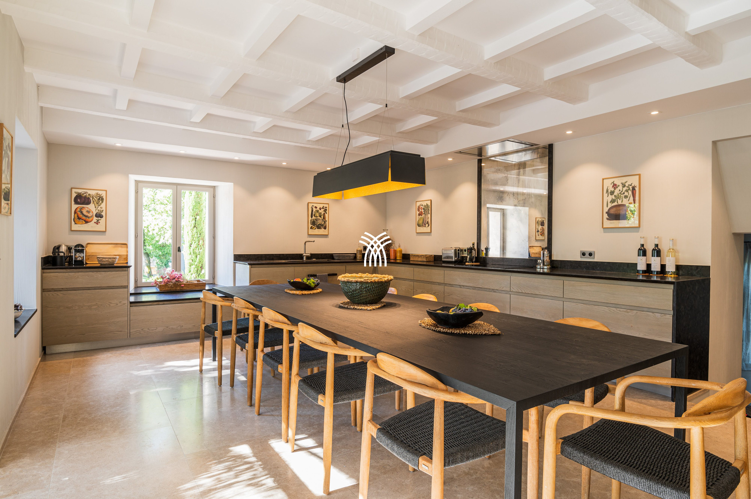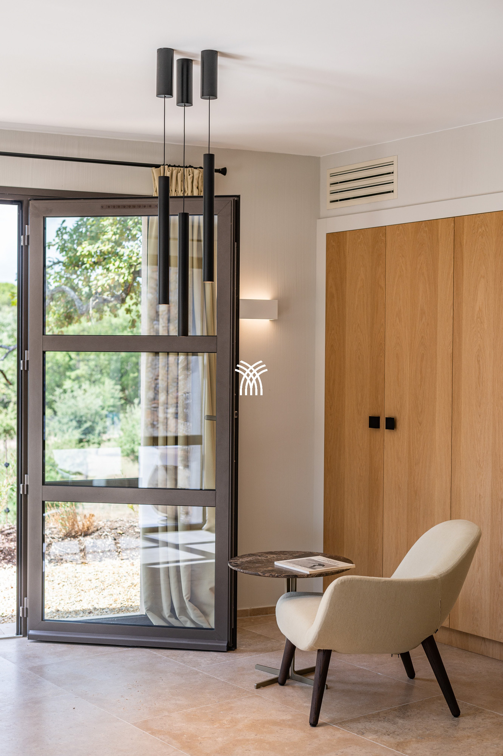 Blending modern sophistication with timeless Provençal charm, the décor gracefully combines wood, metal, and stone, seamlessly integrating with the lush vegetation that surrounds the estate. In this idyllic haven, conviviality defines every moment, whether gathered beneath the shade of a majestic centuries-old oak or enjoying the warmth of thoughtfully designed interiors. A generous kitchen, expansive terraces, and inviting armchairs create the perfect setting to prepare and savor local cuisine, unwind during cool summer evenings, or simply reconnect with the tranquility of an unspoiled environment.