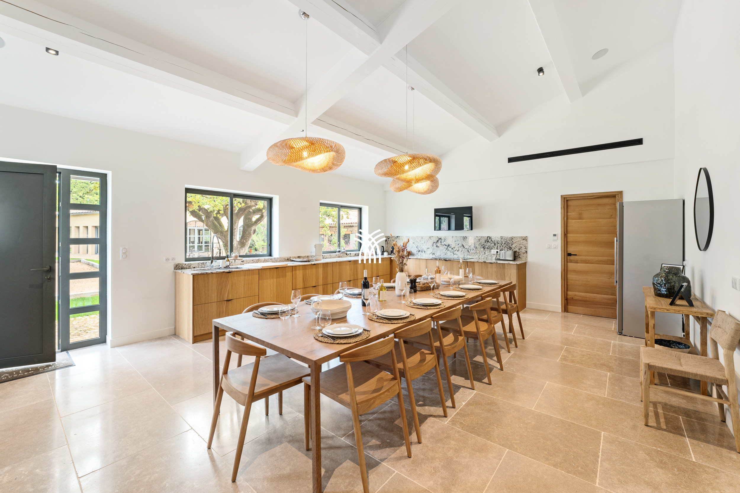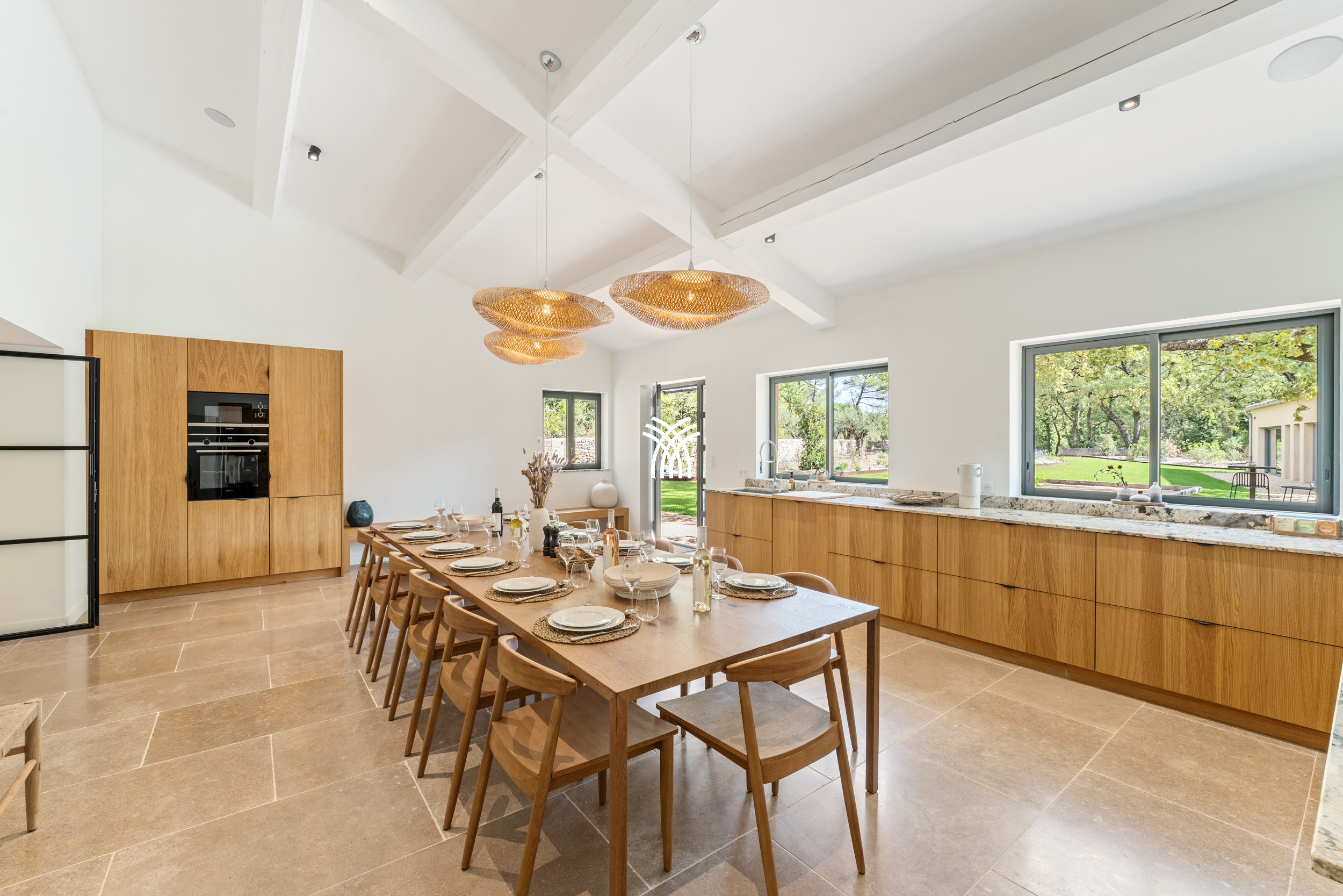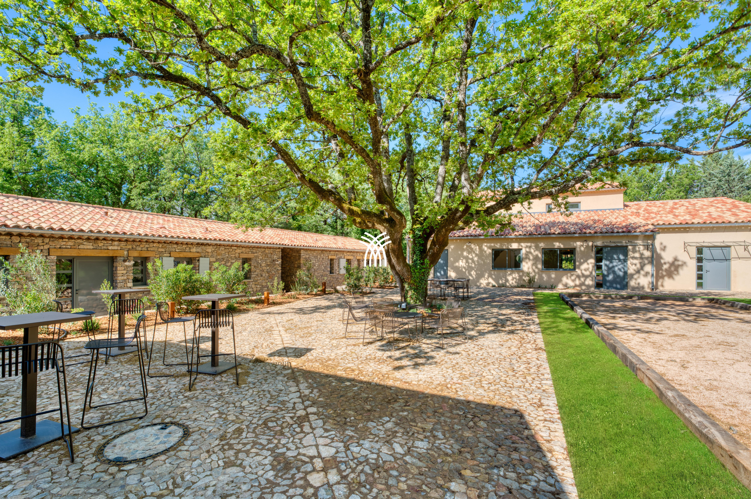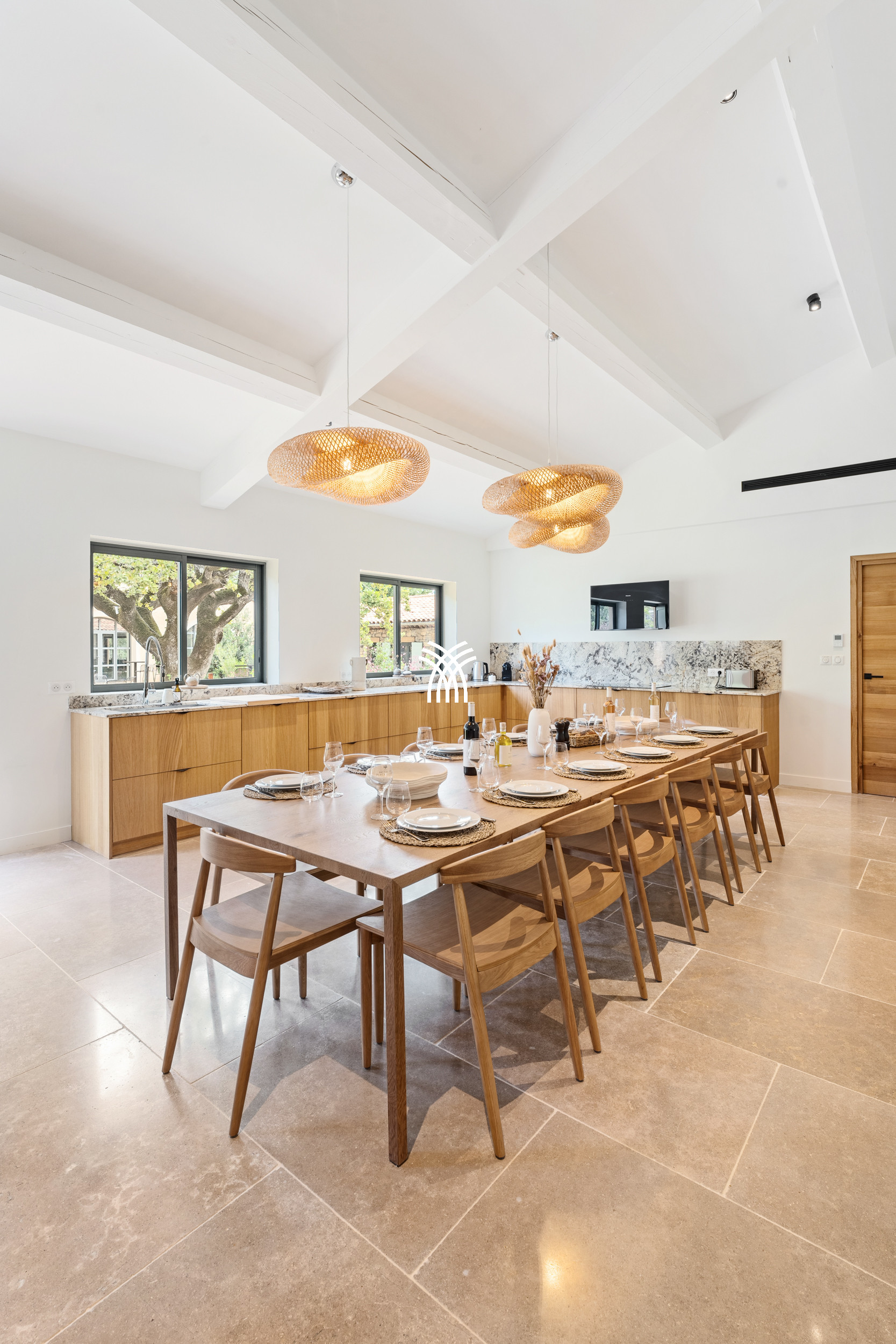 Blending modern sophistication with timeless Provençal charm, the décor gracefully combines wood, metal, and stone, seamlessly integrating with the lush vegetation that surrounds the estate. In this idyllic haven, conviviality defines every moment, whether gathered beneath the shade of a majestic centuries-old oak or enjoying the warmth of thoughtfully designed interiors. A generous kitchen, expansive terraces, and inviting armchairs create the perfect setting to prepare and savor local cuisine, unwind during cool summer evenings, or simply reconnect with the tranquility of an unspoiled environment.