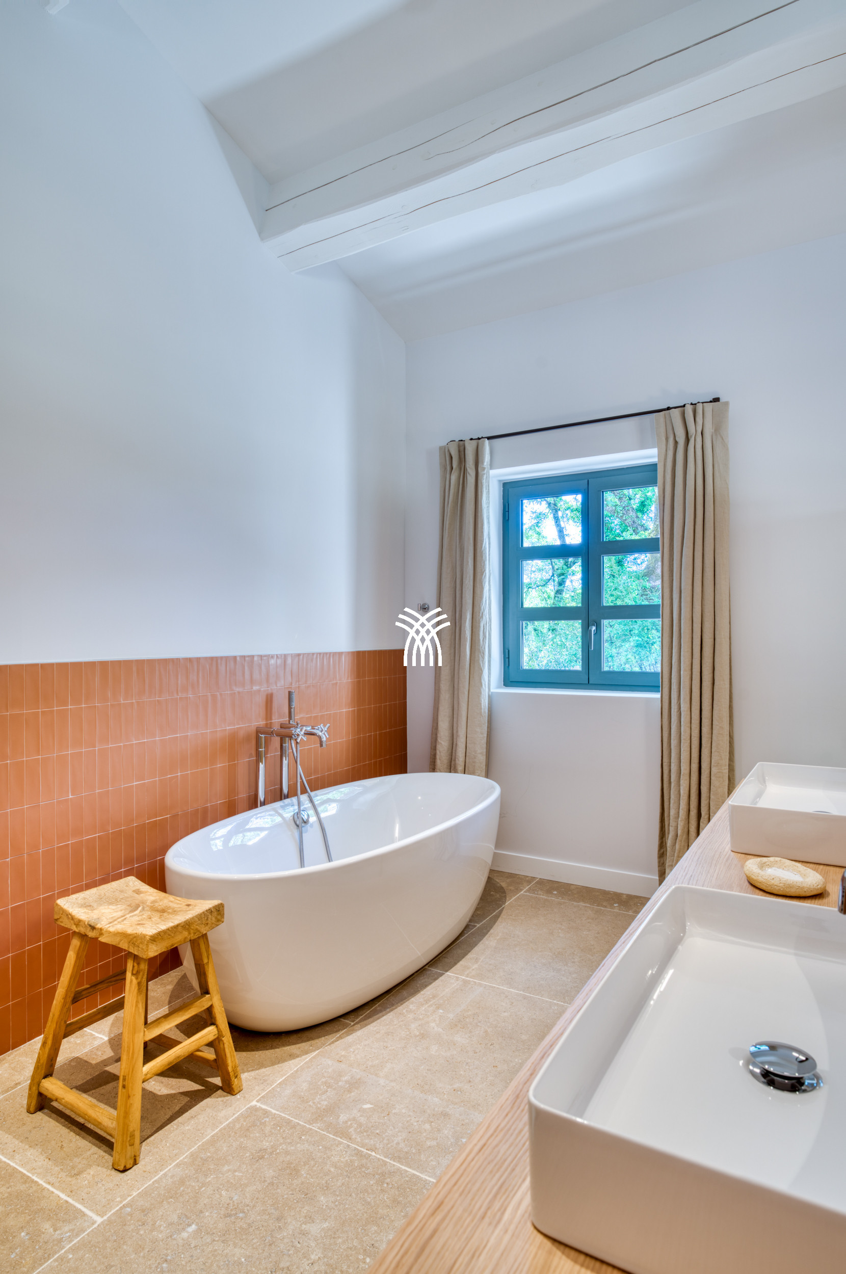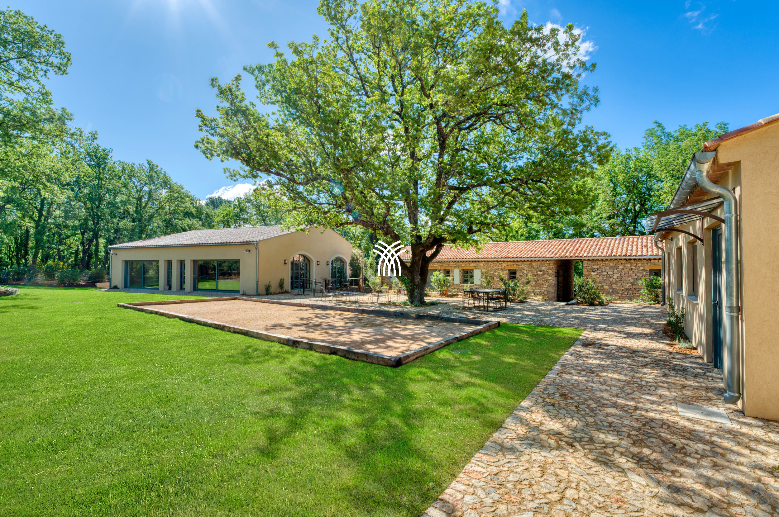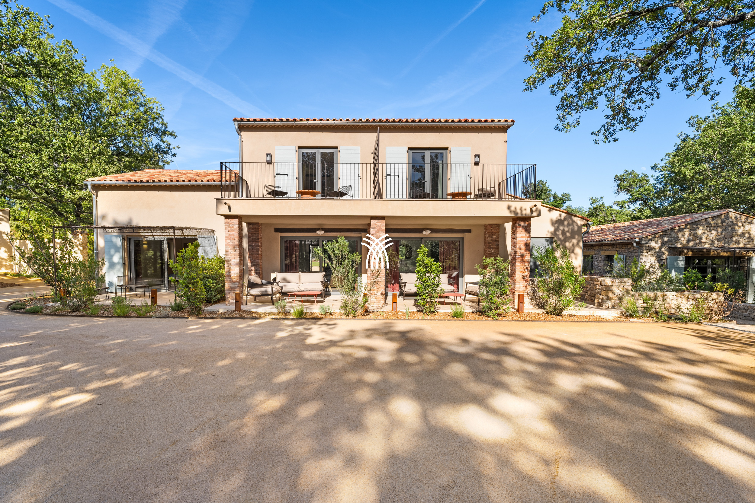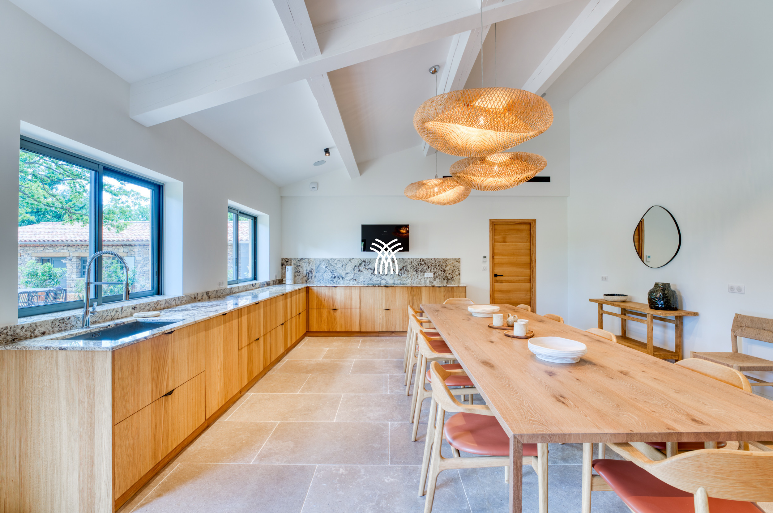 Blending modern sophistication with timeless Provençal charm, the décor gracefully combines wood, metal, and stone, seamlessly integrating with the lush vegetation that surrounds the estate. In this idyllic haven, conviviality defines every moment, whether gathered beneath the shade of a majestic centuries-old oak or enjoying the warmth of thoughtfully designed interiors. A generous kitchen, expansive terraces, and inviting armchairs create the perfect setting to prepare and savor local cuisine, unwind during cool summer evenings, or simply reconnect with the tranquility of an unspoiled environment.