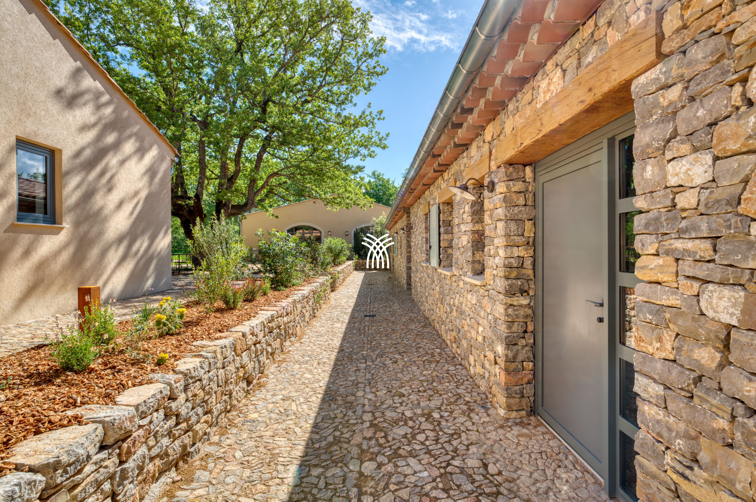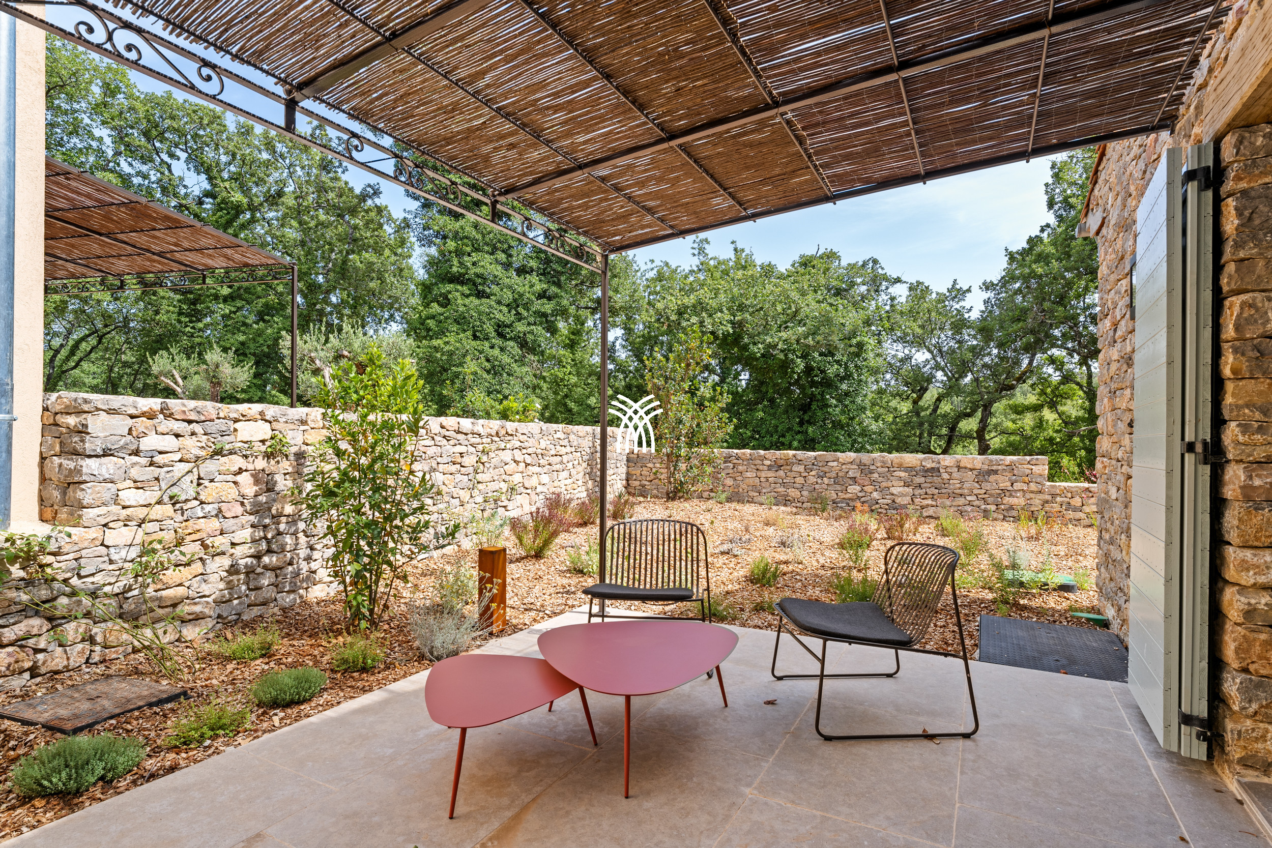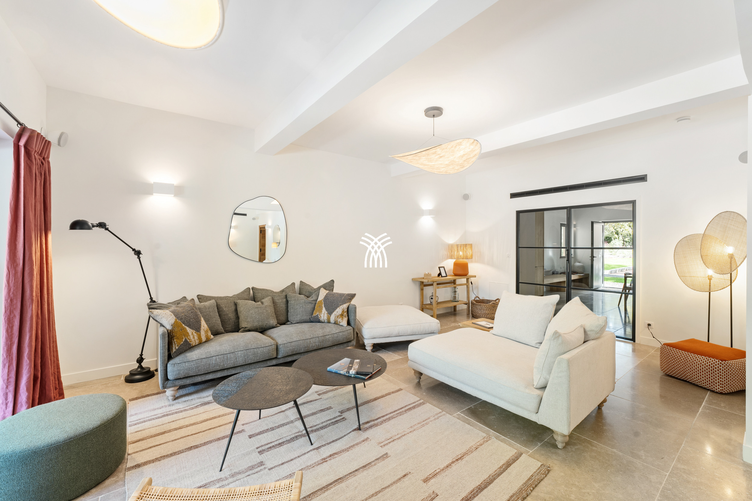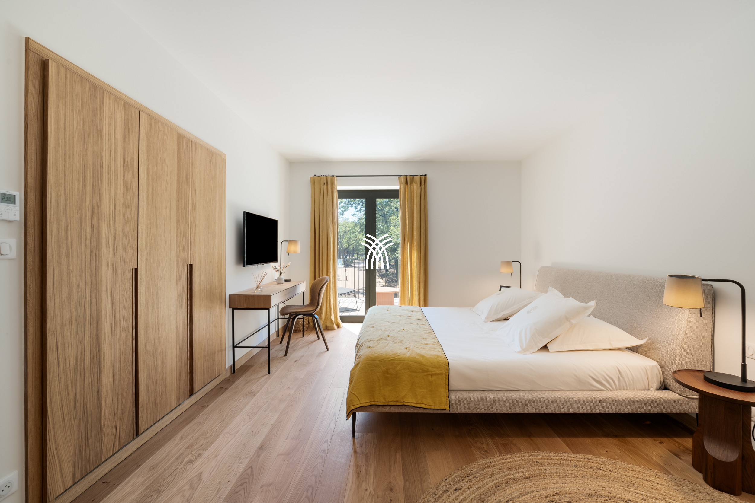 Blending modern sophistication with timeless Provençal charm, the décor gracefully combines wood, metal, and stone, seamlessly integrating with the lush vegetation that surrounds the estate. In this idyllic haven, conviviality defines every moment, whether gathered beneath the shade of a majestic centuries-old oak or enjoying the warmth of thoughtfully designed interiors. A generous kitchen, expansive terraces, and inviting armchairs create the perfect setting to prepare and savor local cuisine, unwind during cool summer evenings, or simply reconnect with the tranquility of an unspoiled environment.