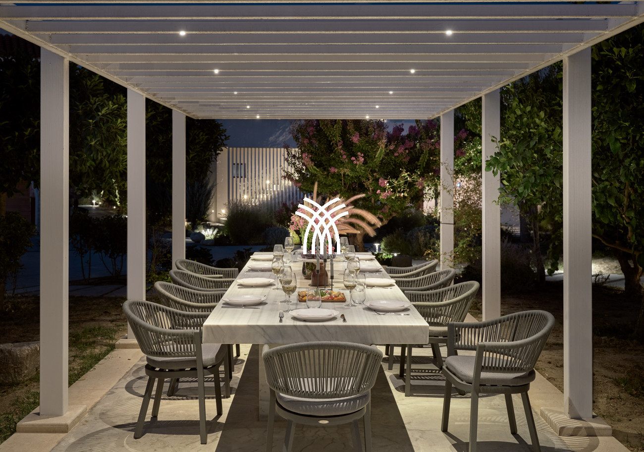 Inside, the villa reveals a design-led aesthetic marked by opulent white marble floors, vibrant accents of colour, and a breezy open-plan sitting and dining space framed by floor-to-ceiling windows that open seamlessly onto the pool terrace, blurring the line between interior elegance and outdoor beauty. Ideal for those seeking a luxury villa rental Greece experience or an unforgettable luxury villa rental Zakynthos escape, this residence captures the essence of sophisticated Mediterranean living in one of the island’s most enchanting coastal settings.