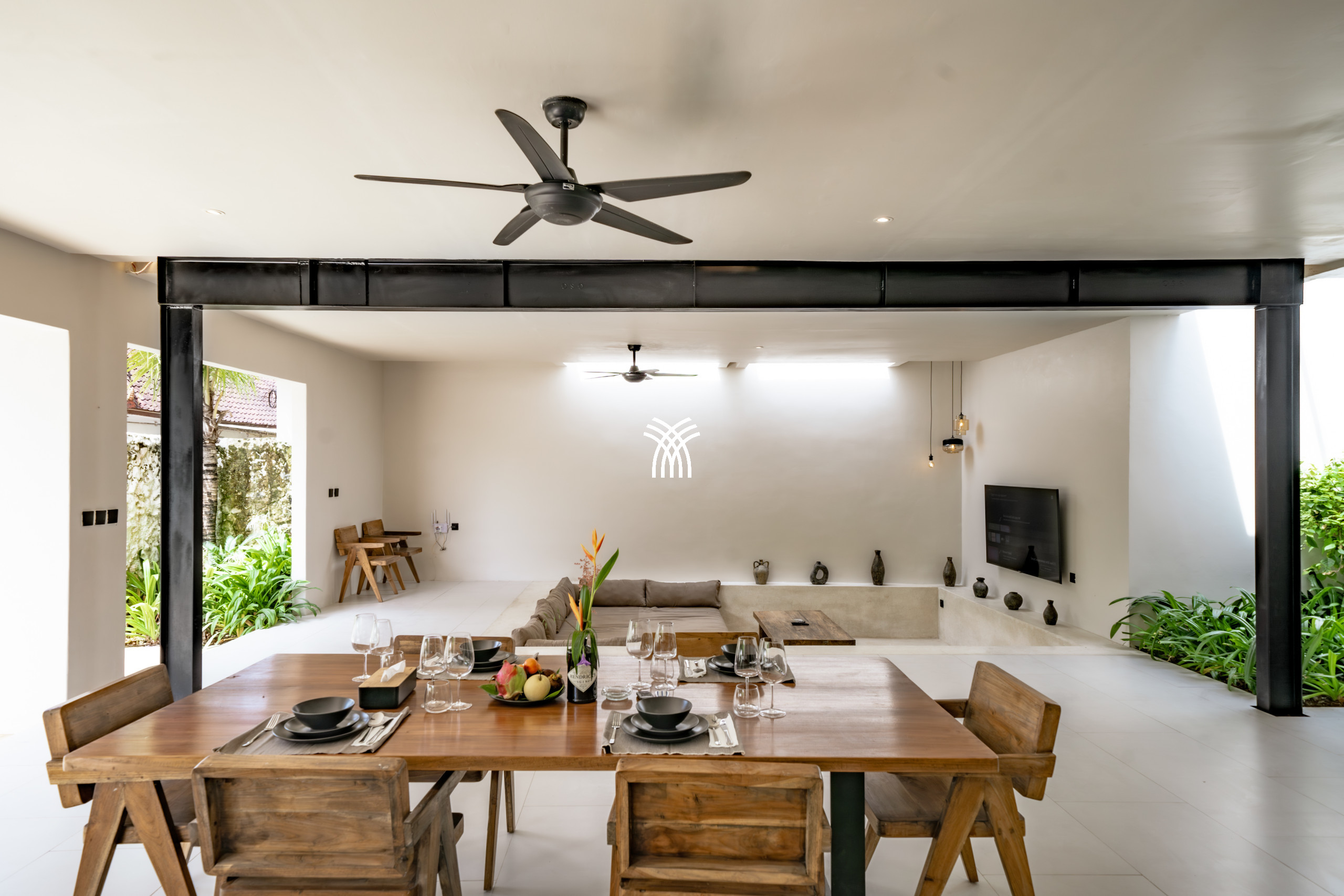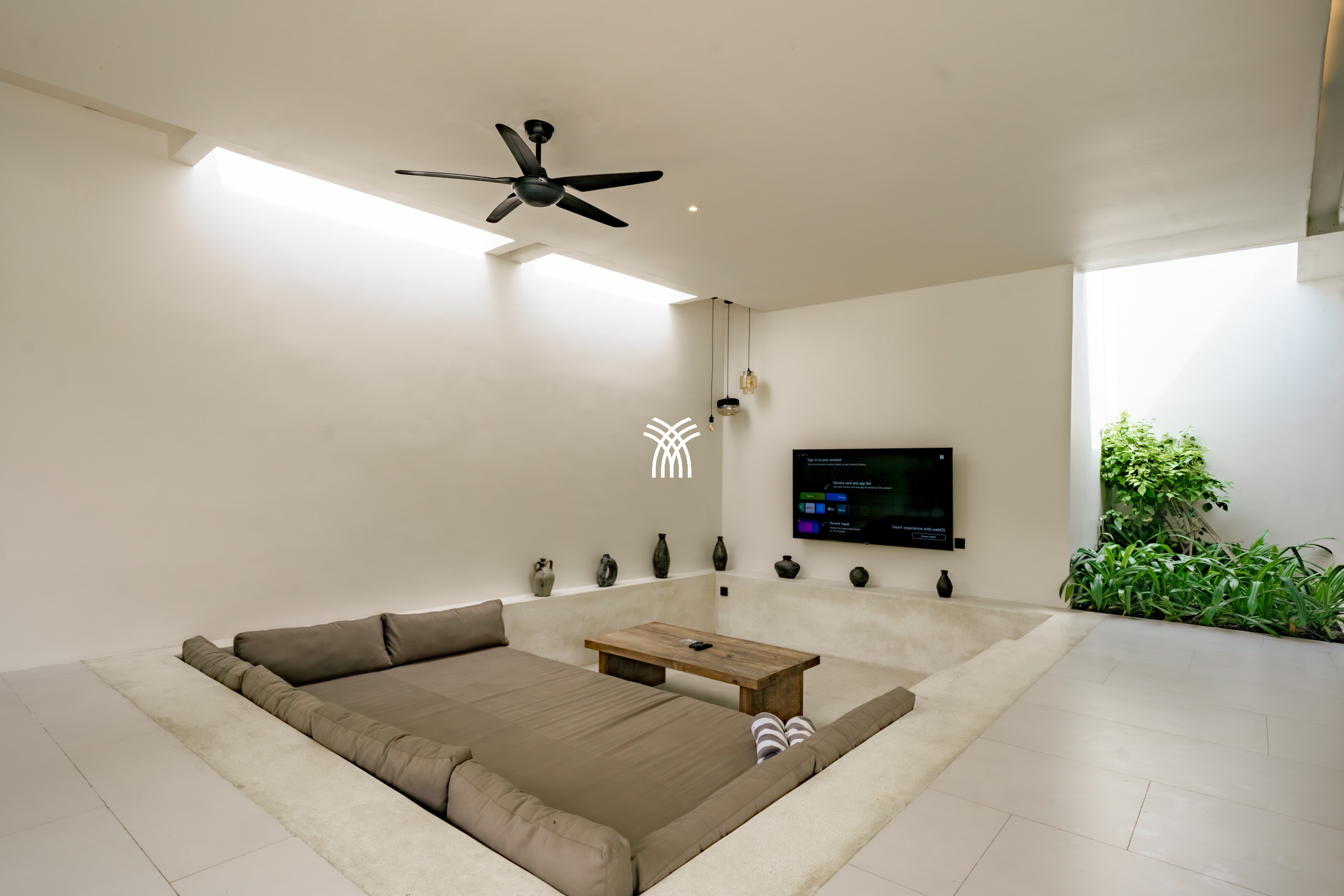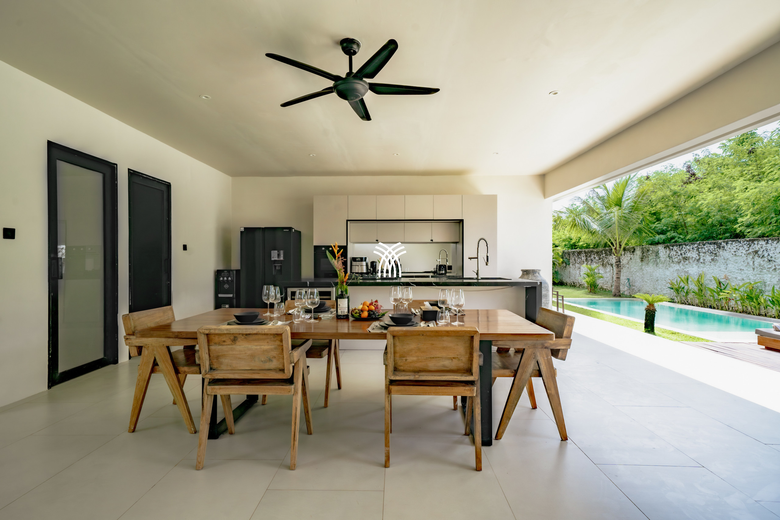 Designed for comfort and effortless living, the villa features three spacious bedrooms with king-size beds, plush linens, and air-conditioning, complemented by elegant bathrooms with modern fittings, rain showers, and hot water. A large private pool and a dedicated kids pool are framed by lush tropical greenery, creating an idyllic setting for sun-soaked relaxation and refreshing moments under Bali’s warm skies. The open-plan living area, enhanced by expansive glass walls, invites natural light to flow seamlessly through the space, while the fully equipped modern kitchen and dining area provide the perfect backdrop for shared meals and memorable gatherings.